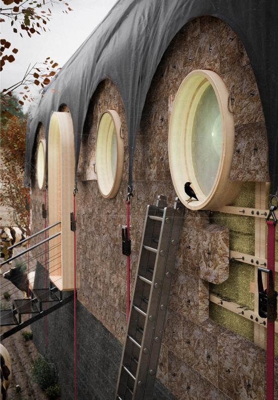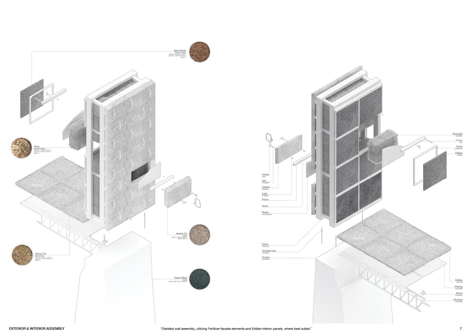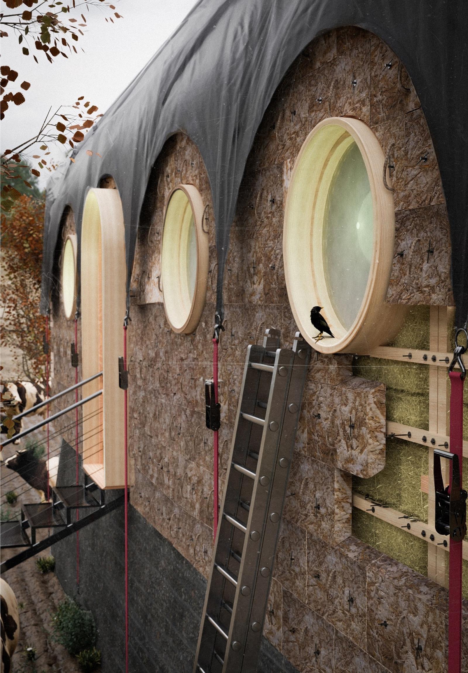 The materials explored create a (temporary) architecture that challenges the idea of construction and fabrication. The resulting buildings are educational outlets whereby visitors can learn techniques for self-production of new building components. Eventually, through a process of disassembly, the components are then returned as livestock feed or fertilizer, from which the material was initially borrowed, meaning zero ‘extraction’ and a true circular economy.