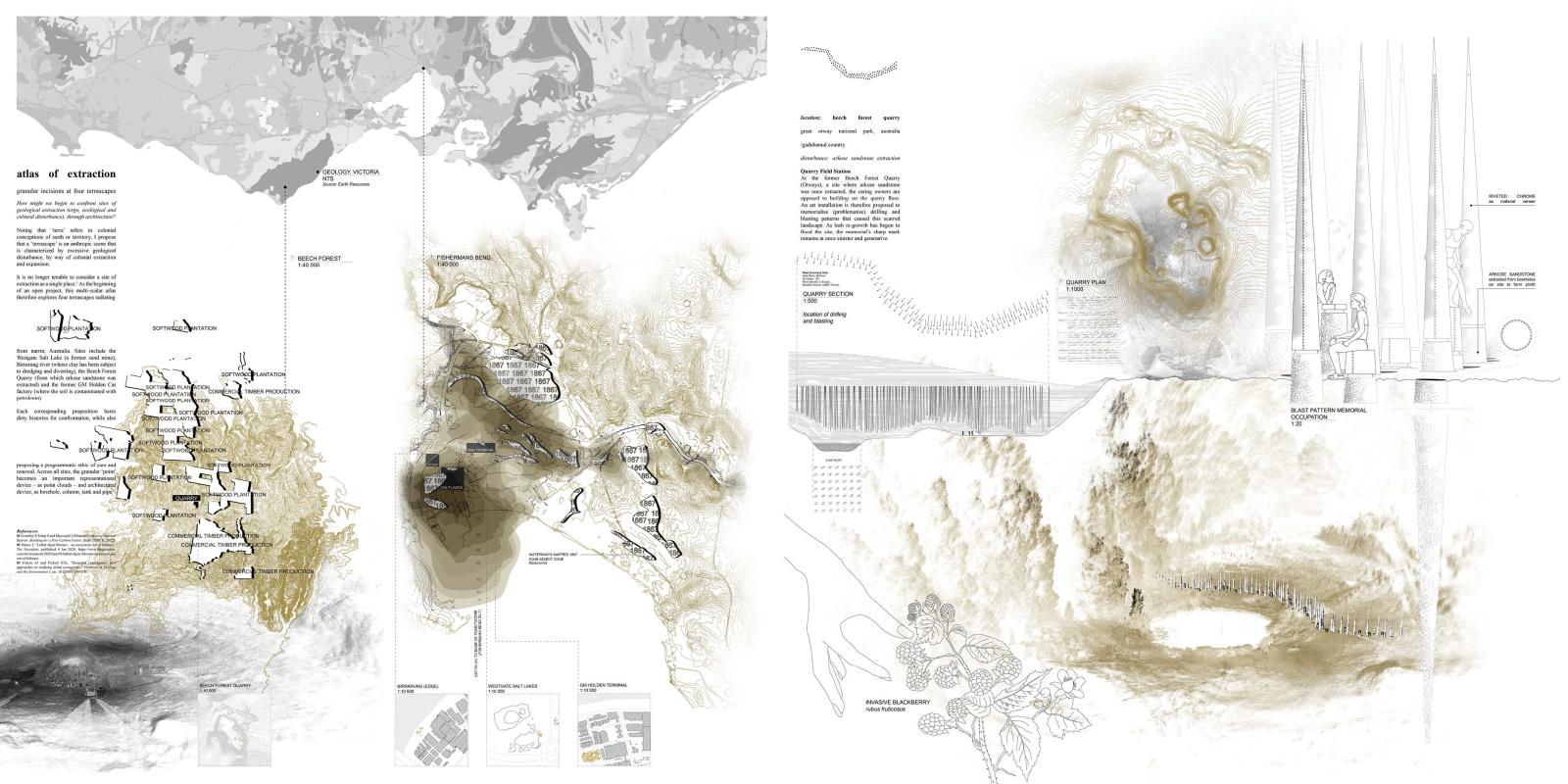 Atlas of Extraction: Granular Incisions at Four Terrascapes Part 2 Project 2023 Michaela Prunotto University of Melbourne | Australia How might we confront sites of geological extraction (sites of ecological and cultural disturbance) through architecture?‘Terra’ refers to terrain, earth, or territory – Australia’s colonial history is contested through the destructive illogic of terra nullius. This project proposes a new concept-tool: terrascapes. A terrascape is an anthropogenic scene that is characterized by significant geological disturbance, by way of colonial extraction and expansion.It is no longer tenable to consider a site of extraction as a single place.1 As the beginning of an open project, this multi-scalar atlas explores four terrascapes radiating from Narrm, Australia. Sites include the Beech Forest Quarry (from which arkose sandstone was extracted), the Westgate Salt Lake (a former sand mine), Birrarung river (whose clay has been subject to dredging and diverting), and the former General Motors Holden Car factory (where the soil is contaminated with petroleum).Each corresponding proposition bares dirty histories for confrontation, while also proposing a programmatic ethic of care and renewal. Across all sites, the granular ‘point’ becomes an important representational device – as point clouds – and architectural device, as borehole, column, tank and pipe.1 Gormley P, Islam S and Massoud G (Material Cultures), Material Reform, (Italy: MACK, 2022). Tutor(s) Alan Pert