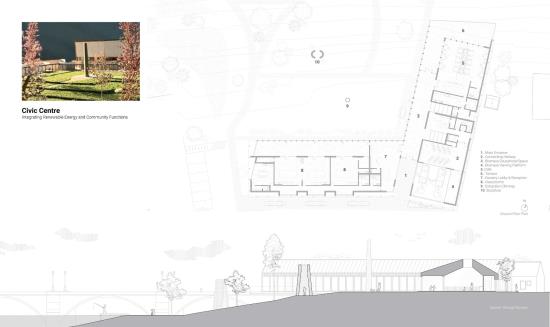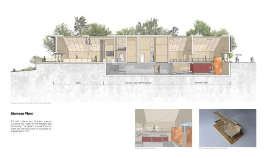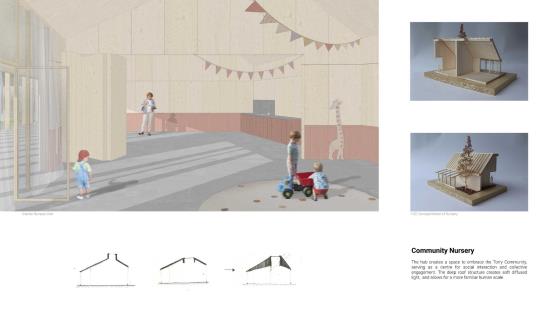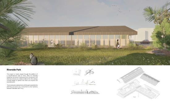 Riverside Hub Part 1 Project 2024 Marcelina Grygiel Robert Gordon University | UK The Riverside Hub is a landmark project which serves as a centre of sustainable energy, community engagement, and education in Scotland. Located along the River Dee, the centre supports Scotland’s Net Zero Future, powering 350 new homes through Biomass. The ‘Skills Campus’ for education was designed with cooperation with universities and colleges in mind. It features a viewing gallery offering insight into the energy plant and is visible when approaching from the street.The predominant horizontality of the wings creates space to embrace the Torry Community, serving as a centre for social interaction and collective engagement. The deep roof structure integrates soft diffused light and allows for a familiar human scale, especially in the nursery.The project is made unique through the addition of a neighbourhood park. Through planting some native missing plant species and many, the locals will be drawn to appreciate the biodiversity of the waterfront. With its towering presence, almost as if sprouting from the ground, the chimney serves as a beacon above the tree canopy inviting people to spend time here and explore the biomass plant. The sculptures scattered around resemble the chimney and serve as a monument to the harmony between Aberdeen and Torry. Tutor(s) Silvia Bassanese