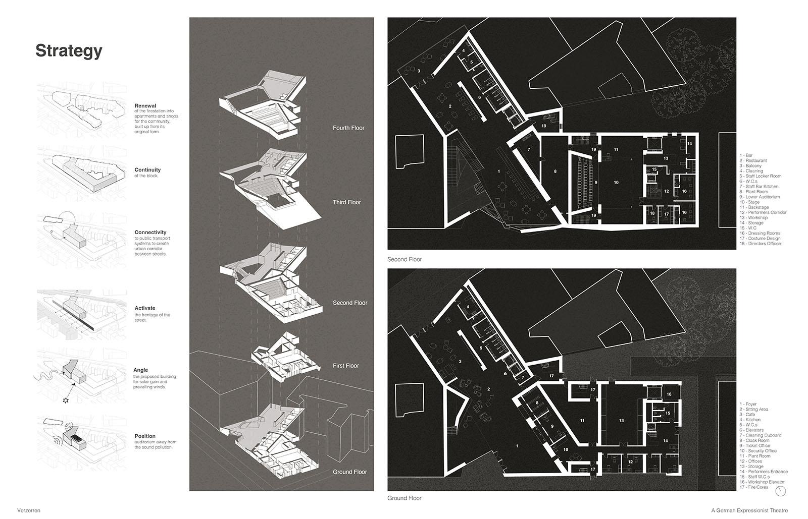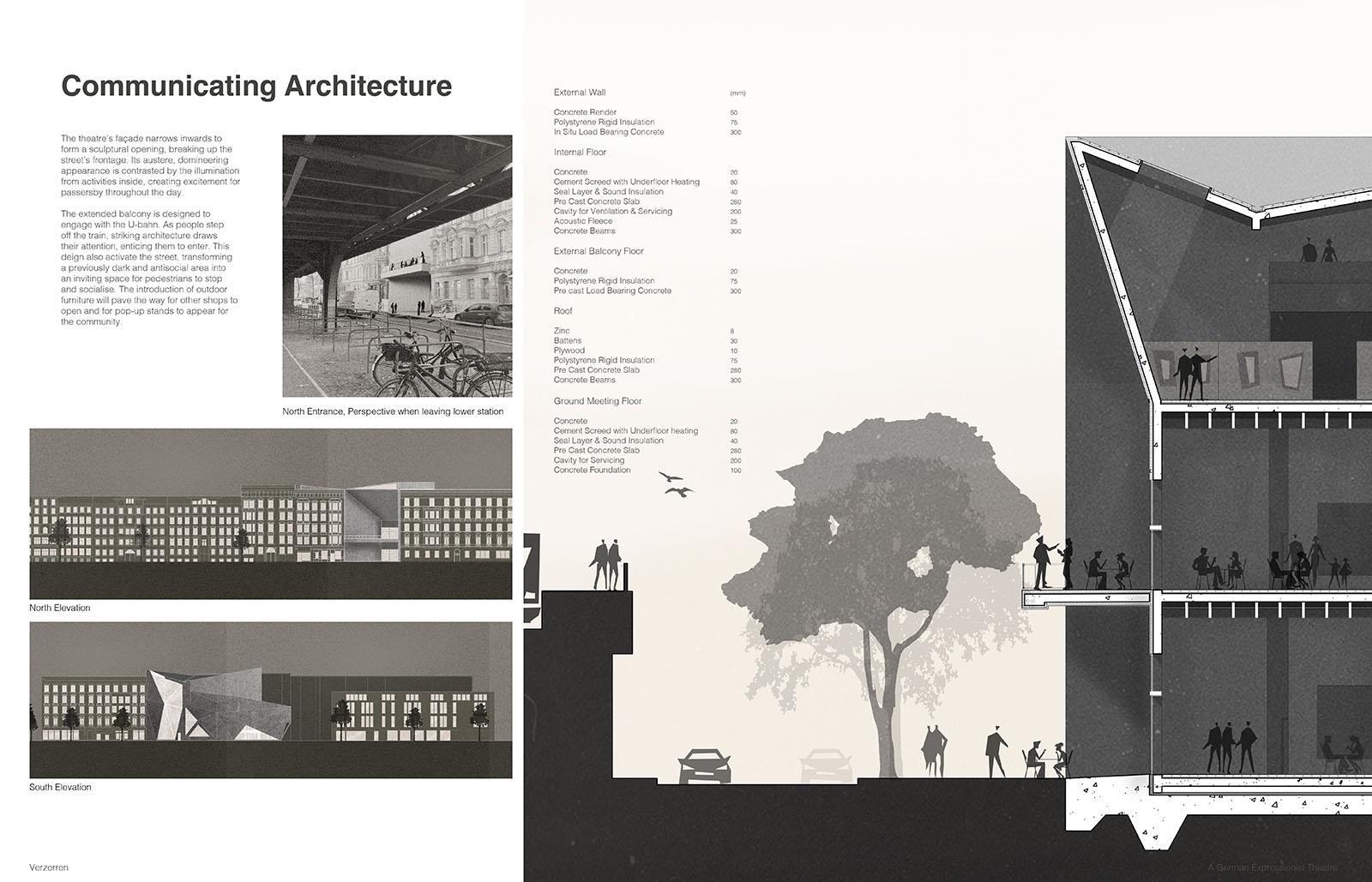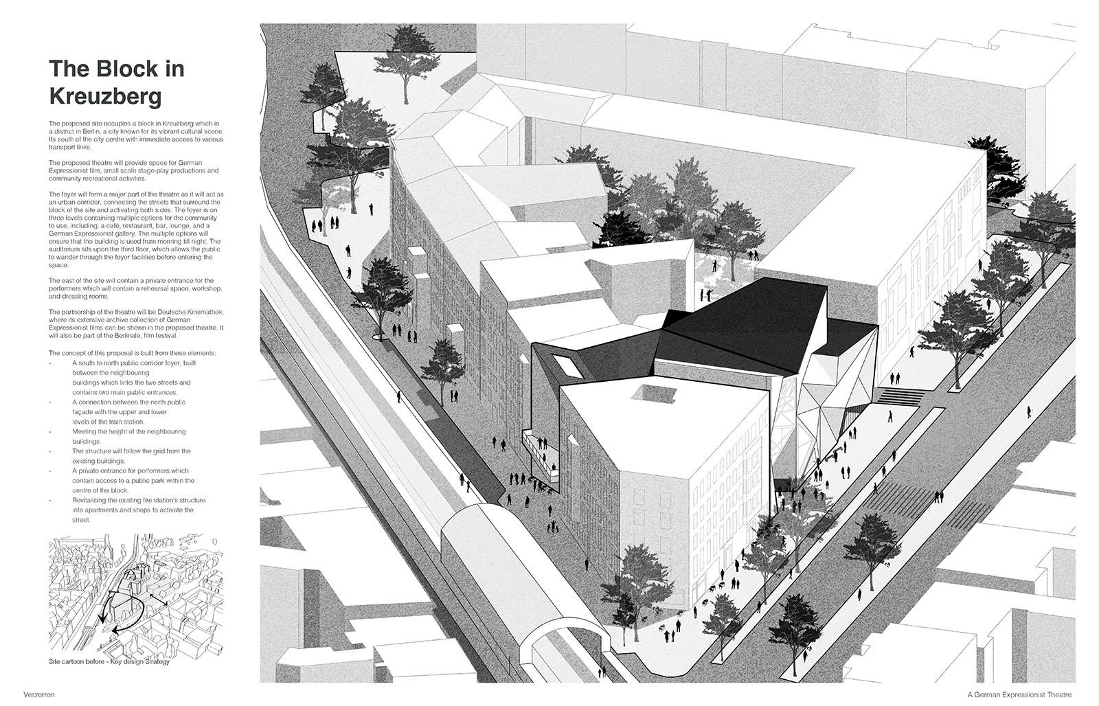The proposed theatre in Kreuzberg, Berlin, aims to be a cultural centre for German Expressionist film, small-scale productions, and community activities. Situated in a vibrant district, known for its dynamic cultural scene, the theatre benefits from excellent public transport access, ensuring it is easily reached for both locals and visitors.