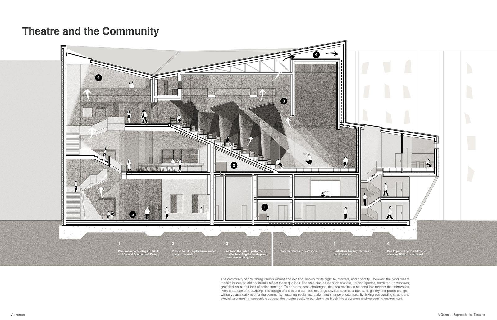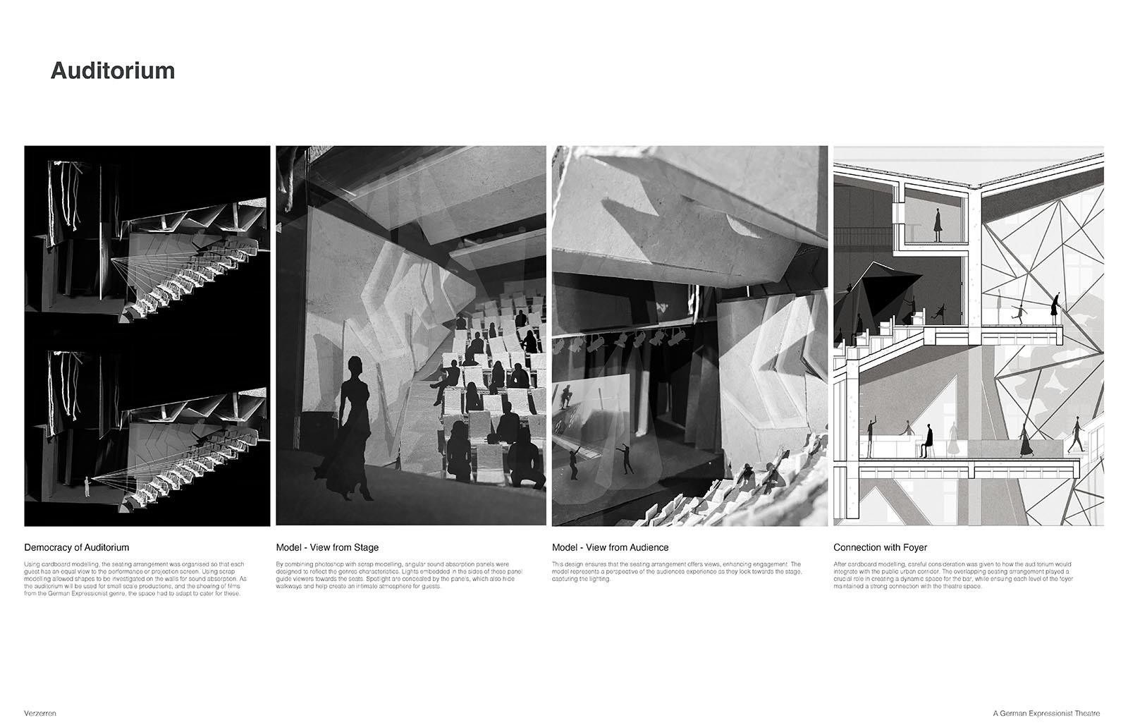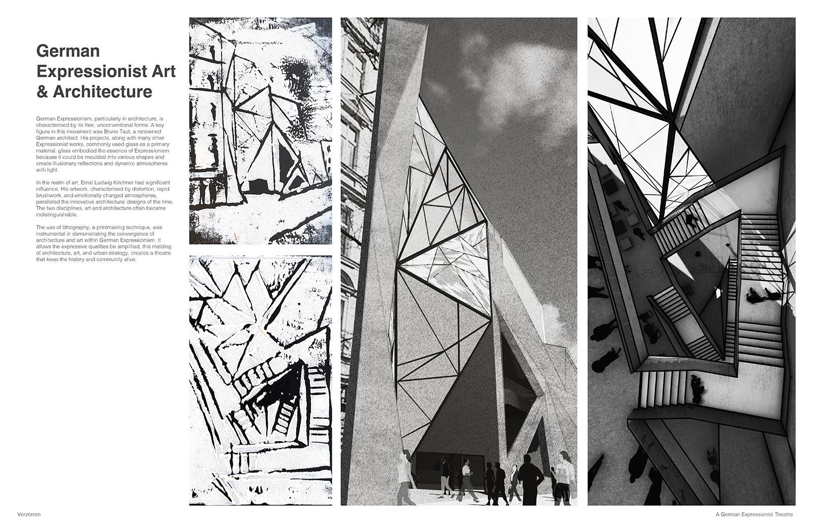 The project was developed through exploration of Weimar-era German Expressionist film, such as “The Cabinets of Dr Caligari” by Robert Weine in 1920, lino and wood cut art, as well as expressionist theories from the 1920s in Germany. The design process involved various artistic techniques, including model making, chalk art, and set design exploration, to create a space that resonates with values of German Expressionism. This integration of the historical art movement of Berlin in combination with designing around the community enhances the urban fabric, creating a theatre that is used by everyone.