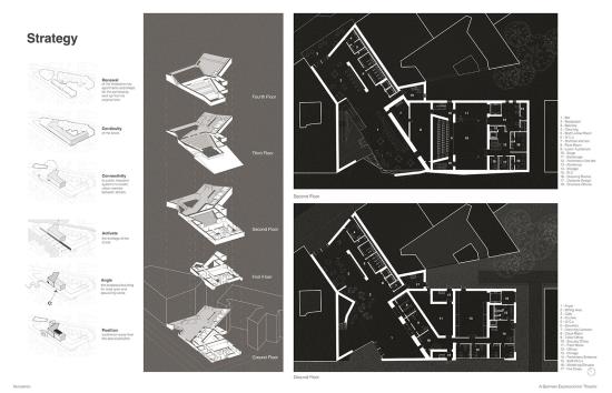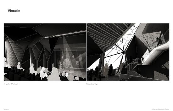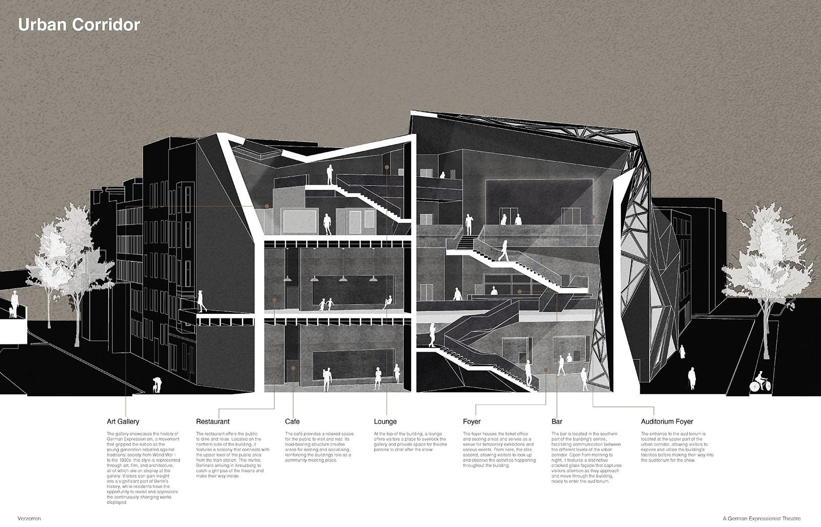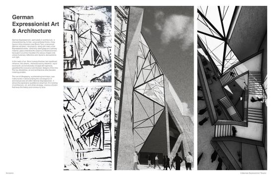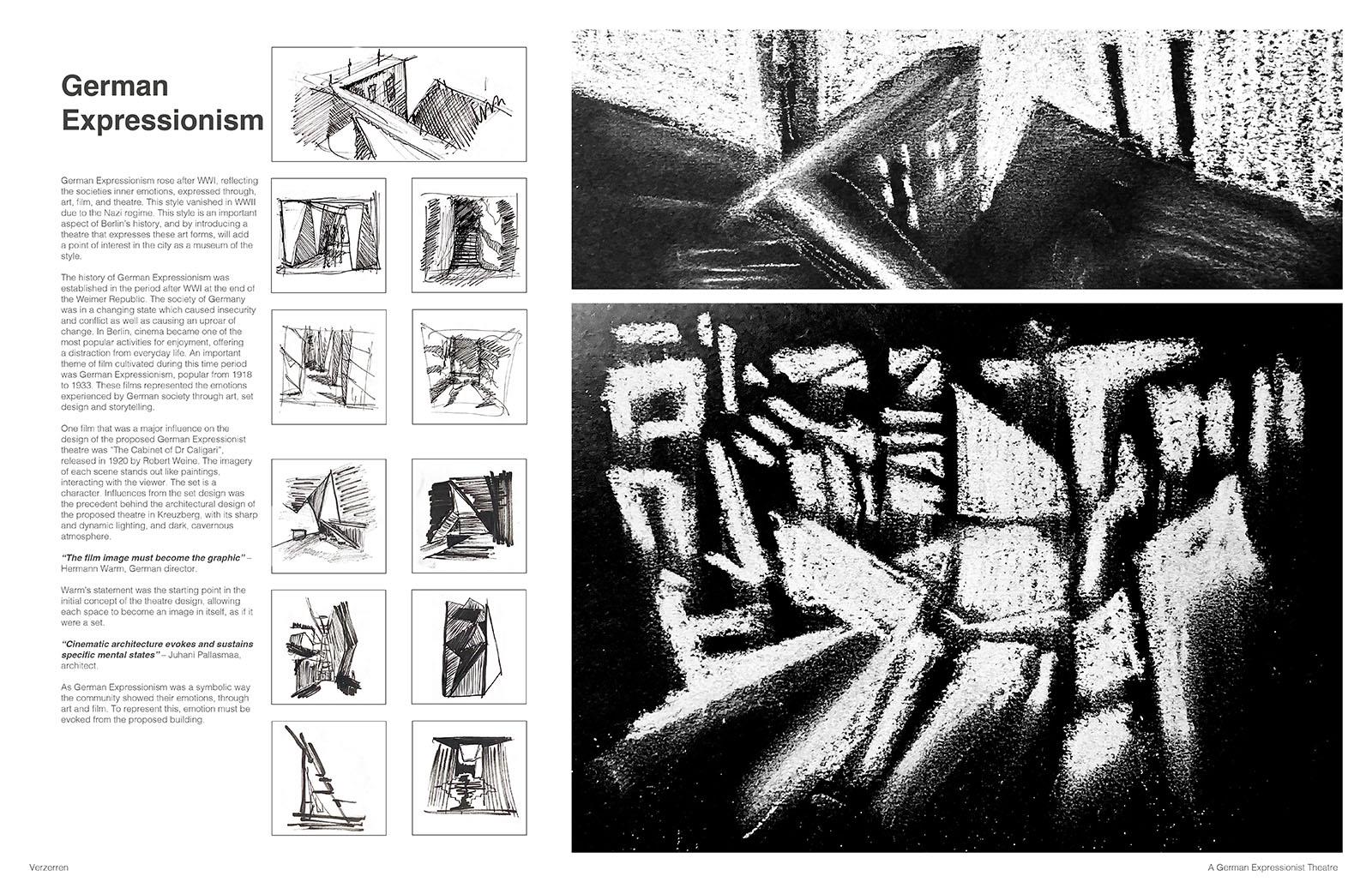 The project was developed through exploration of Weimar-era German Expressionist film, such as “The Cabinets of Dr Caligari” by Robert Weine in 1920, lino and wood cut art, as well as expressionist theories from the 1920s in Germany. The design process involved various artistic techniques, including model making, chalk art, and set design exploration, to create a space that resonates with values of German Expressionism. This integration of the historical art movement of Berlin in combination with designing around the community enhances the urban fabric, creating a theatre that is used by everyone.
