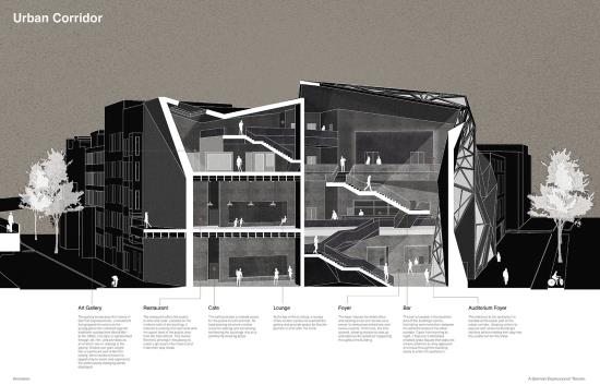 The foyer forms an integral part of the design, envisioned as an urban corridor that integrates with the surrounding streets, activating both sides. The foyer has a variety of community focused amenities, including a café, restaurant, bar, lounge, and a German Expressionist art gallery. These diverse facilities ensure the building is active from morning till night.