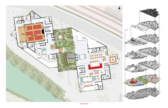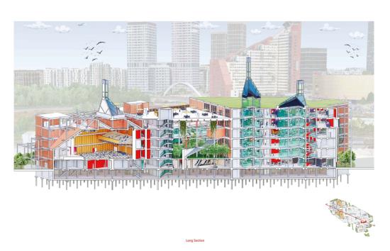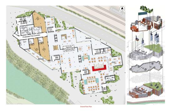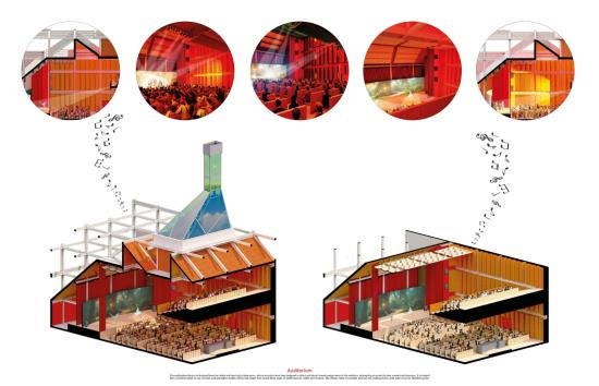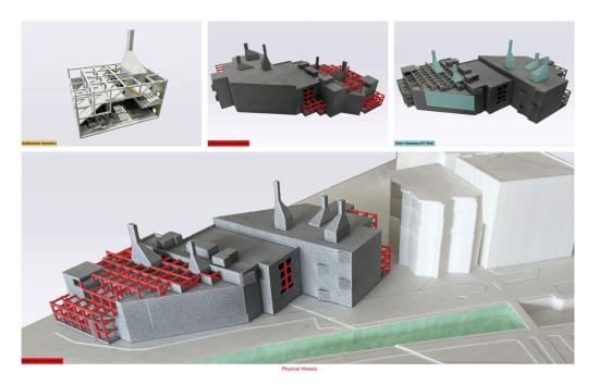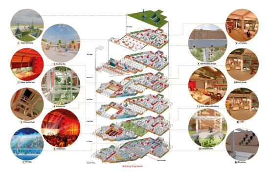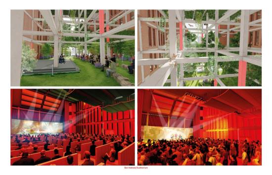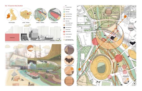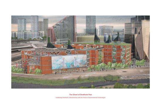Stratford was at the centre of the world for the Olympic Games in 2012, but has since lost its sense of community and heritage. The area is now rife with crime where youth theft is high, and local unemployment is higher than the London average of 4.8% with 5.2%. The 'ghost' proposes a performance-based theatre space that hopes to engage local residents and youths in producing shows and performances, whilst also lowering unemployment rates by involving local unemployed in the building’s construction via waste brick making. The proposal seeks to reaffirm Stratford's industrial heritage by providing large factory-style windows, a saw-tooth roof, and solar chimneys which provide natural ventilation throughout the building whilst maintaining a factory aesthetic. During the day, users can see the full scope of the chimneys throughout the building whilst taking part in theatre activities such as brick-making with local group, Newham Heritage, or exploring the natural bat habitat that surrounds the amphitheatre where humans and bats co-exist. At night, the external face of the building is lit up using a PV translucent screen, acting as a landmark for the area. The 'ghost' represents the best of Stratford’s past combined with the environmental strategies of the future.