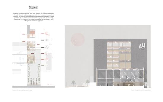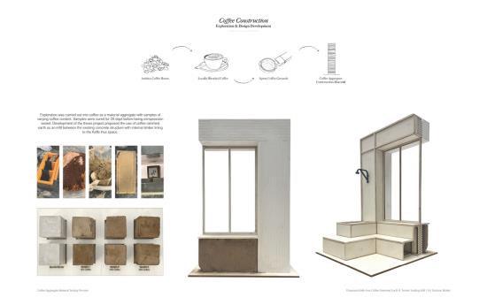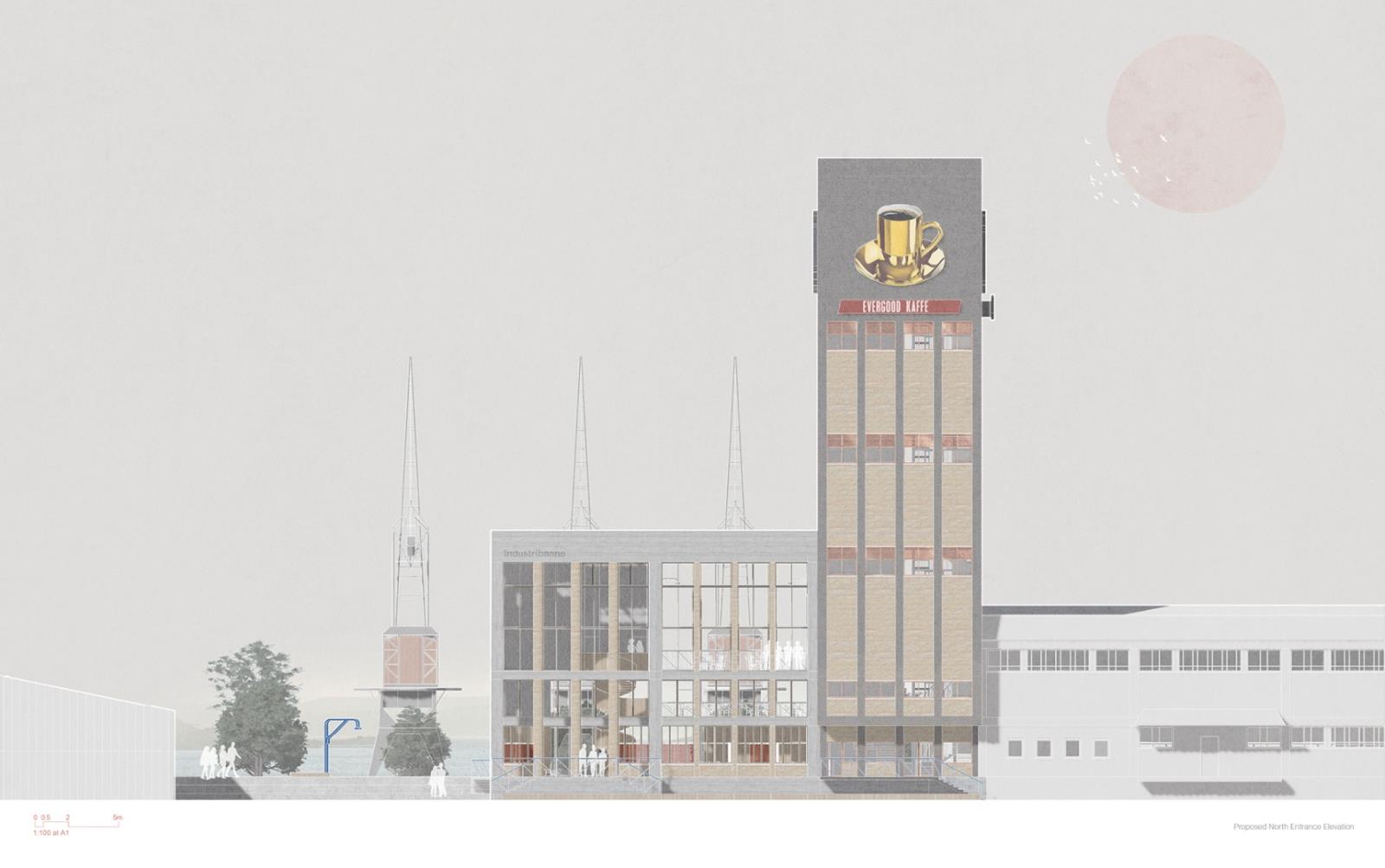 Industribønne Part 2 Project 2024 Laura Hastings Birmingham City University | UK Norwegians are the second highest coffee consumer in Europe, drinking approximately 9.9kg per capita annually. Could spent coffee grounds as waste, be the answer to a more sustainable beverage and less carbon intensive construction?Industribønne proposes the adaptive reuse of an existing coffee factory, located on the historically industrial site of Filipstad, Oslo, through retention of the existing structural frame to support proposed coffee-base infill elements. Architecturally the interrogation of retrofit explores the inhabitation of several wall-like conditions; the existing building interpreted as a monumental architectural wall and the boundaries to Oslofjord and urban edges. Material exploration and circular processes are a focus of this thesis, heavily informing the spatial arrangement and proposed programme from cultivation to manufacture. The development of the main Kaffe Hus acts as a vessel for social consumption, intangible exchange as a direct transition from the tangible exchange of goods through historic port activity; the Herb Garden intends to reconnect with the site’s original function as the home of an apothecary, enabling locally grown produce to be prepared and consumed; and the proposed redevelopment of the existing landmark tower to dry spent coffee grounds before manufacture, all honour the historical functions of the existing coffee factory. Tutor(s) Dan Aubrey Michael Dring Marina Mitchell-Heggs