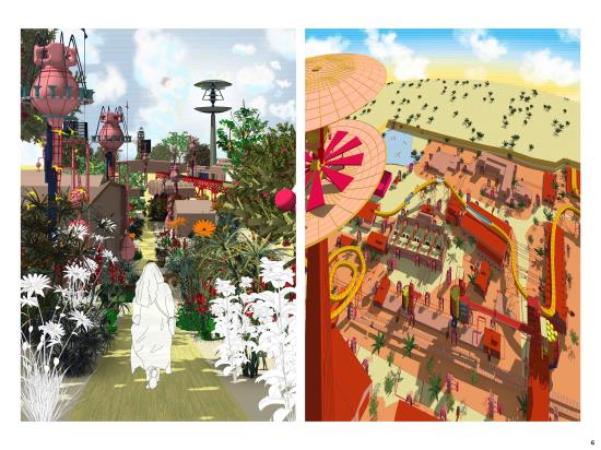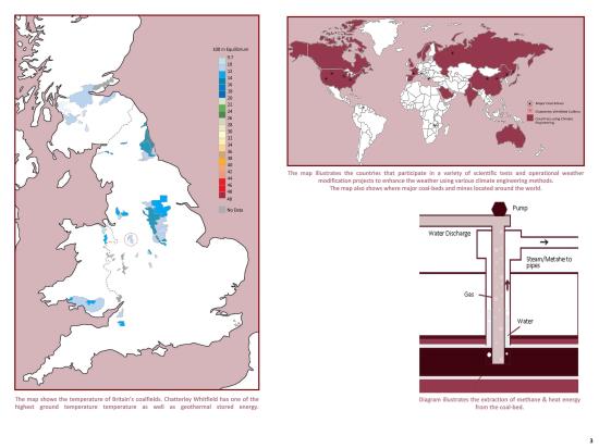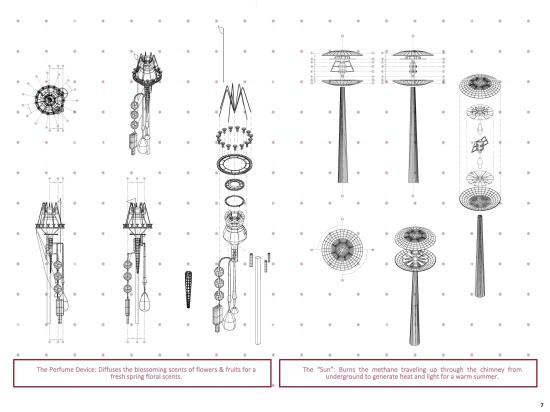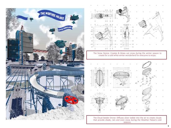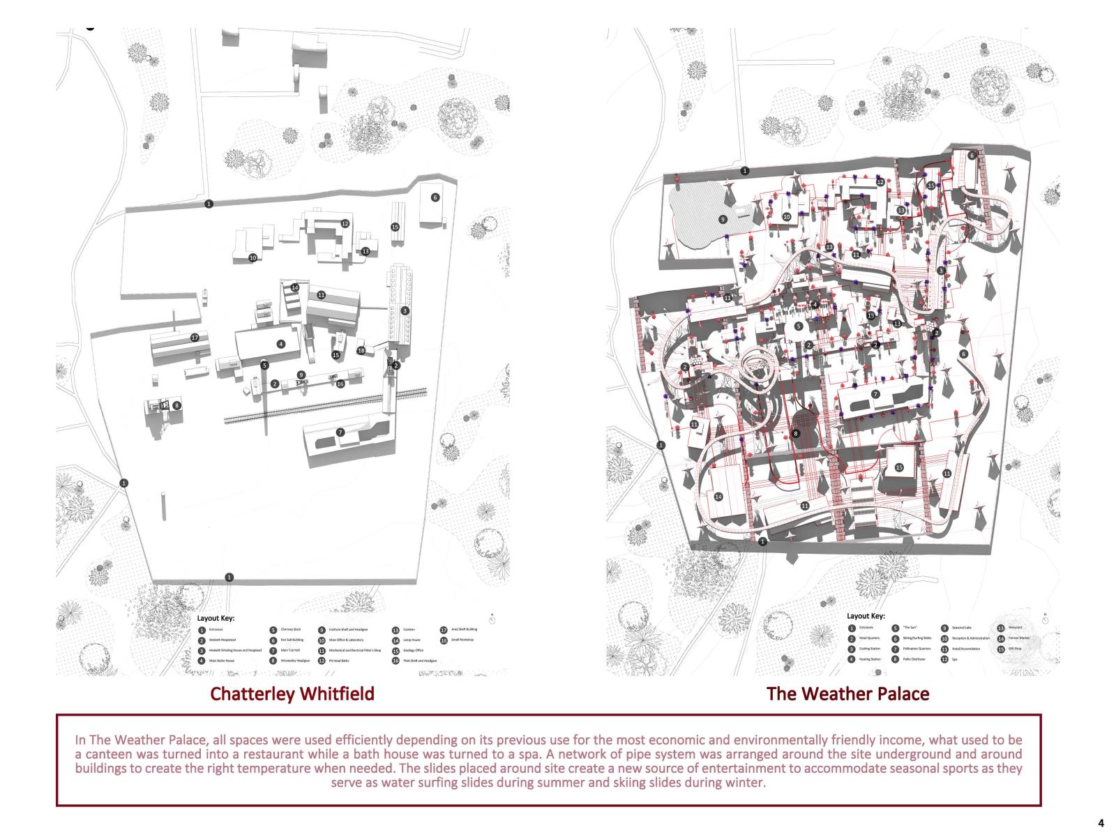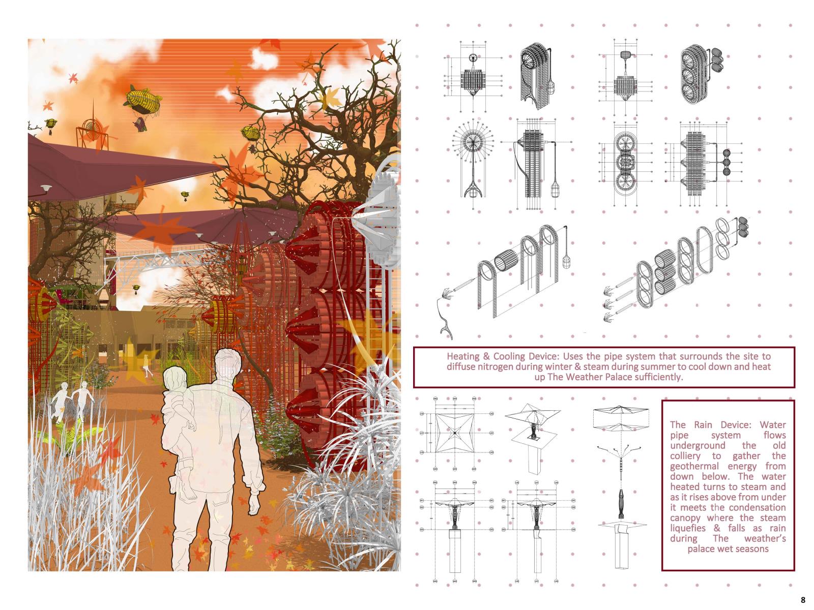 “The Weather Palace” imagines an alternative future for the Chatterley Whitfield Colliery where it is transformed into a seasonal village where the magic of all four seasons can be experienced simultaneously. Through technological advancements in the fields of climate engineering and weather control and utilising the colliery's existing deep shafts, abundant geothermal energy and stored methane, specifically-designed devices and innovative strategies are used to manipulate temperature, generate wind, and create rain or snow, effectively simulating any season at any time. The Colliery is transformed into a technological marvel that creates climatological experiences where winter, spring, summer, and autumn coexist.
