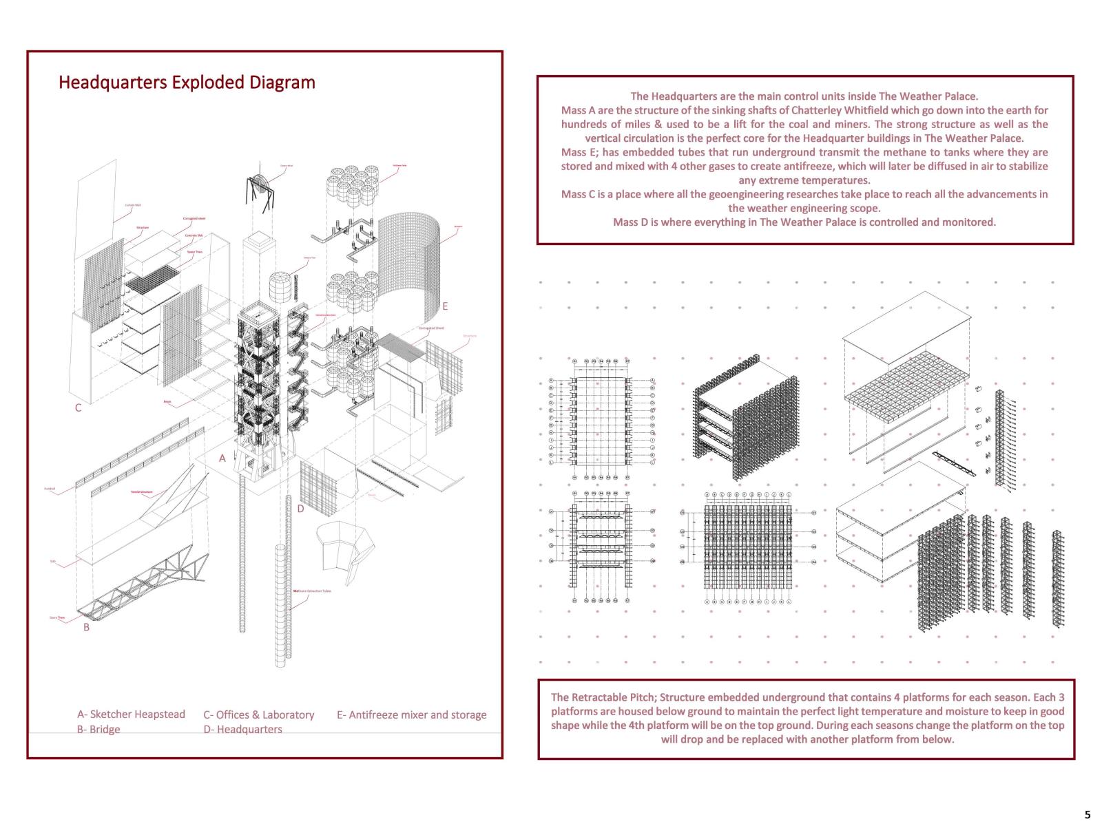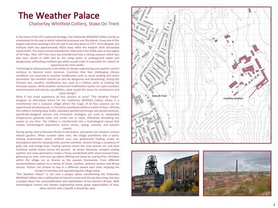 “The Weather Palace” is not only a project about transforming the Chatterley Whitfield Colliery into a celebration of nature's cycles and the joy they bring, but also a project about the commodification and exploitation of the planet’s climate. While weather control and modification tactics can open countless environmental and climatic possibilities, “The Weather Palace” questions what this would mean for architecture and urban design, and the architect’s responsibility for how, when and for whose benefit it should be used.