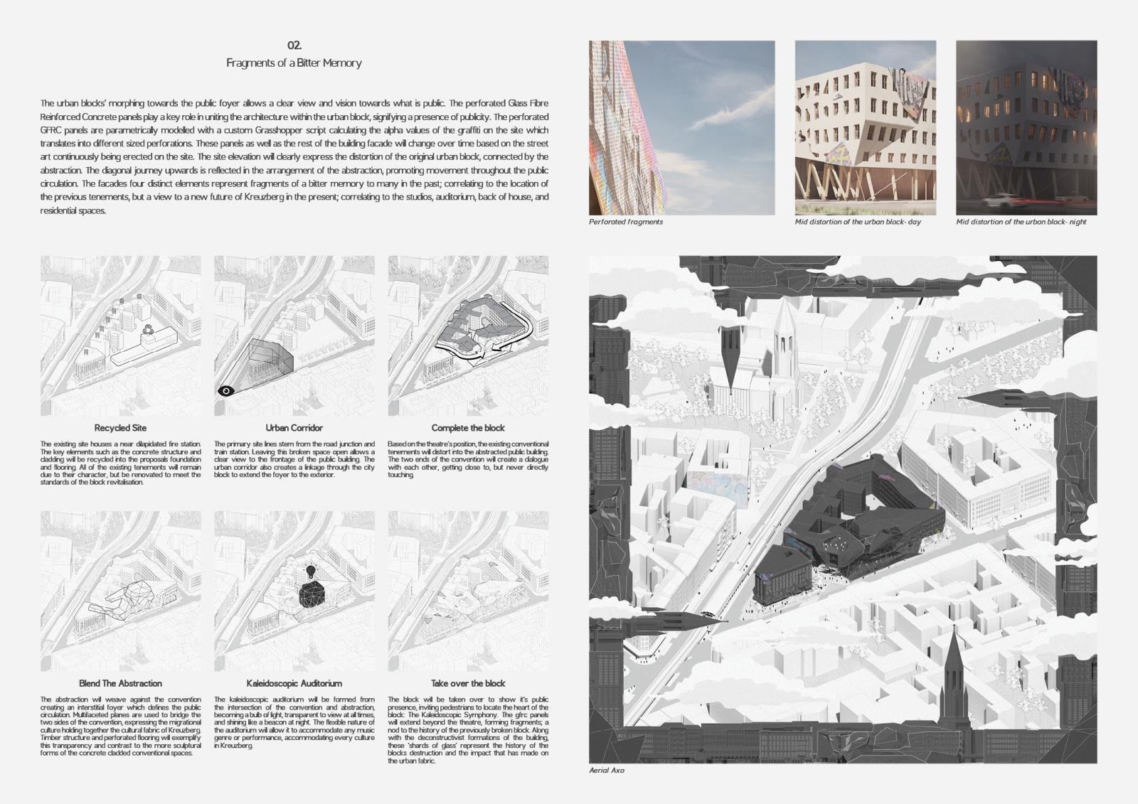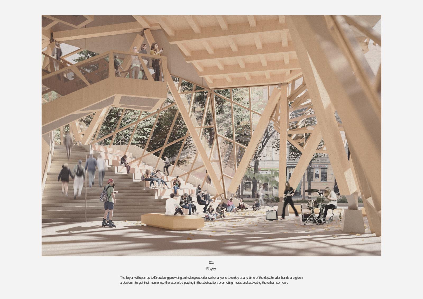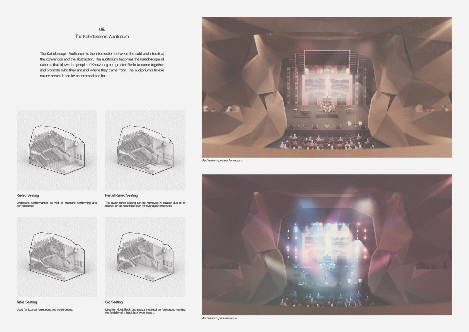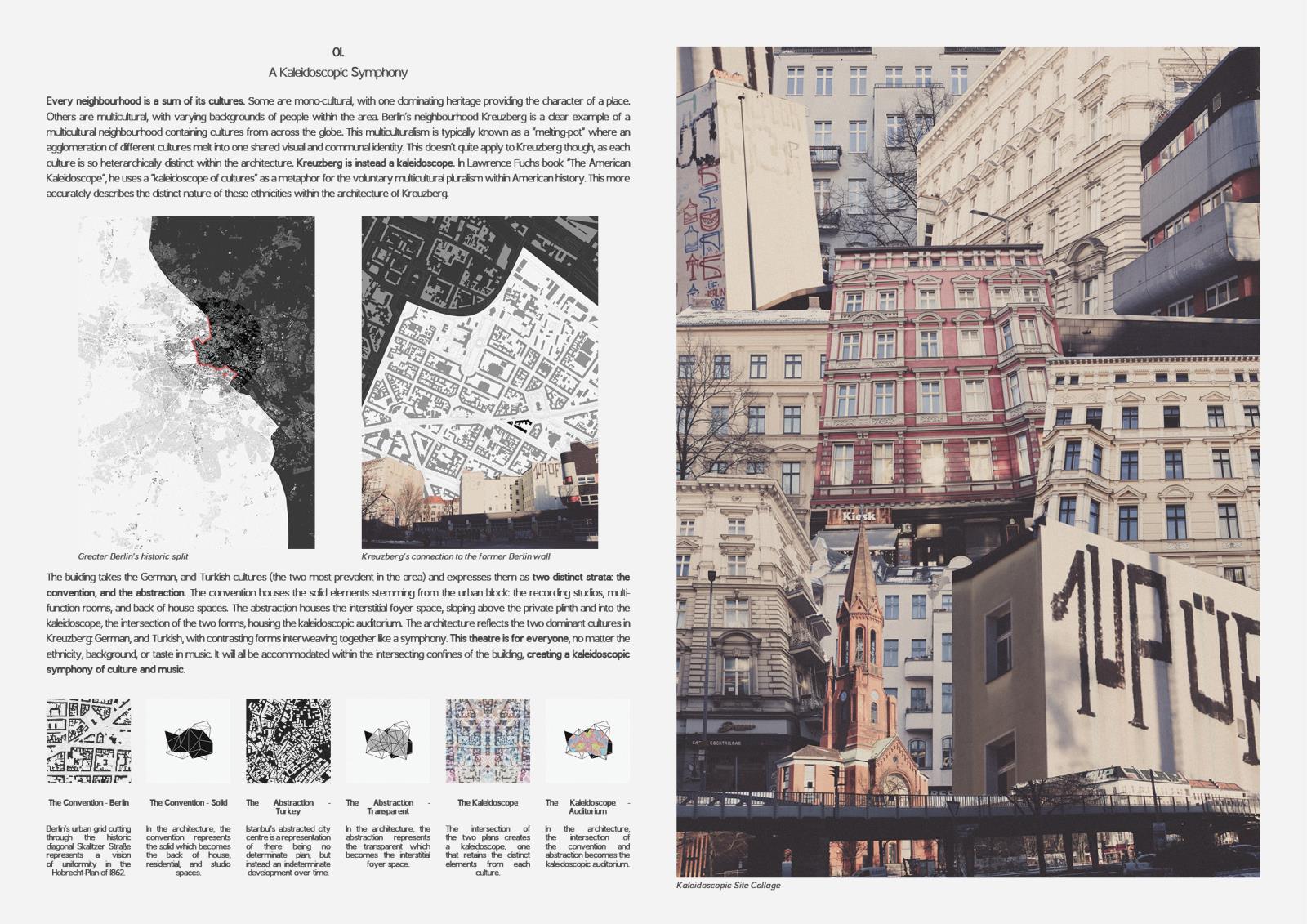 A Kaleidoscopic Symphony Part 1 Project 2024 Dylan Baliski University of Dundee | UK Every neighbourhood is a sum of its cultures. Some are mono-cultural, characterised by a single heritage, while others are multicultural, with diverse backgrounds shaping the area. Berlin's neighbourhood Kreuzberg exemplifies a multicultural neighbourhood containing cultures from across the globe. This multiculturalism is typically known as a "melting-pot", but this doesn't quite apply to Kreuzberg, as each culture is so hierarchically distinct within the architecture. In Lawrence Fuchs's book "The American Kaleidoscope", he uses a "kaleidoscope of cultures" as a metaphor to describe the voluntary multicultural pluralism within American history, which more accurately describes Kreuzberg.The building takes the German and Turkish cultures (the two most prevalent in the area) and expresses them as two distinct strata: the convention and the abstraction. The convention houses the solid elements stemming from the urban block: the recording studios, multi- function rooms, and back-of-house spaces. The abstraction houses the interstitial foyer space, sloping above the private plinth and into the kaleidoscope, the intersection of the two forms, housing the kaleidoscopic auditorium.This theatre is for everyone, regardless of ethnicity, background, or taste in music. It will all be accommodated within the intersecting confines of the building, creating a kaleidoscopic symphony of culture and music. Tutor(s) Douglas McCorkell