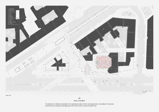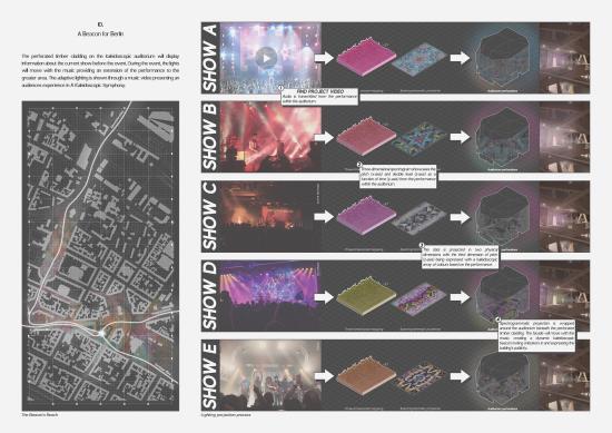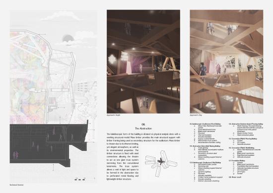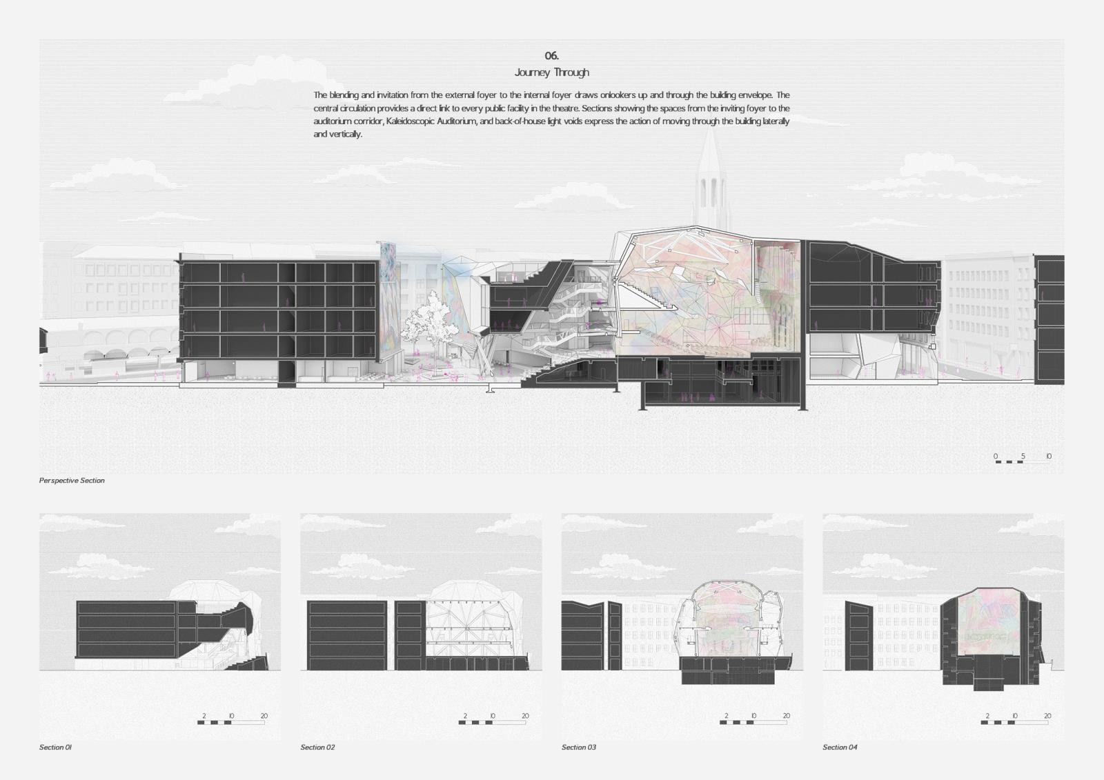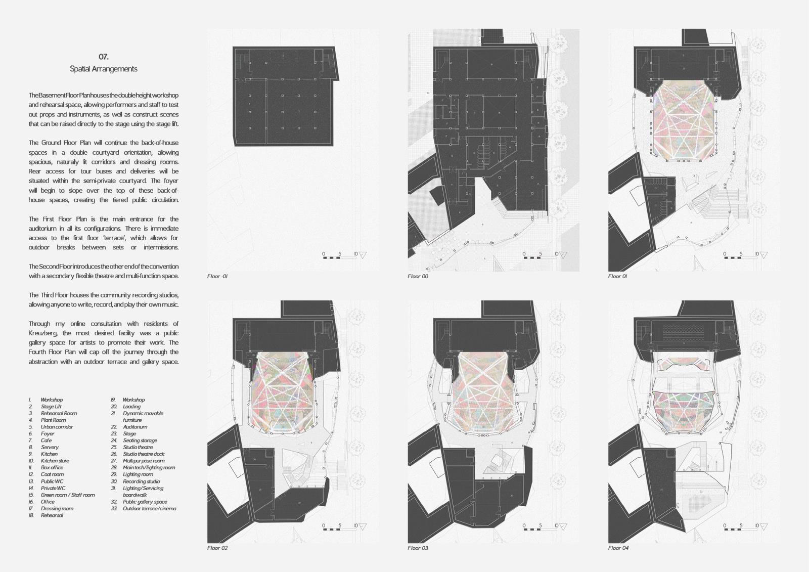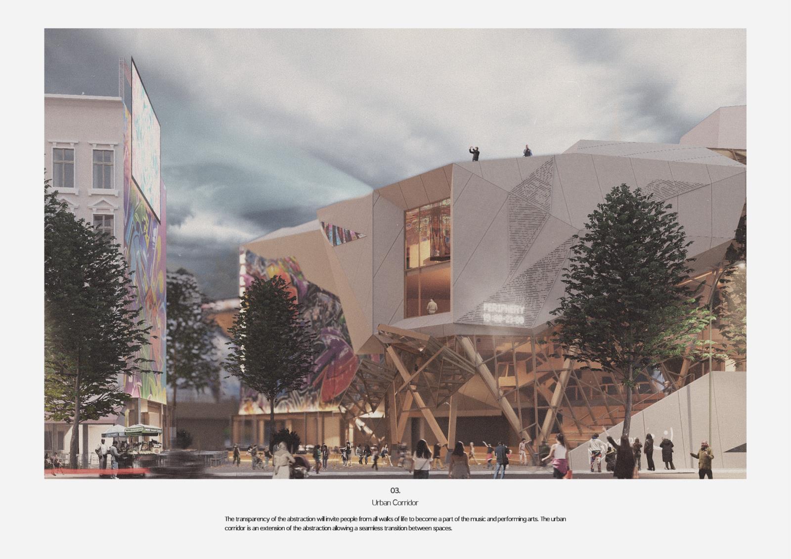A Kaleidoscopic Symphony Part 1 Project 2024 Dylan Baliski University of Dundee | UK Every neighbourhood is a sum of its cultures. Some are mono-cultural, characterised by a single heritage, while others are multicultural, with diverse backgrounds shaping the area. Berlin's neighbourhood Kreuzberg exemplifies a multicultural neighbourhood containing cultures from across the globe. This multiculturalism is typically known as a "melting-pot", but this doesn't quite apply to Kreuzberg, as each culture is so hierarchically distinct within the architecture. In Lawrence Fuchs's book "The American Kaleidoscope", he uses a "kaleidoscope of cultures" as a metaphor to describe the voluntary multicultural pluralism within American history, which more accurately describes Kreuzberg.The building takes the German and Turkish cultures (the two most prevalent in the area) and expresses them as two distinct strata: the convention and the abstraction. The convention houses the solid elements stemming from the urban block: the recording studios, multi- function rooms, and back-of-house spaces. The abstraction houses the interstitial foyer space, sloping above the private plinth and into the kaleidoscope, the intersection of the two forms, housing the kaleidoscopic auditorium.This theatre is for everyone, regardless of ethnicity, background, or taste in music. It will all be accommodated within the intersecting confines of the building, creating a kaleidoscopic symphony of culture and music. Tutor(s) Douglas McCorkell
