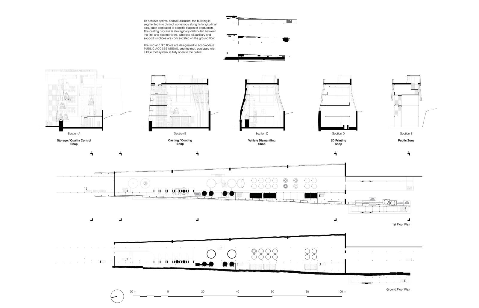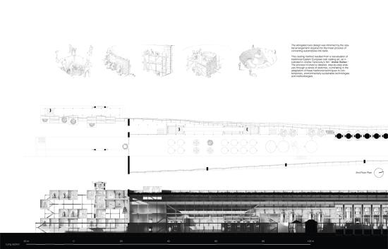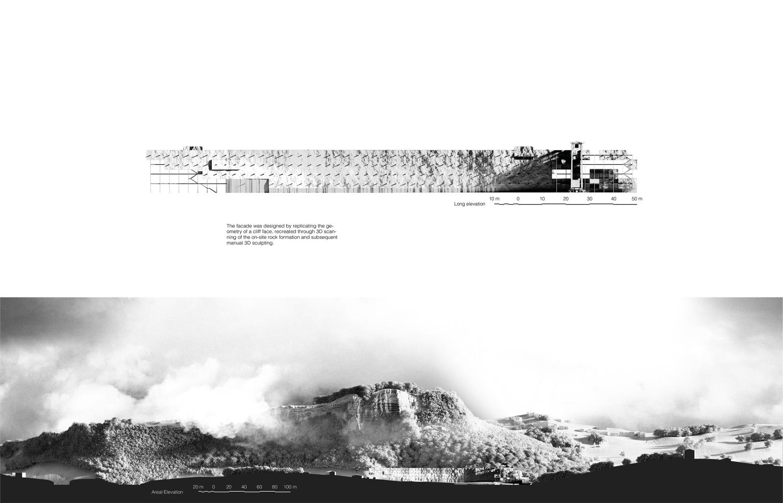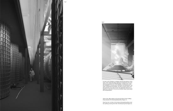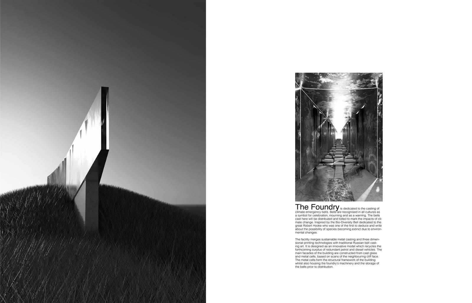 This project is for a foundry dedicated to the casting of climate emergency bells. Bells are recognised in all cultures as a symbol for celebration, mourning and as a warning. The bells cast here will be distributed and tolled to mark the impacts of climate change. Inspired by the Bio-Diversity Bell dedicated to the great Robert Hooke who was one of the first to deduce and write about the possibility of species becoming extinct due to environmental changes. The facility merges sustainable metal casting and three dimensional printing technologies with traditional Russian bell casting art. It is designed as an innovative model which recycles the forthcoming surplus of redundant petrol and diesel vehicles. The main facades of the building are constructed from cast glass and metal cells, based on scans of the neighbouring cliff face. The metal cells form the structural framework of the building whilst also housing the foundry’s machinery and the storage of the bells prior to distribution.