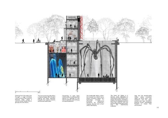 The museum presents a layout which is kept intact by the circulation, while expanding its spaces through a variety of spaces. It features three distinctive galleries which appeal to different artists and audiences, which ultimately leading to the climax of the journey. As visitors descend in the building through the gallery spaces and the transition spaces in between, they are expected to gain a lasting memory about the art, and the purpose of art as a medium in the rebellious, yet vibrant and playful context of Nugegoda. The museum itself becomes a work of art, and a canvas for the artists to express themselves and make an impact on the lives of the people of the region.