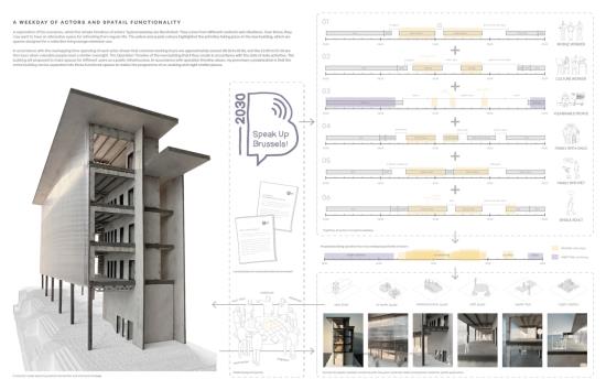 The project respectfully leverages this meaningful historical context to interpret the concept of a ‘Public Living Lounge,’ functioning as a streetscape intervention. It aims to create a collective extension for the homes within Marollen, founded on the principles of inclusive infrastructure by critically investigating the social needs for specific spaces in an urban setting, considering the diverse users, actors, and agents involved. The Public Living Lounge integrates overlapping programs of governance and usage, designed to care for and serve the diverse social classes and backgrounds of Marollen’s residents. It promotes cohesion and inclusivity in contemporary society while honouring its past. Moreover, the design of the facades considers an interactive relationship between both the interior and external environments. This approach enhances the building's visibility and engagement with the surrounding community, transforming it into a 'lighthouse' that acts as a landmark to activate the area after dark.