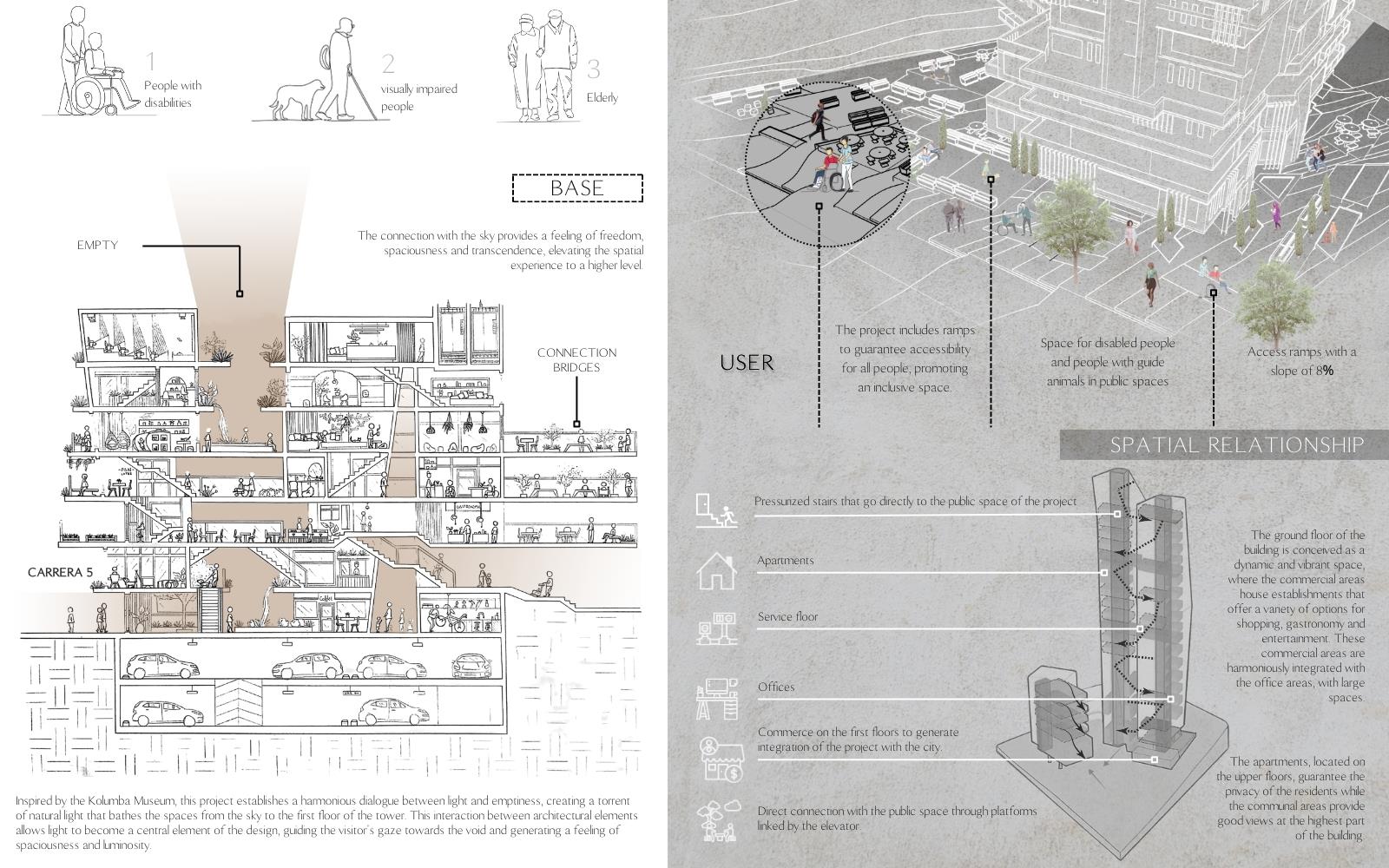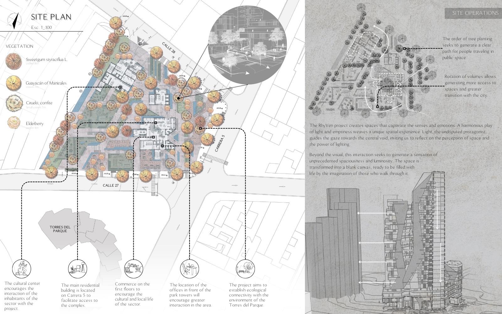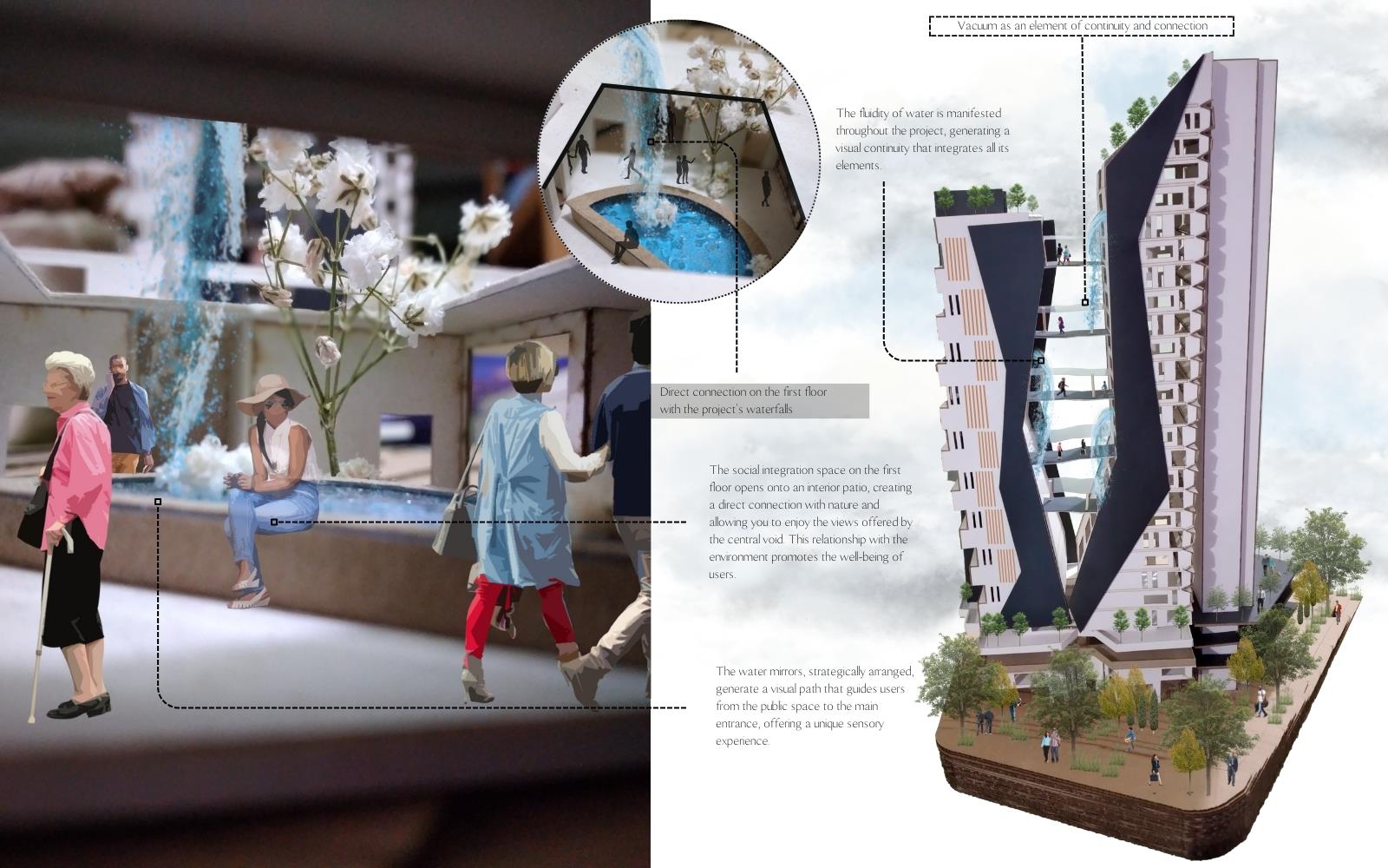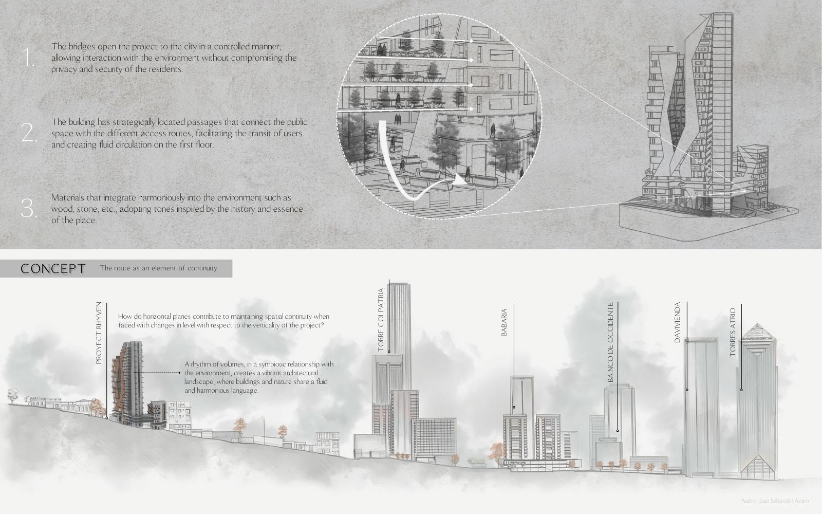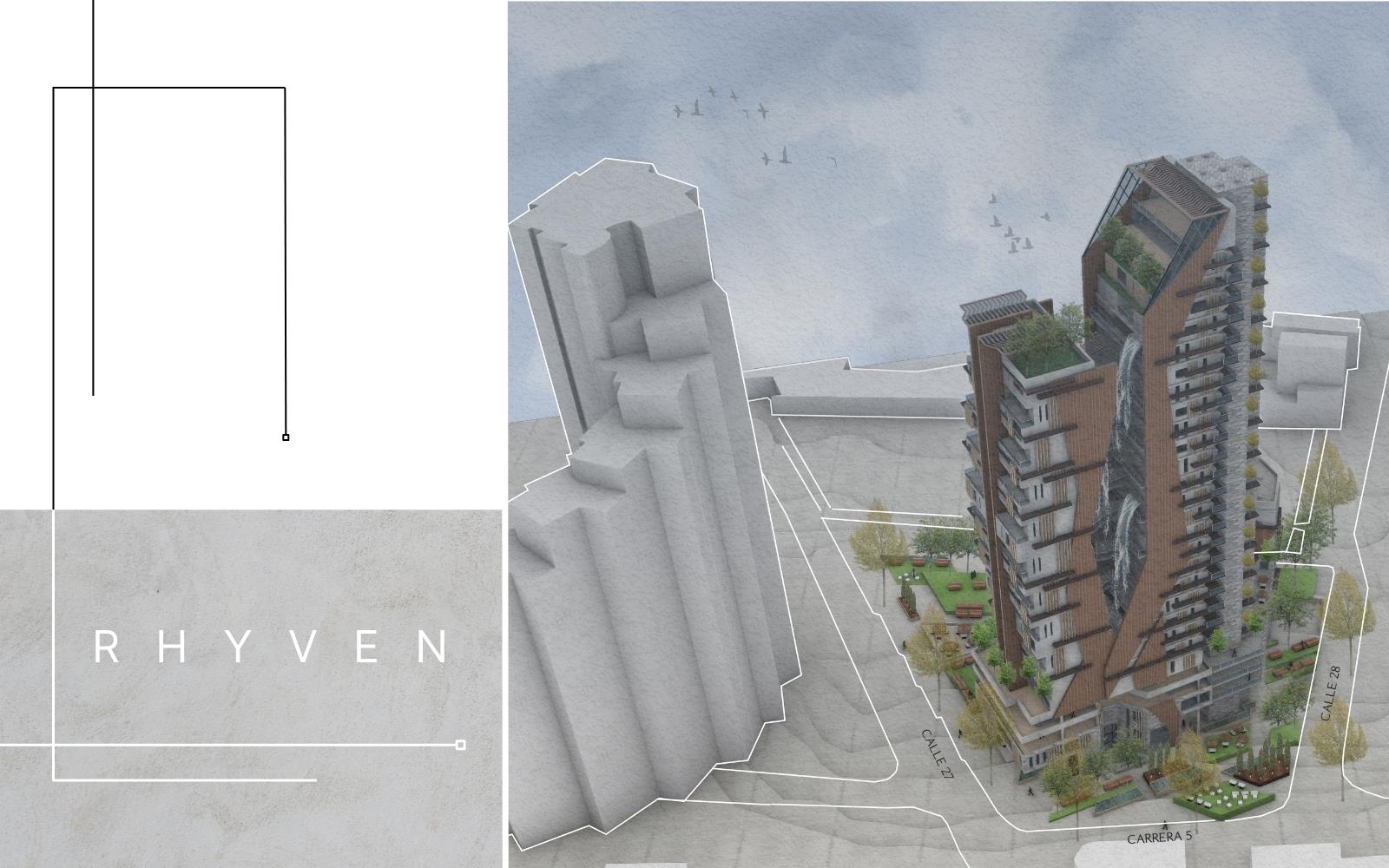 RhyVen Part 1 Project 2024 Lizeth Tatiana Mamani Contreras Pilot University of Colombia Bogota | Colombia The RhyVen project explores the role of the route in the spatial relationships between horizontal planes and level changes in the vertical. Using the route as an element of continuity, it is proposed to reduce the limits of the horizontal planes through a central void that begins at the connection of the ground floor with the surroundings, in a spatial sequence upwards, open towards the sky and the city. The continuity of the routes is based on the perception of space, the power of lighting and the harmonious play of light and water in the vertical to guide the view towards the central void.The design strategy demands a dynamic ground floor that operates as a multifunctional lobby for activities with a more private vocation in the vertical, from commerce and offices to different types of housing on the upper floors, with common areas that offer panoramic views in the upper part of the building.In harmony with the environment, the project provides inclusive, open, versatile meeting spaces that favor the public-private relationship. The staggered arrangement of the terraces from the base adapts to the shape as an allegory of the slope of the land, creating a visual and functional transition that resolves the feeling of oppression in the public space. The strategy favors the energy efficiency of the building to achieve thermal insulation, control of solar radiation and natural ventilation. Tutor(s) Ivonne Del Rosario Martinez Clavijo