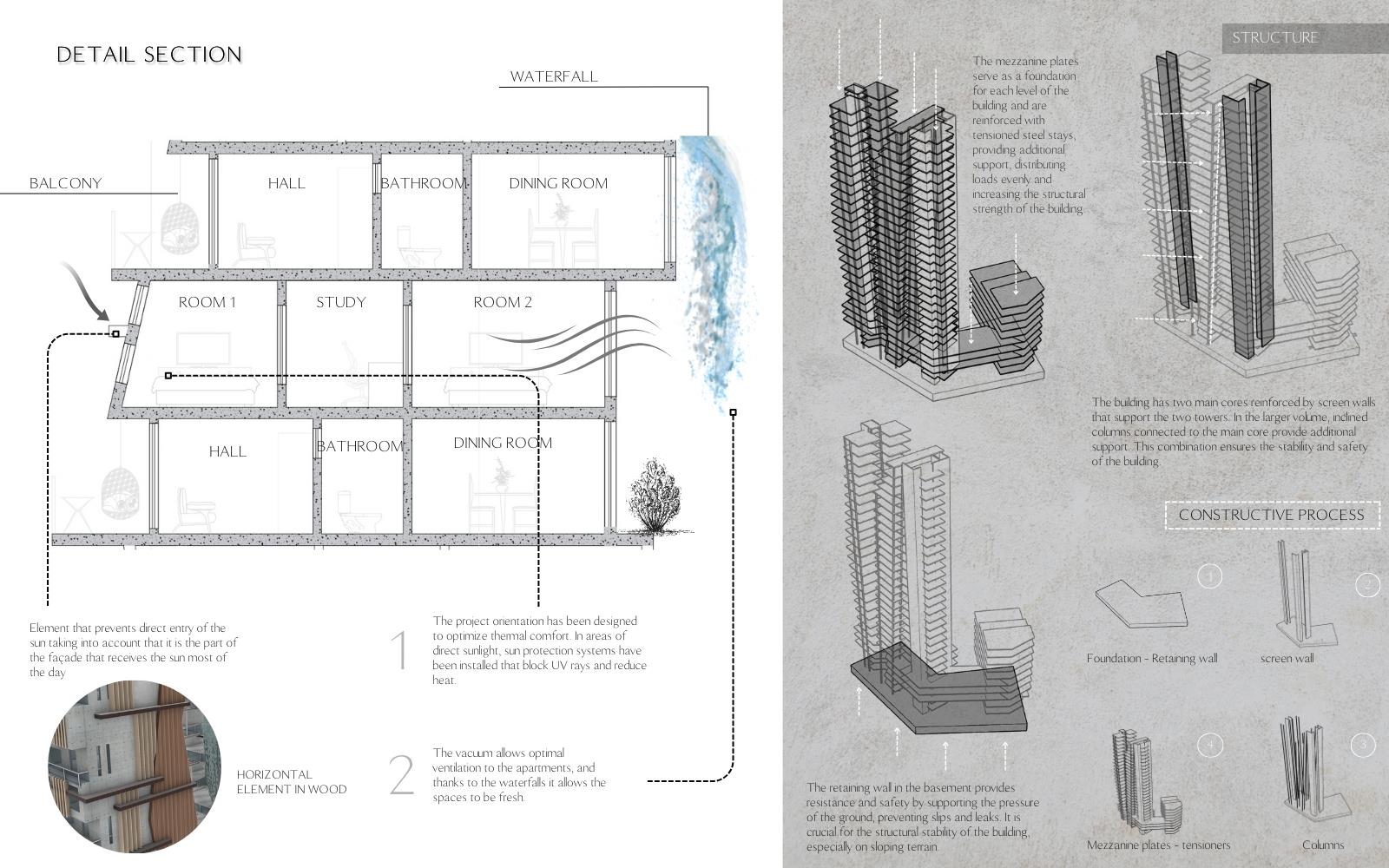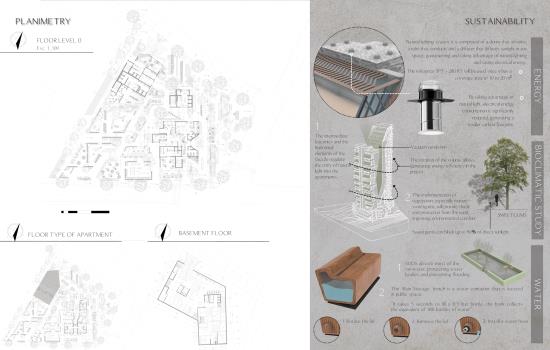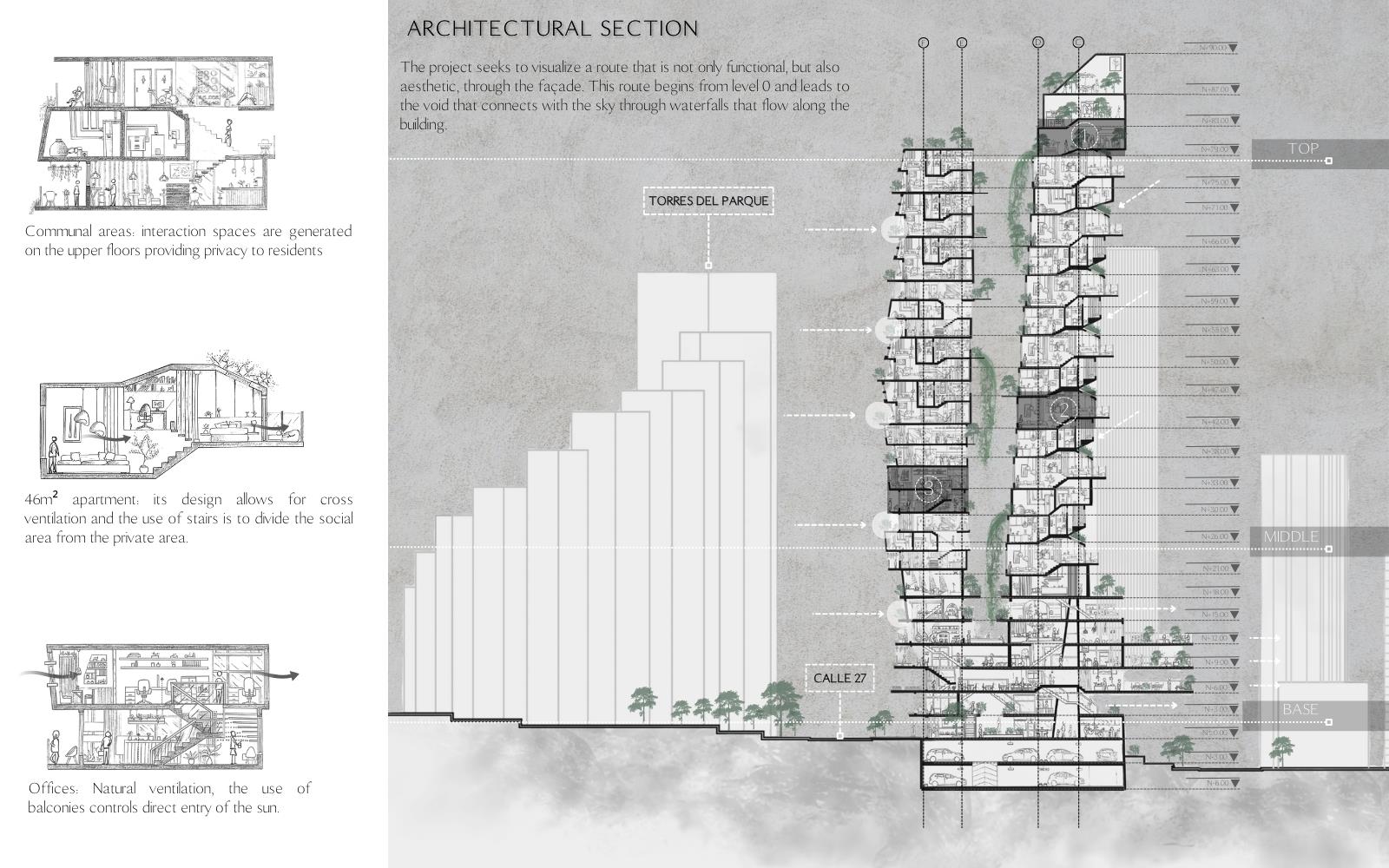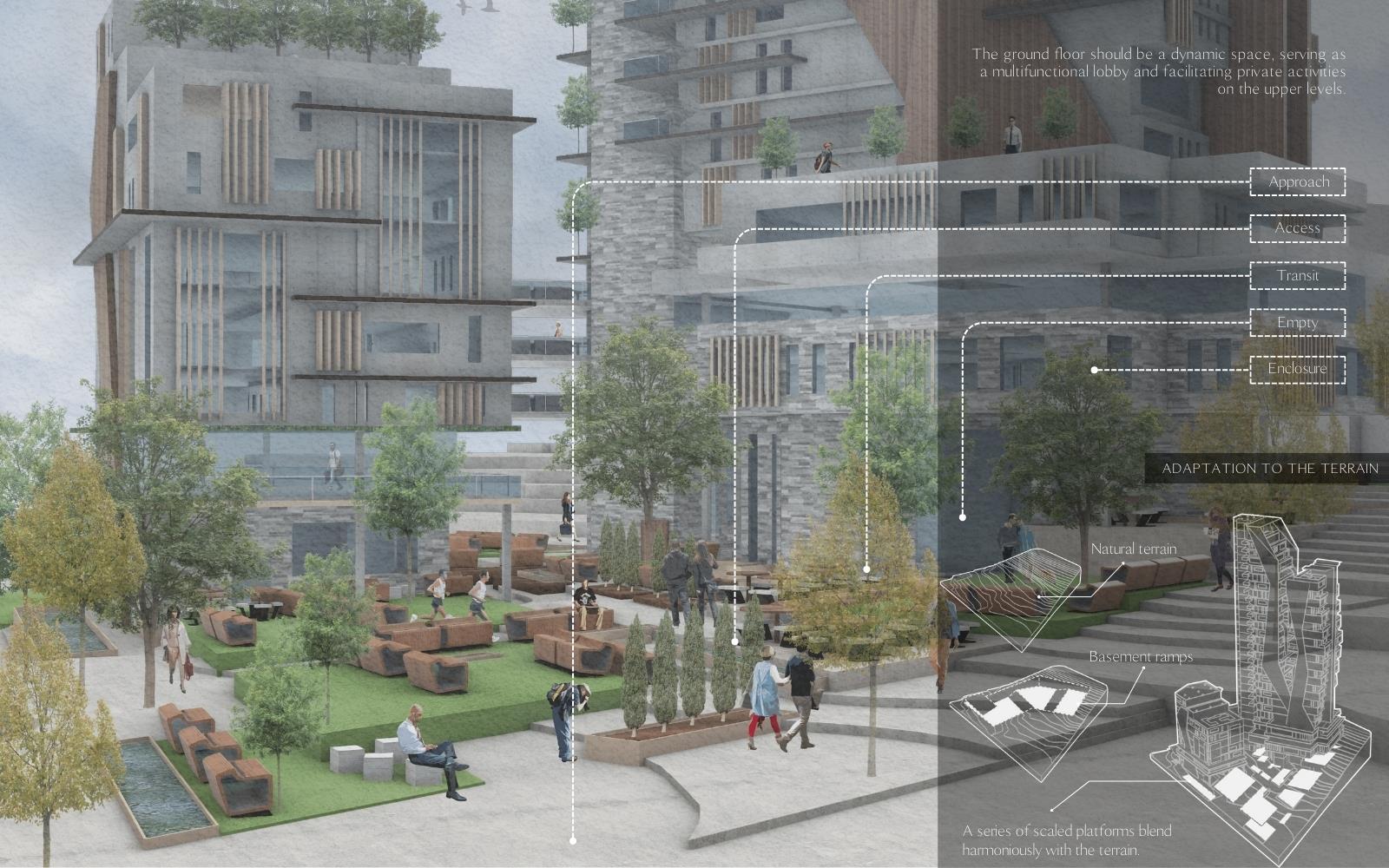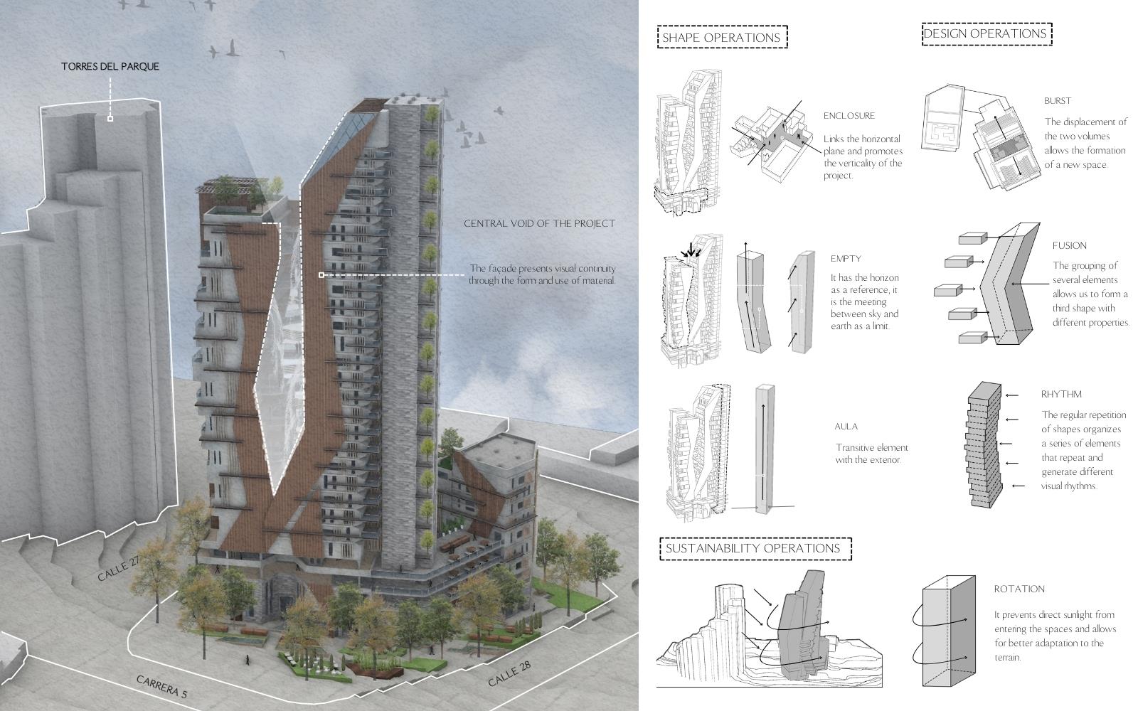 RhyVen Part 1 Project 2024 Lizeth Tatiana Mamani Contreras Pilot University of Colombia Bogota | Colombia The RhyVen project explores the role of the route in the spatial relationships between horizontal planes and level changes in the vertical. Using the route as an element of continuity, it is proposed to reduce the limits of the horizontal planes through a central void that begins at the connection of the ground floor with the surroundings, in a spatial sequence upwards, open towards the sky and the city. The continuity of the routes is based on the perception of space, the power of lighting and the harmonious play of light and water in the vertical to guide the view towards the central void.The design strategy demands a dynamic ground floor that operates as a multifunctional lobby for activities with a more private vocation in the vertical, from commerce and offices to different types of housing on the upper floors, with common areas that offer panoramic views in the upper part of the building.In harmony with the environment, the project provides inclusive, open, versatile meeting spaces that favor the public-private relationship. The staggered arrangement of the terraces from the base adapts to the shape as an allegory of the slope of the land, creating a visual and functional transition that resolves the feeling of oppression in the public space. The strategy favors the energy efficiency of the building to achieve thermal insulation, control of solar radiation and natural ventilation. Tutor(s) Ivonne Del Rosario Martinez Clavijo