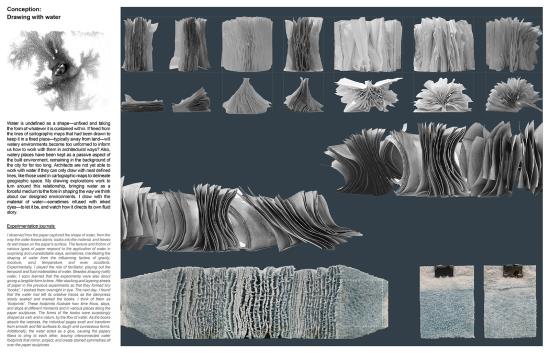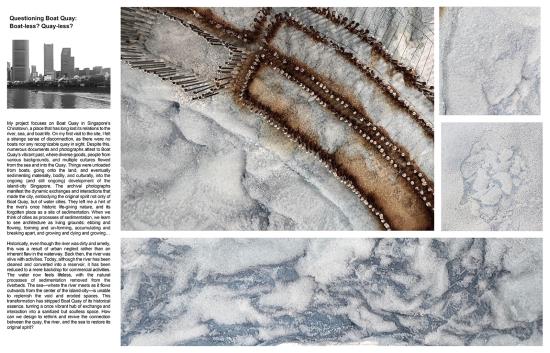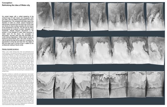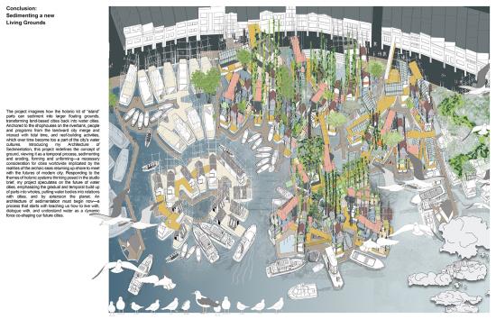 Architecture of Sedimentation: Water cities and living ground Part 2 Project 2024 Dian Cong Liu National University of Singapore | Singapore Sedimentation is a natural process of ground formation where organic matter and minerals deposit along eroded riverbanks and coastlines. Water-based settlements continually rely on sedimentation processes to replenish their grounds of inhabitation. In the Modernization of cities, the relation of water to the city has become perceived as backward: this has to do with an eroded understanding of rivers and seas, which our land-centric cities have stopped relying on for their growth. However, today’s river and coastal cities must learn to better relate to their watery environments. It is timely and useful to rethink city-formation as sedimentary 'holoarchic' systems of water-bodies (ourselves included as water-filled bodily units) building up into new water-urbanisms, and finally into the water-worlds of this planet.The originality of my thesis is in questioning how natural forms of sedimentation might be reinterpreted as an architectural process for building up the city, accumulating from small fragmentary units (by piecing together the remains of past watery ways of living) into larger complex systems (of future water cities). This project has significance in restoring architecture’s relations to ground, water, and the invisible hand of time.These are urgent matters to care about, amidst the global environmental crisis, and the resultant changes in sea levels—putting the revival of each and every individuals’ relations to water at the core of planetary transformations. Tutor(s) Peng Beng Khoo