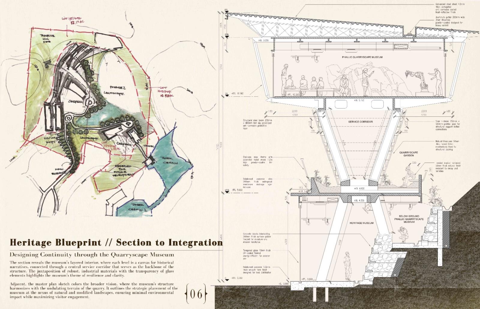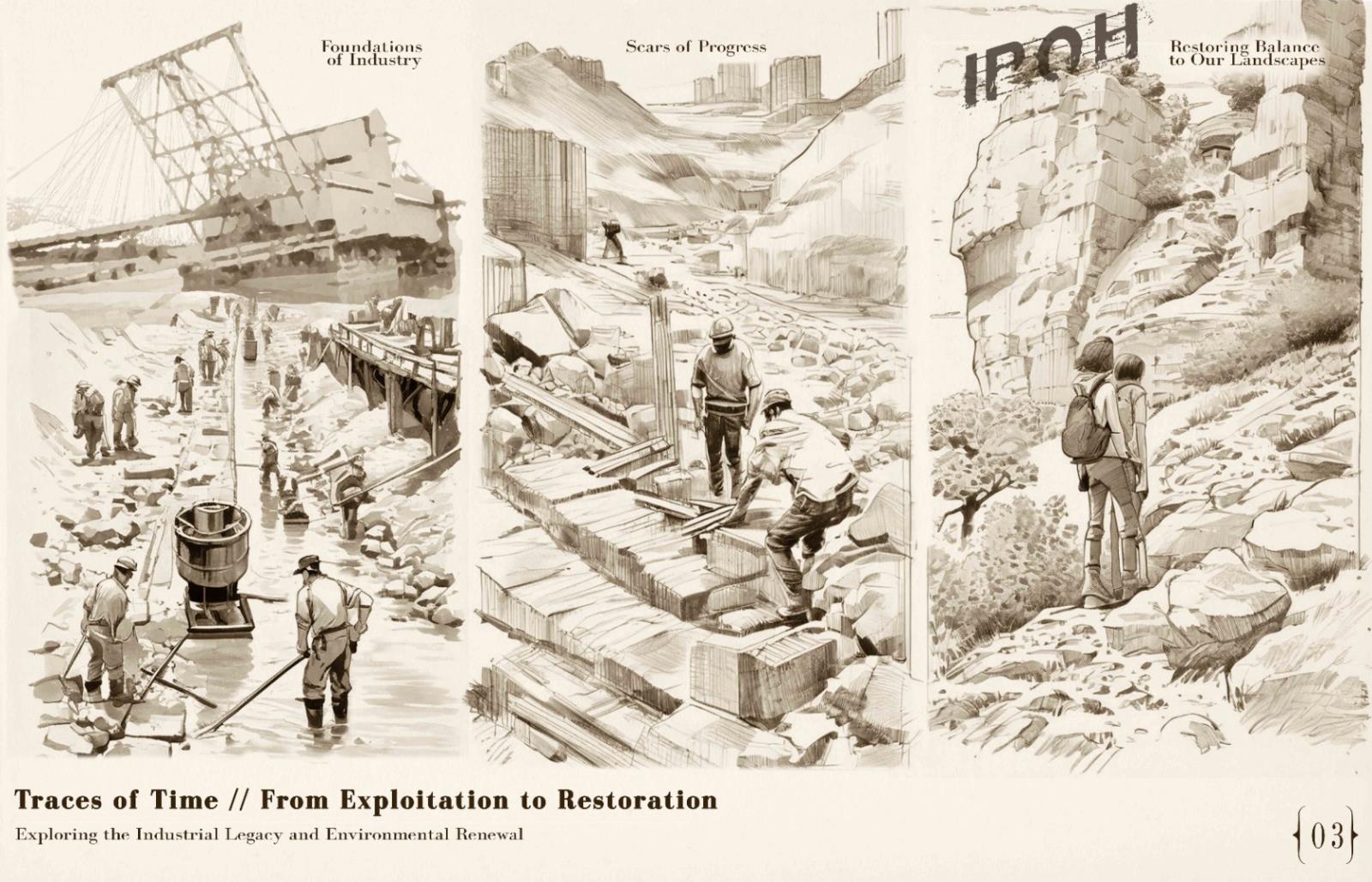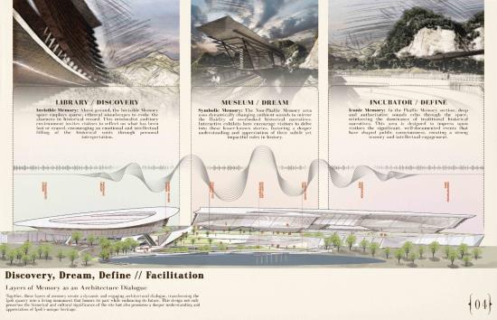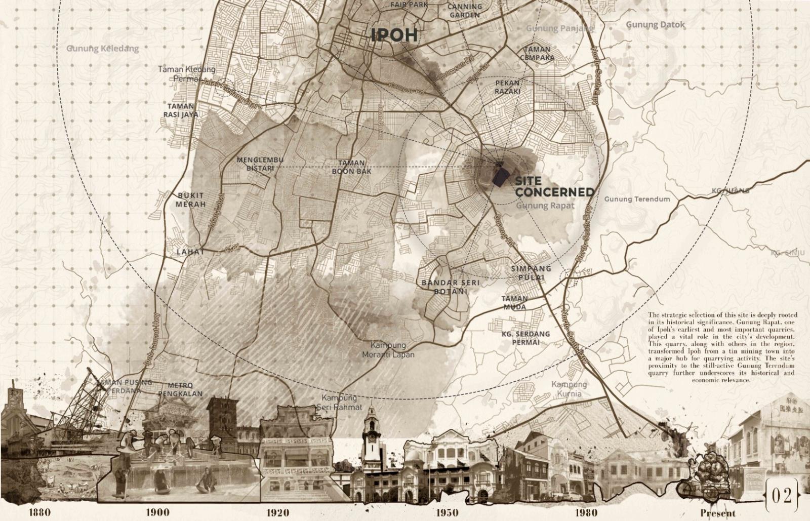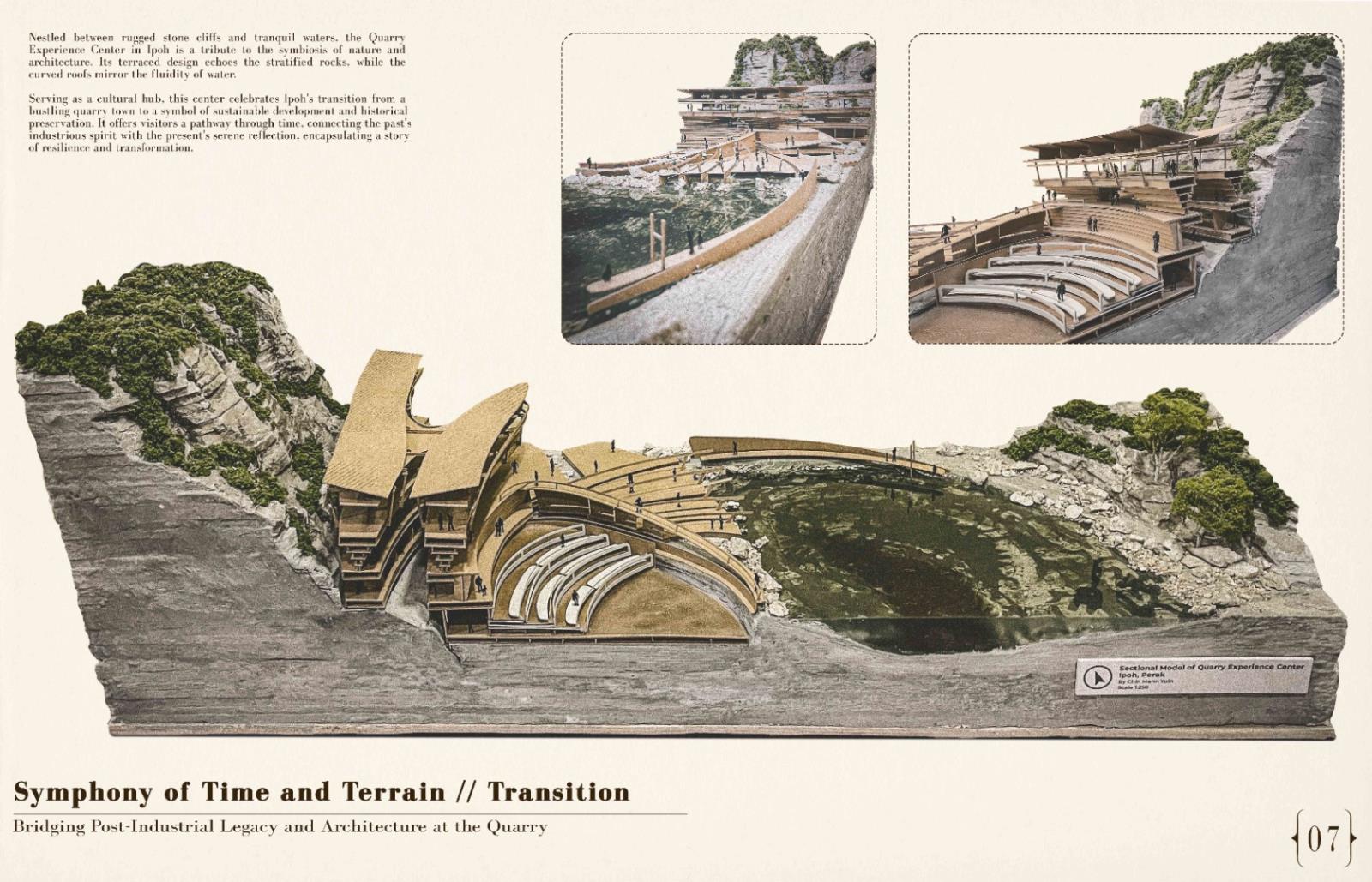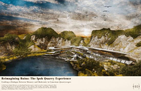 Reimagining Ruins: The Ipoh Quarry experience Part 2 Project 2024 Chin Mann Yuin University of Malaya | Malaysia The "Reimagining Ruins: The Ipoh Quarry Experience" project transformed an abandoned limestone quarry in Gunung Rapat, one of Ipoh's earliest and most significant quarries, had long been depleted but remained connected to the active Gunung Terendum quarry near the North-South Highway by Simpang Pulai. This endeavor aimed to revive and rejuvenate the area, deeply rooted in Ipoh's quarrying history. By integrating the natural topography with innovative architectural elements, the project created immersive spaces that narrated the quarry's rich heritage.Pathways traced historical routes, offering visitors interactive and reflective experiences while highlighting the geomorphic characteristics of the quarry. The design fostered an aesthetic that evolved from the natural surroundings, promoting both sustainability and community engagement.The center provided recreational activities, enabling visitors to connect with nature and fostering an appreciation for the region's natural and cultural heritage. It also enhanced Ipoh's tourism value through educational exhibits, countering the perception of environmental degradation. The project exemplified how thoughtful design could merge history, sustainability, and community, ensuring the quarry's legacy endured for future generations. As a beacon of hope, the Experience Center renewed the spirit of Ipoh’s landscape and heritage, making it a pivotal site for cultural and environmental education. Tutor(s) Mastura Binti Adam Zuraina Leily Awailudin Zulkhairi Md Zain