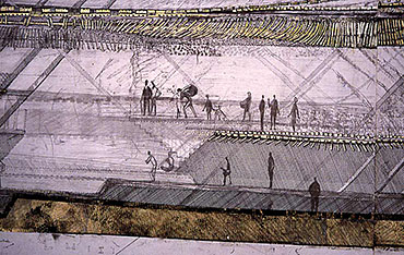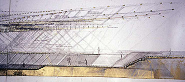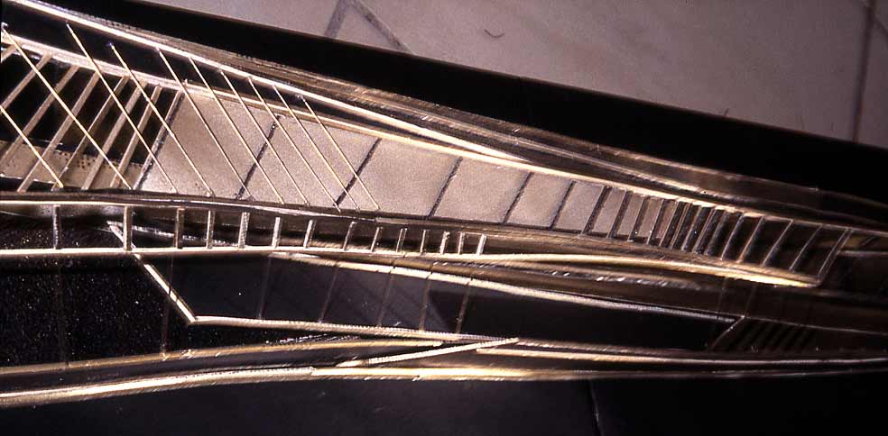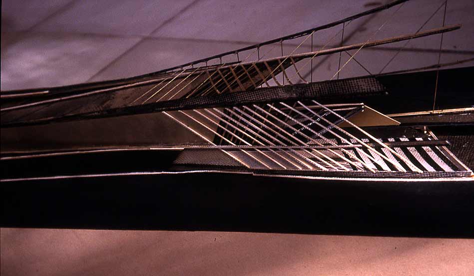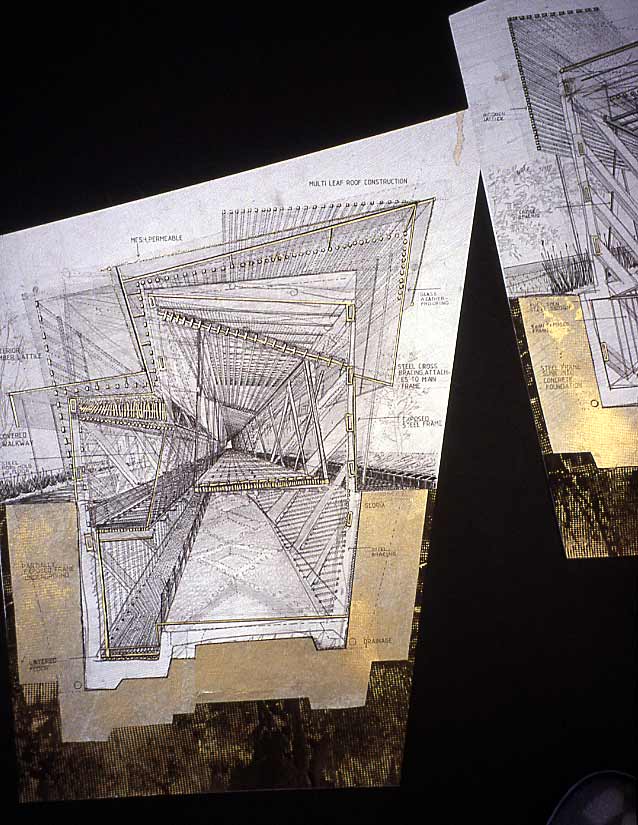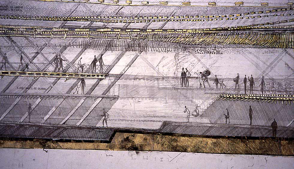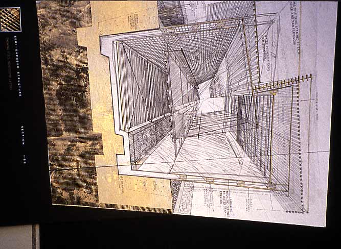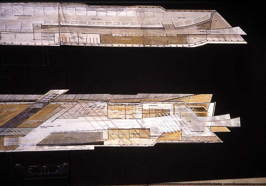 Antigone: the architecture Part 1 Project 2002 Lucy Marie Gauntlett University of Auckland Auckland | New Zealand Reflecting on the Greek tragedy Antigone, written by Sophocles in the 4th century BC, my architecture seeks to explore themes of fate and choice through the material imagery of tracks in the earth. Throughout the play the characters often chose the path they knew would lead to inevitable doom: “You chose to live, I chose to die . . .” (Antigone, line 626). In most cases the path of their difficult fate is transferred to other characters in a rapid, moving ‘ripple effect’. The path or ‘track’, representing the individual character’s line of fate, is repeated, echoing familial entrapment in history. The constant motion of fate is most apparent at four burial points, where characters cross paths and meet. Near the end of the play Antigone kills herself and due to this Haemon kills himself, then his mother kills herself due to her grief . . . The sectioned architectural design enacts the characters’ individual tracks (imprints) in the ground shadowing their tragic lines of fate in the play. At various points in the sections, the tracks overlap, as the characters interact and cross paths (in particular at the four necropolis points indicated in the section). These specific burial sites are also recalled in the section where the verticals of the main steel frame are exposed and formally echo the characters’ tracing of destiny. The sections represent a material apparition of the transient, linear imprints in the ground.Referring to the constant and inevitable movement of fate throughout the play, the architecture became functionally connected to movement through rail travel. Lines of movement that only briefly pause. The train tracks interact with the architecture moving and pushing through the side of the building. The platform is sunk six metres into the ground in a prosaic repetition of Antigone’s burial cave where people wait for the inevitable tracks of fate. Within the architecture are large ‘market places’ where people meander leaving their own traces and tracks within the criss-crossing network of the building. The plans are influenced by a series of initial ‘drawings’ which materially constructed the paths of the characters from the play. The linearity and formal matter of these ‘drawings’ informed the architecture restricting the waveforms in a disciplinary move of propriety. The material nature of the ‘drawings’ was followed as it rose from and excavated surface resulting in an architecture which is partially sunk into the ground as Polynices was lightly buried in the desert. The atmosphere of the subterranean parts of the design is drawn from the necropolis sites allowing the transient passengers a feeling of ‘ascension’ after a ‘burial’.Structurally, the repeated steel frame produces a skeleton, (the stripped body revealed), and double leaf walls are formed from a combination of mesh layers, glass and ‘steel honeycomb’ in a valedictory and partial cloaking. Structure and surface amalgamate to produce a shifting moiré effect which illustrates the main themes of movement as well as performing functions of weatherproofing. The material details, constructional patterns and structural arrangements are intended to support the spatial enactment and ‘vraisemblance’ that is the architecture of Antigone. The story of Antigone, daughter of Oedipus, who defied King Creon and buried her dead brother, is recalled as a myth, a tragedy, and an account of family and societal relationships. A cautionary tale for women, it is told and retold with each generation finding it necessary to construct a new version of the myth. Lucy's design is an architectural account of the ground conditions of Sophocles’ version; the play, Antigone.Set in Thebes, city of seven gates, the drama is concerned with a forbidden burial for the dead and an interment of the living within rock. From the war torn foundations of a city to an everlasting interiority the architecture navigates between the ground of living and the flight of vultures that hovered over the dead.George Steiner wrote of the effects of Antigone on the audience: “We do not leave purged. We leave the play desperately off-balance. Yet in that disequilibrium, as we try to gain purchase on unanswerable fundamental issues, the very condition of disequilibrium has a kind of tensed dignity, a kind of bracing compulsion. We know that we must ask again.” Lucy’s architecture of Antigone addresses disequilibrium through patterns of ground movement within the play. Following Paul Carter she imagines an architecture that is inflected by a responsive ground; one that indents to receive Polynices’s body, that echoes the folds in the chiton of Ismene and the singular logic of Antigone. Rather than a ground that bears the weight of anticipated constructions this design suggests an entangled and active relationship between architecture and earth. Attending to the materiality of the earth condition a series of interwoven tracks are plotted and twisted together. The dust of burial, the mud of tear and blood soaked ground are allowed to carry out momentary formal containment. The linearity with which Lucy’s structures the design cannot be reduced to ideal form in this very material project.Antigone is also an anticipation of the complications of gender that are enacted within and by architecture and this project is a delineation and refusal of a traditionally gendered couple; structure and ornament. The act of lavishing care on the enlarged sections ostensibly to attend to disciplinary requirements of structural and constructional competence also turns out to be a highly ornamental procedure. Judith Butler has suggested that the figure of Antigone might compel a reading that challenges structure in her refusal to conform to the symbolic law. Structural work in this project, becomes an ornamental under