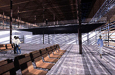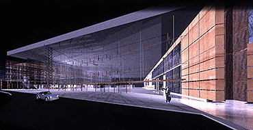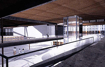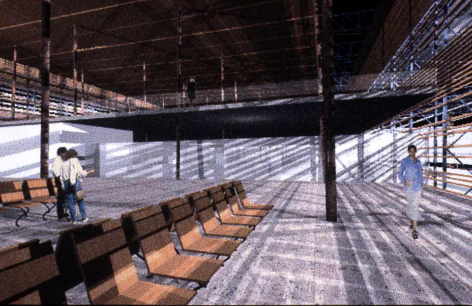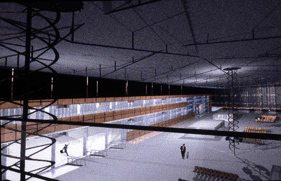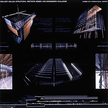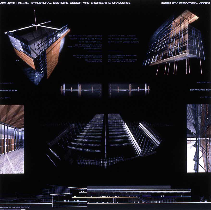 Quebec City International Airport Part 1 Project 2002 Gabriel RivestJean-Nicolas Faguy Universite Laval Quebec | Canada The traveler’s imagination takes off with his departure, and it ends only at his arrival. A clear perception of the moment and place of departure and arrival is thus a necessary condition for the traveler to have a meaningful experience of travel. This spiritual duality –departing and arriving- marks both the traveler’s crossing of borders as well as the orientation that has been given to the project’s design. Two distinct boxes will help synthesizing and materializing this duality.Like the two worlds they represent, the boxes are different both in terms of the structural system and the envelope which compose them :- the departure box, which raises feverishly to the sky, is made of a non structural skin, with its horizontal wooden and steel boards pointing towards the sky,- the arrival box, strongly anchored to the ground thanks to a structural skin, is made of three-sided HSS and wooden panels. In both cases, wood acts like a intermediary between the functional character of the airport and its human vocation.Between these two boxes lies the answer to the anguish of the traveler caught between two worlds: it reinforces the formal expression and the spiritual autonomy of two distinct journeys. This is where the fragility as much as the power of the HSS columns are expressed, as they are centrally located, separating the physical and mental paths of the traveler. These precise as well as divergent experiences of departure and arrival then lead to a better understanding of the airport: they also enhance the pleasure of travel. It is on these grounds that the project asserts and expresses itself in a new humanistic interpretation of what an airport could represent.Structural considerationsThe combined use of steel and concrete allows a decrease in the sizing ofn the supporting elements and offers a solution to the problem of steel's fire resistance. The use of concrete confined in HSS' endows steel with new possibilities; this process served as the building block of the structural system.The main column, although standing 18 meters tall, acts as a sequence of short posts. The number of cycles of the spirals determines the length of the post as well as its slenderness. It is therefore possible to regain, through the spirals, the weak buckling loads of the central post (2% x load / distance between two half-cycles). The combination of materials, according to their strengths, will allow us to save energy and materials in years to come. The industrial production will, in these terms, be a lot more considerate of the environment and of future generations. It is with great pleasure that I submit for your appreciation the project aforementioned. For our School, this project is of great importance because it confirms the interest and the creative potential of our new “Construction and Design” concentration in which it was produced. The pedagogical approach we developed in this new concentration aims at integrating conceptual purpose and realistic materials in the design process.The project was bestowed with an Excellence Award in the ACSA/STI Hollow Structural Sections Design and Engineering Challenge - Airport: Gateway to the City. It is a remarkable project in the way the materials and techniques articulate the architectural concept.The imposing scale of the airport provides travellers with a highly characterized architectural experience: the grand hall, the departure and arrival docks, as well as the runways. In each of these components, a different material and structural concept is associated. A series of extremely slim pillars, stabilized by an ingenious stiffening system, materializes the important bisecting line which separates the arrivals from the departures. Logical, original and evocative, the project offers new perspectives for airports of the future.Projects like this one, give us confidence in the creative potential, as well as the technical abilities of the upcoming generation of architects. We hope that you share our enthusiasm.
