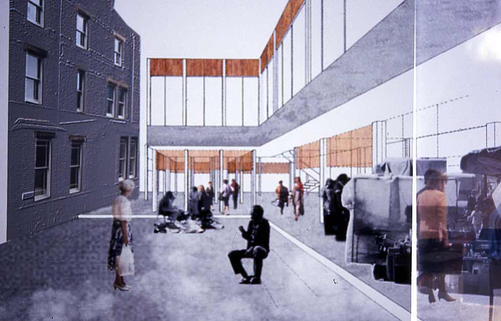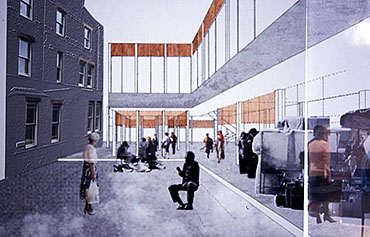 Katerina's project developed from her dissertation work which concerned the theatricality of the modern city, and in particular, the relationship between building objects and urban fields. The passages of Paris, which Aragon and Benjamin write of, inspired her reading of Hoxton Square as an extended territory of intimately-public spaces. Katerina's proposal attempts to develop and to densify the material and spatial conditions of the 'back of house' situation of the rear of the town houses which fringe the square. Her castings of these spaces transform solid and void qualities into densifications of surfaces, liminal and interstitial realms, sites for encounter and exchange. The temporary and transient activities of a market encapsulate the festive and ordinary qualities of the square, and establish a rythm and scale to the events which occur there. This activity is housed in a collapsible structure of timber walls which are flat-packed when stored and open out to become urban furniture and settings for action when in use. The densification of the site is further exaggerated by the concret walls which act as structure both for the 1st floor market galleries and also create a barrier and entrance to the square. The combination of solid and lightweight construction denotes ground and vertical conditions, city scape and private realms. The housing across the newly landscaped square also plays a part in this material exchange. It comprises, similar to the market structure, earthworks and public territories as well as suspended private rooms. The malleability of the architectonic faacdes of the buildings enable participation with the architecture of the square. The twin conditions of city living, the intimate and expansive, are exposed to each other.
