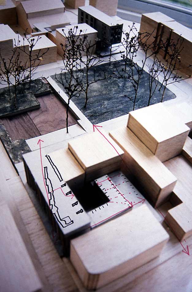 The buildings sit quietly, they become part of the city fabric; at the two opposing sides of the square they form a dialogue. The garden is the space that physically separates and connects them. A series of rooms is created along the site. The in-between spaces; passages as thresholds between the square and the courtyards, the site and the city. The 'empty spaces' become as important as the buildings themselves. It is there, where public meets private, where positive meets negative. Atmospheres of transience and stillness come to unfold as one walks along the site. All rooms are related, one fulfills the other.