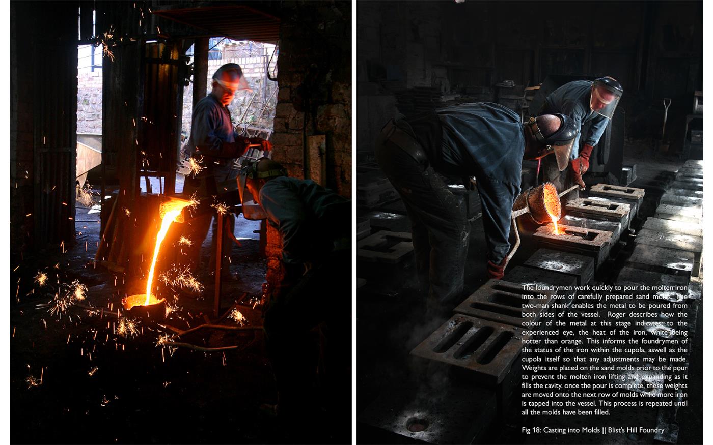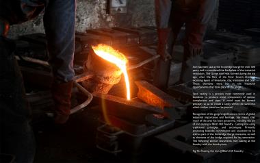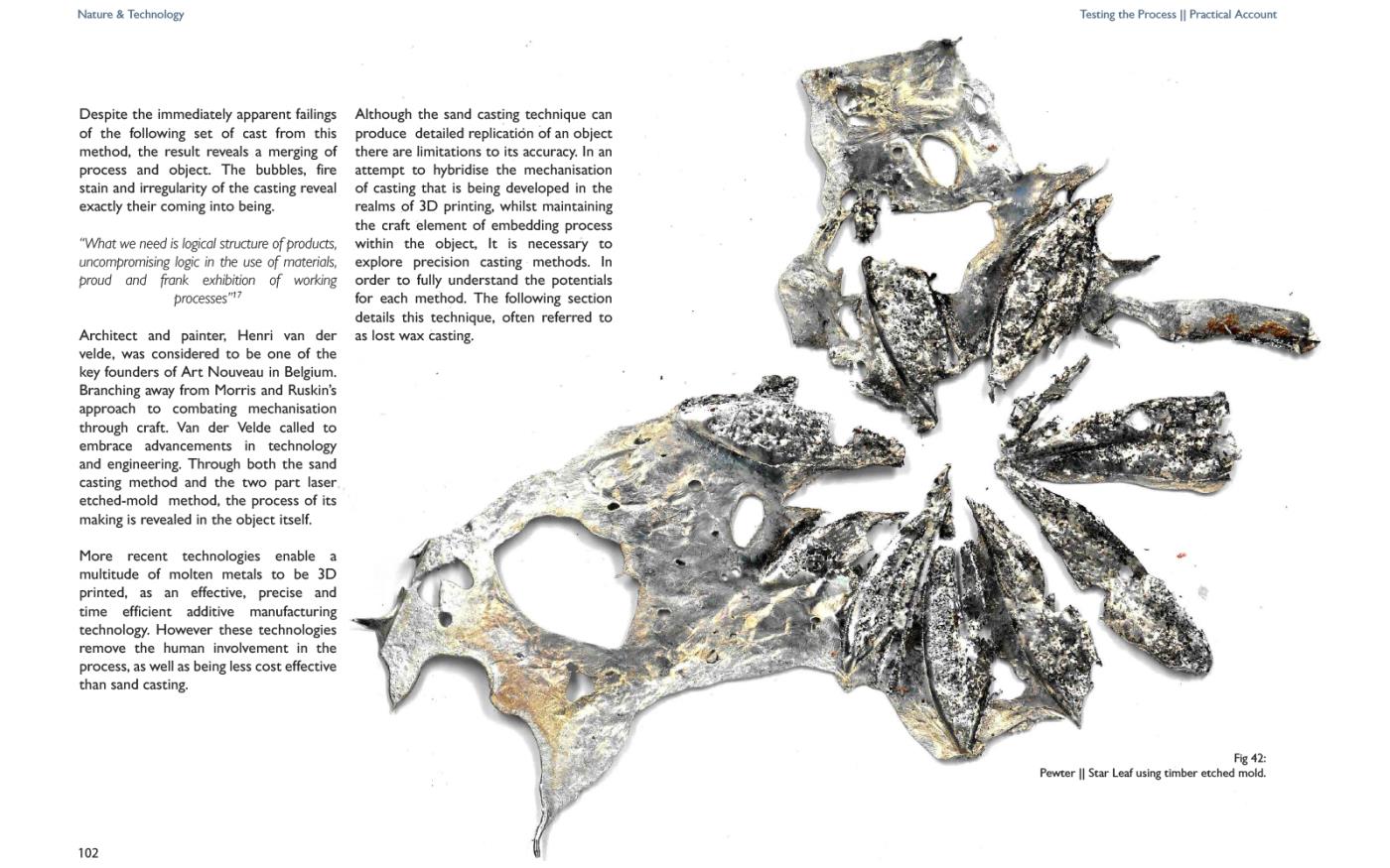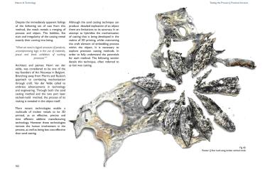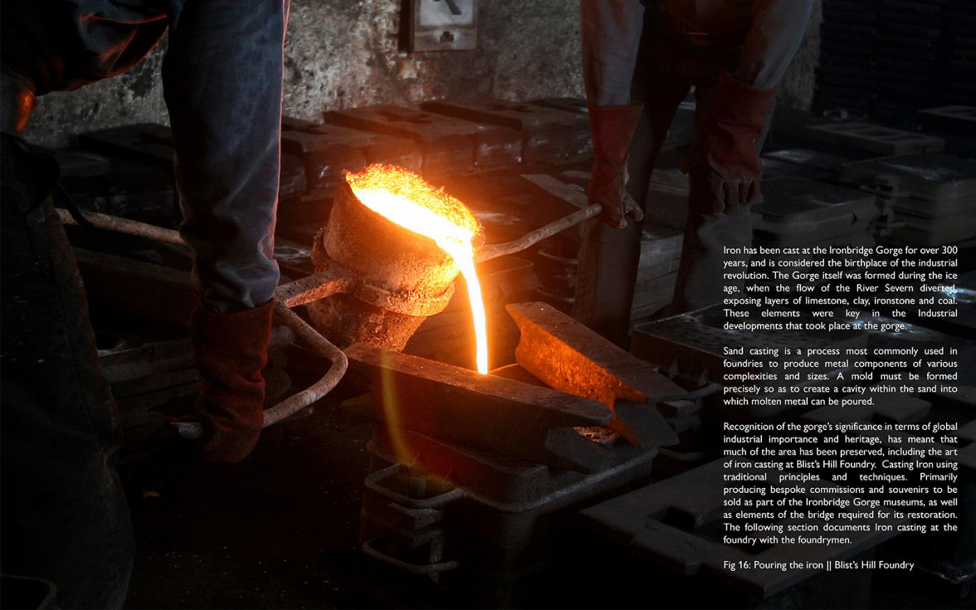 Metal Casting – Material, Craft & Place. A study in the role of making in building narrative expression Part 2 Dissertation 2019 Bronwen Chatwin Birmingham City University | UK This study aims to enforce the connection between the designer and maker, focusing on metal casting as a means of producing architectural elements. Understanding the manipulation of metal allows the designer-maker craftsman to bridge the boundaries between material, design and place. In order to comprehend the material and its form, it is important to study the processes by which building elements may contribute towards an architectural narrative through the use of case studies. The dissertation documents these precedents along with rigorous iteration and testing of the casting processes.Due to innovations in casting iron at the Ironbridge Gorge throughout the 18th Century and its impacts on the industrial revolution, metal casting transferred globally to encompass new uses for cast iron both structurally and ornamentally. It is not only the innovative material and its prevalent use that is the focus of the study, but the combination of design process and fabrication that enable architectural storytelling.From sand cast facade to column cladding, to the making of a precise object using lost wax casting, the study culminates in the conceptual and ornamental application of fabrication techniques to a design project for a villa and vineyard situated in The Roman City of Wroxeter. Tutor(s) Alessandro Columbano