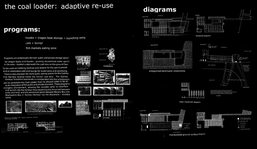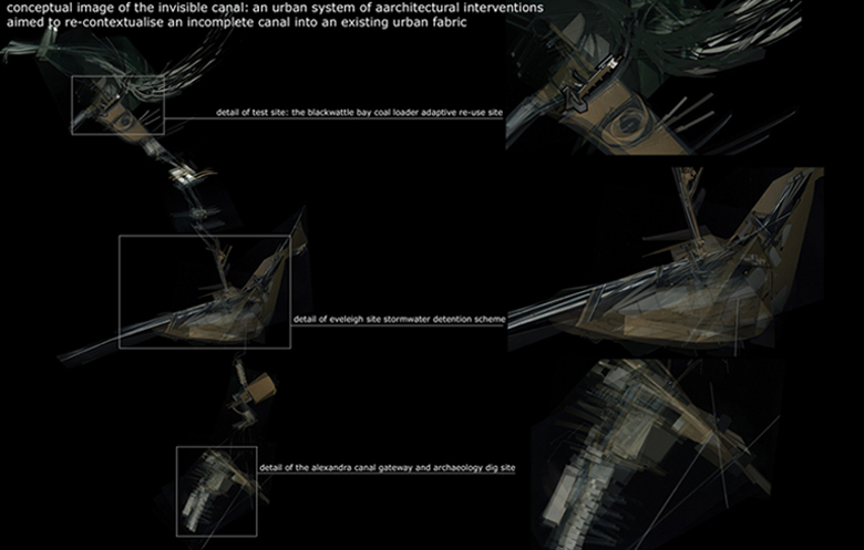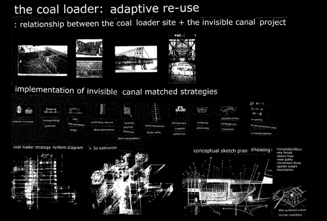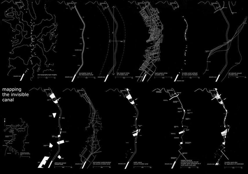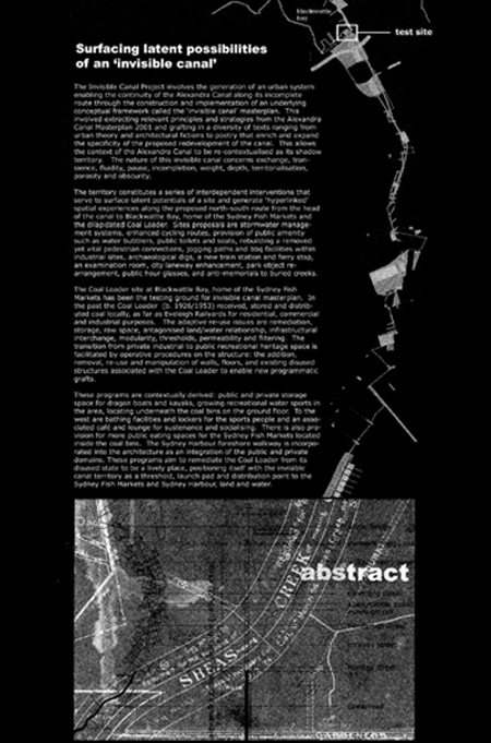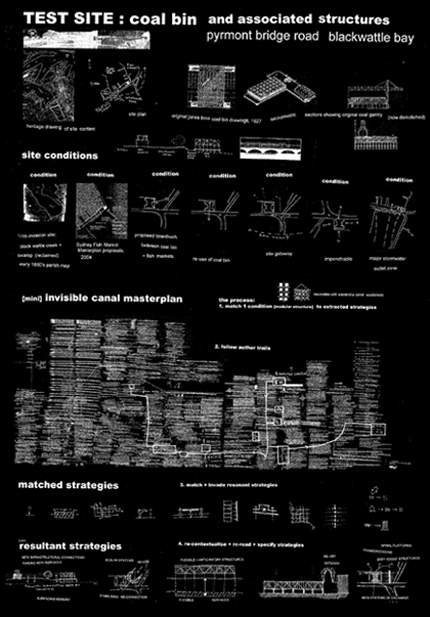 The Invisible Canal Project Part 2 Project 2005 Kris Bird University of New South Wales | Australia The Invisible Canal Project is an urban experiment in reading space as text to regenerate place, inspired by land and memory. The chosen site for investigation is Sydney’s Alexandra Canal, Australia’s most polluted water way, intended as an inland maritime route from Botany Bay to Sydney Harbour. This idea forms the project’s conceptual spine. It allows an interpretive reading of the lands between the canal and Sydney’s Fish Markets, which was mapped, strategised and filtered through a masterplan. As part of an urban system of architectural interventions, a derelict Coal Loader became the detailed testing ground for the project. This project engages with fine grained mapping of place at diverse levels – social, cultural, environmental, urban and architectural. The distinctive premise is that design emerges from the given conditions of place, and may be articulated through opportunities and implications afforded by what is always already-there. This approach permeates the work – from project definition and cartographic analysis, to thematic and theoretical framing, precedent studies, environmental technology and architectural proposition. The Invisible Canal Project evidences a sophisticated process, founded on careful observation and on the quiet and silent potential of architecture to both register and transform the city’s forgotten patterns.