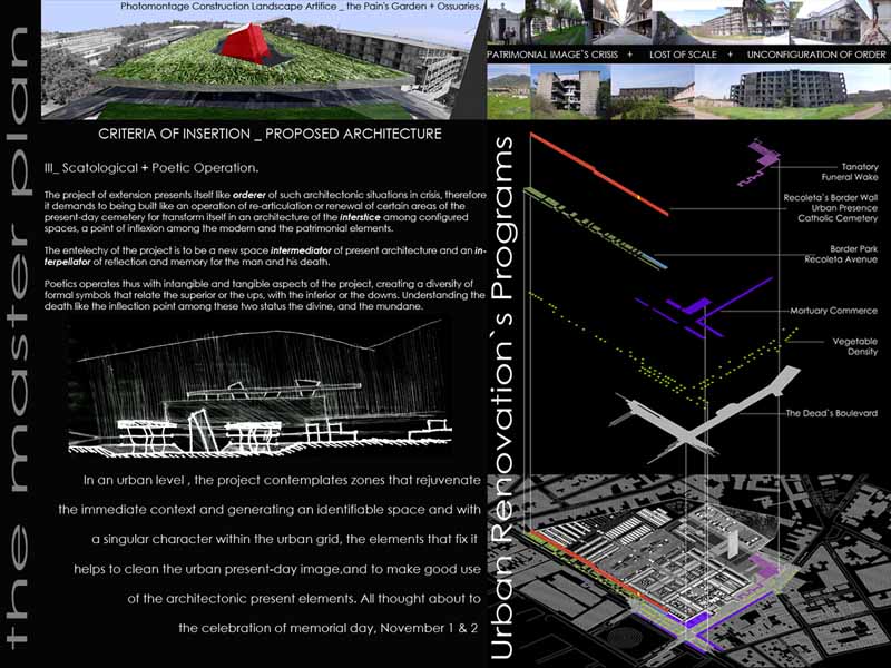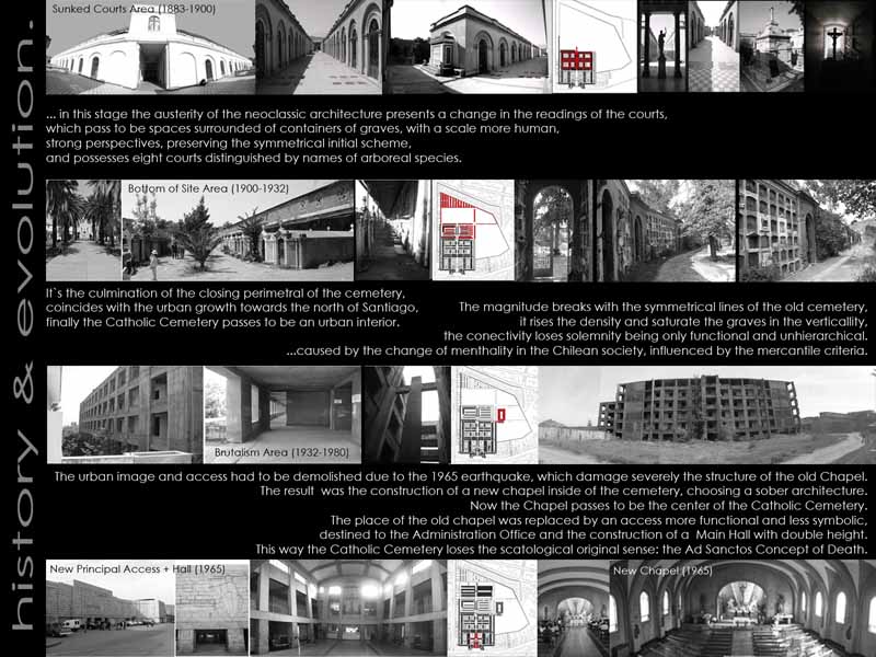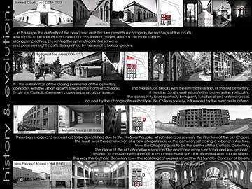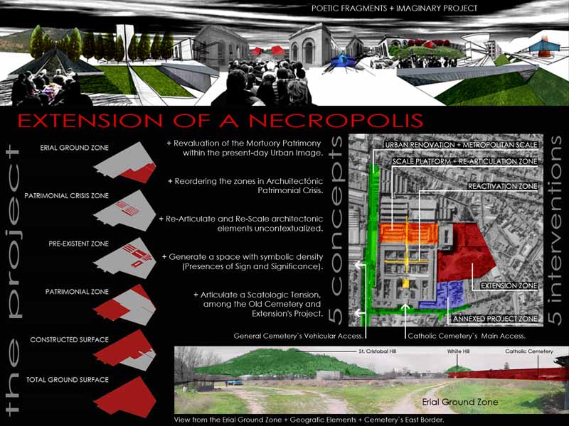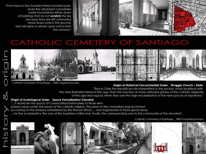 The Extension Project proposes the revalorization of funerary patrimony within the urban context of Santiago city, from the metropolitan scale until the Poetical-Scatological dimension of death in the contemporary occidental society.