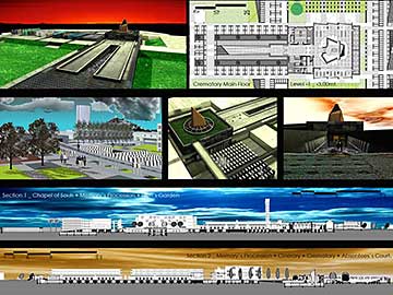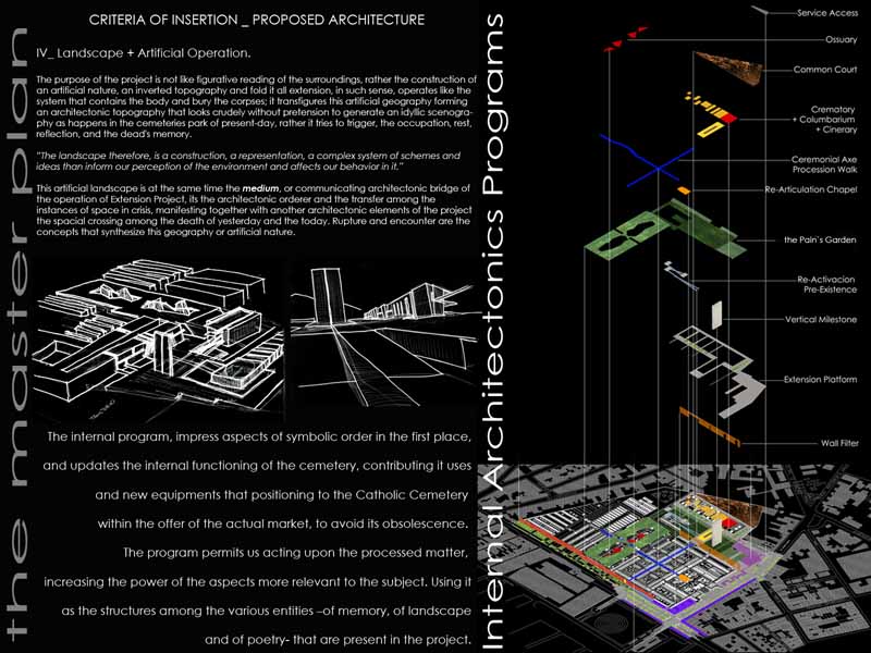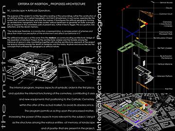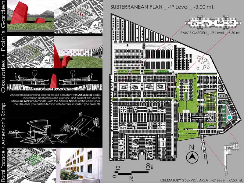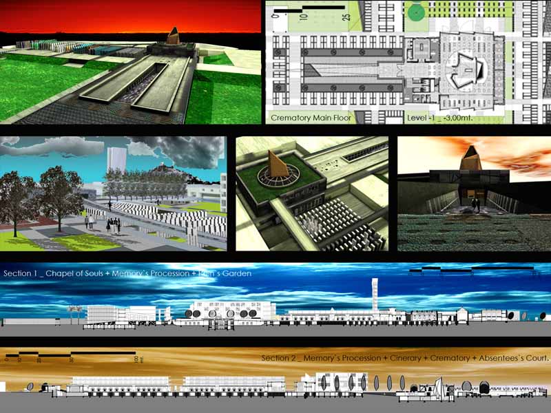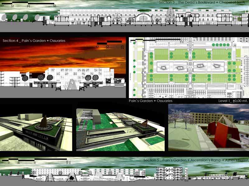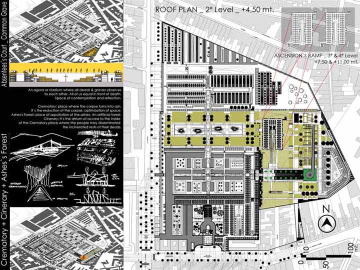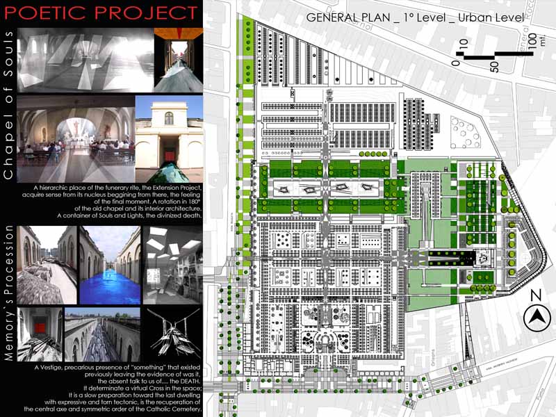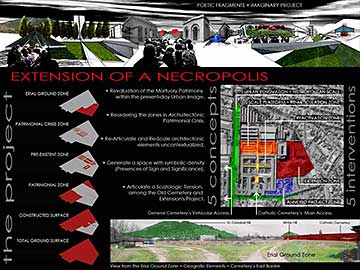 The project re-articulates architectonic situations unscaled within the internal system of circulation and volumetric relations. The functioning of this old cemetery it’s updated to the funeral present-day request with a Funerary Boulevard, Chapel, Crematory, Ossuaries, Columbary, Tanatory, New Graves zones and Green Areas.