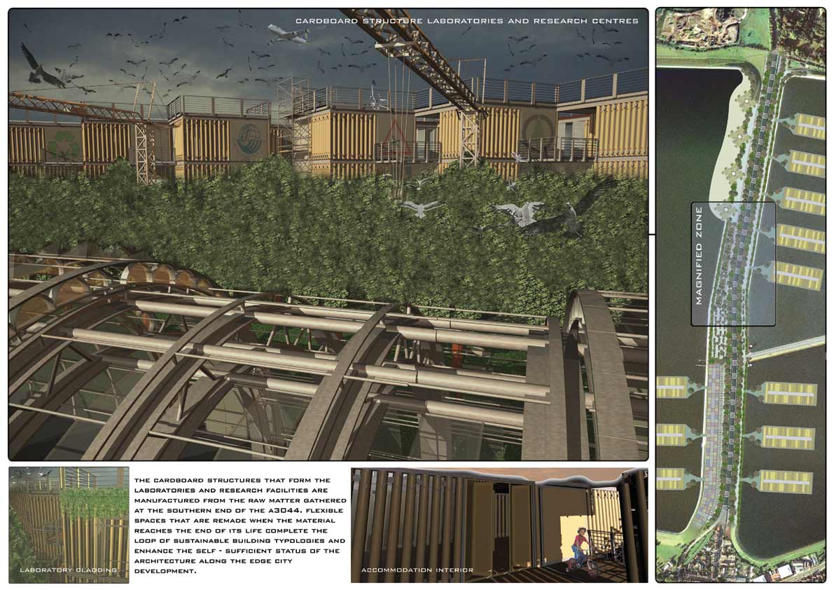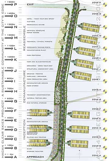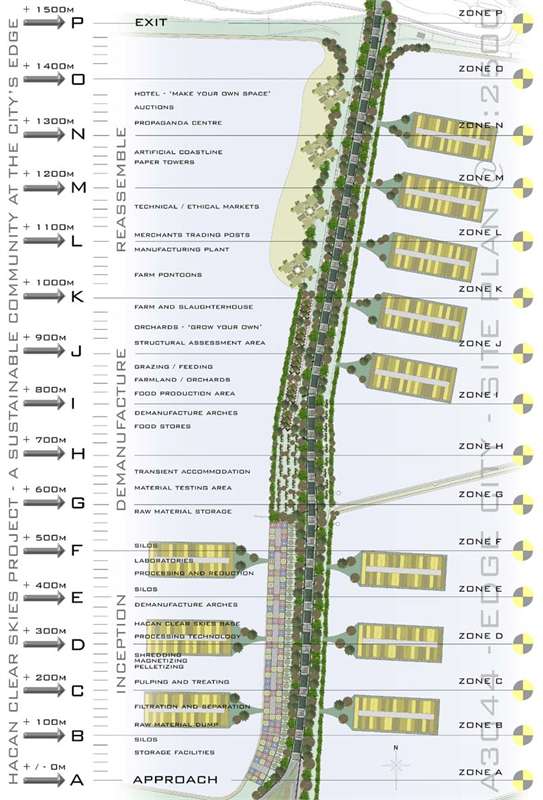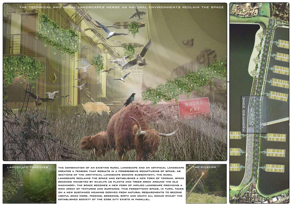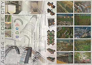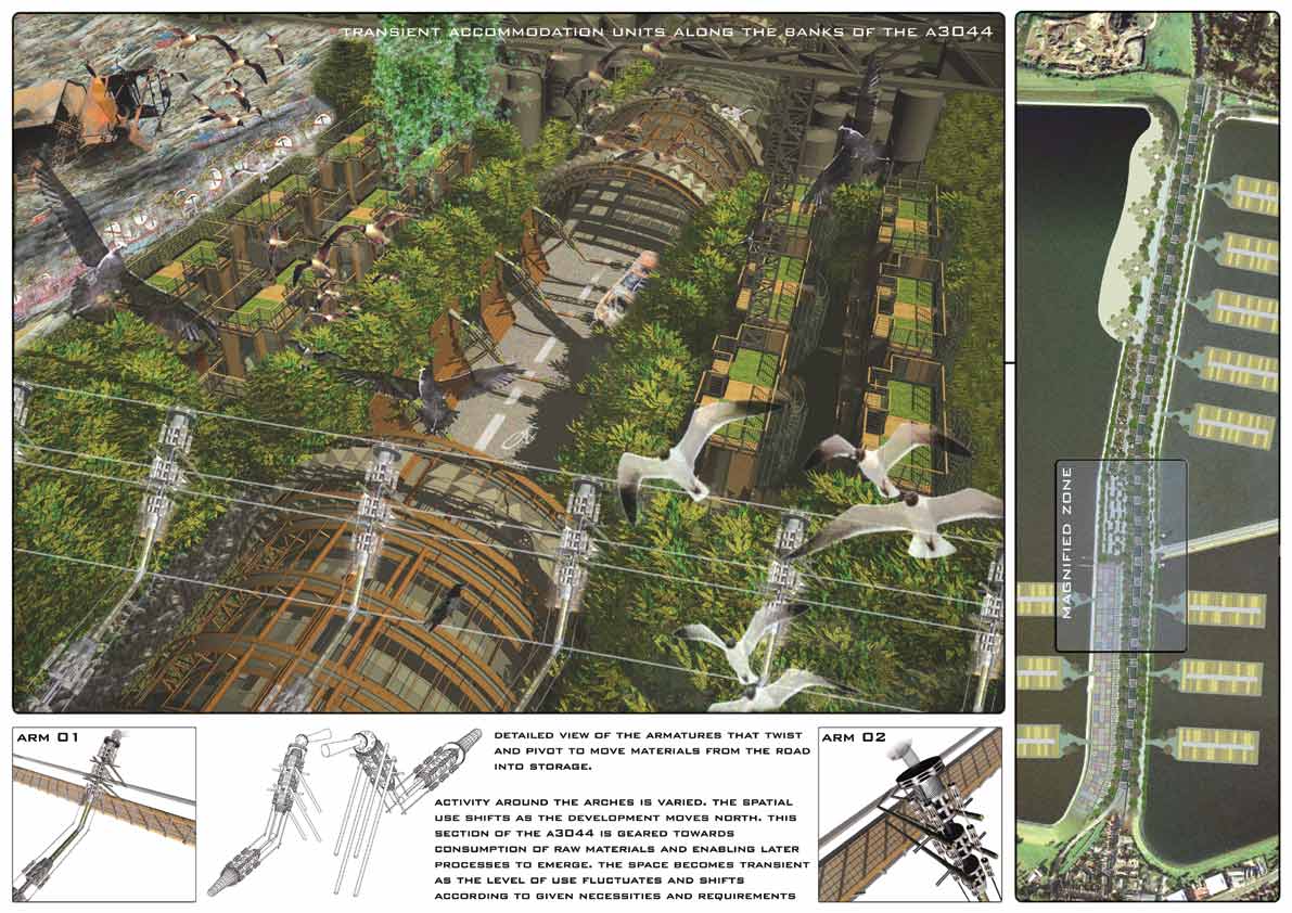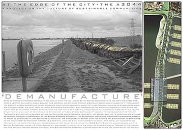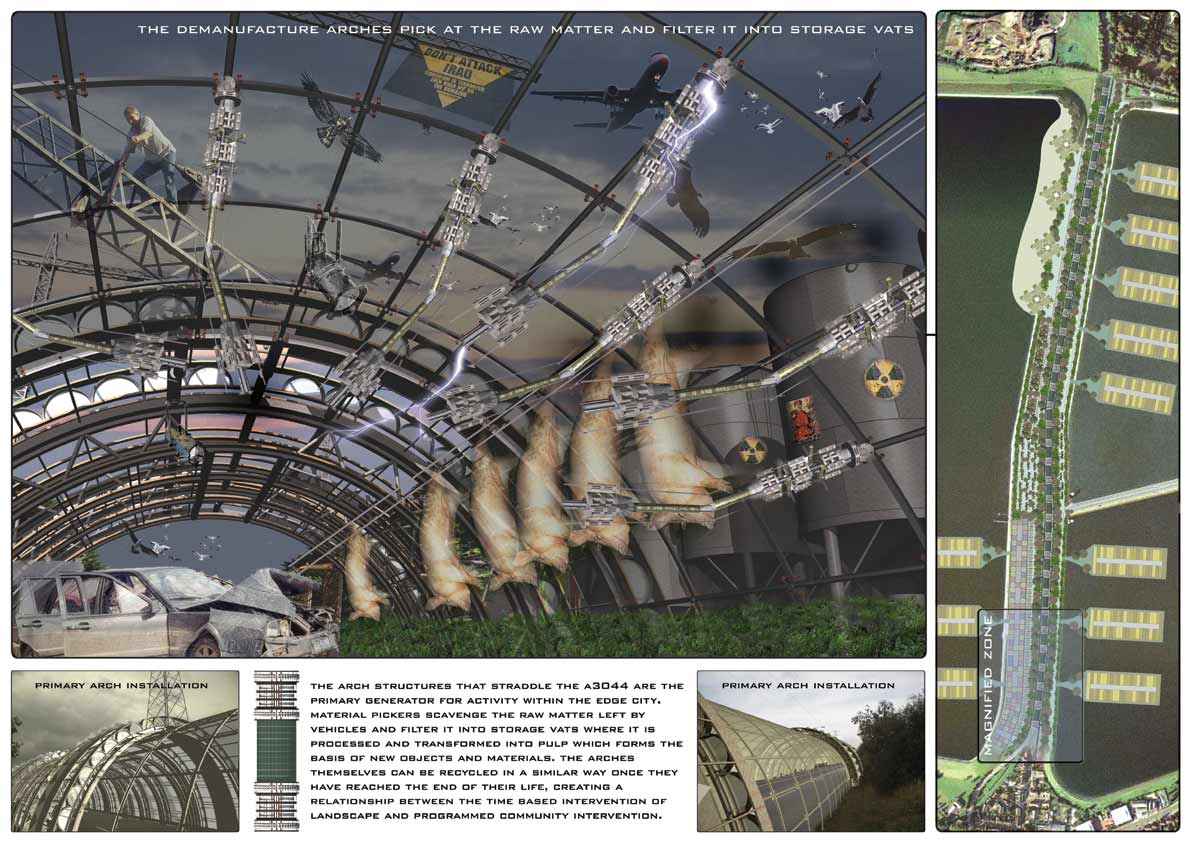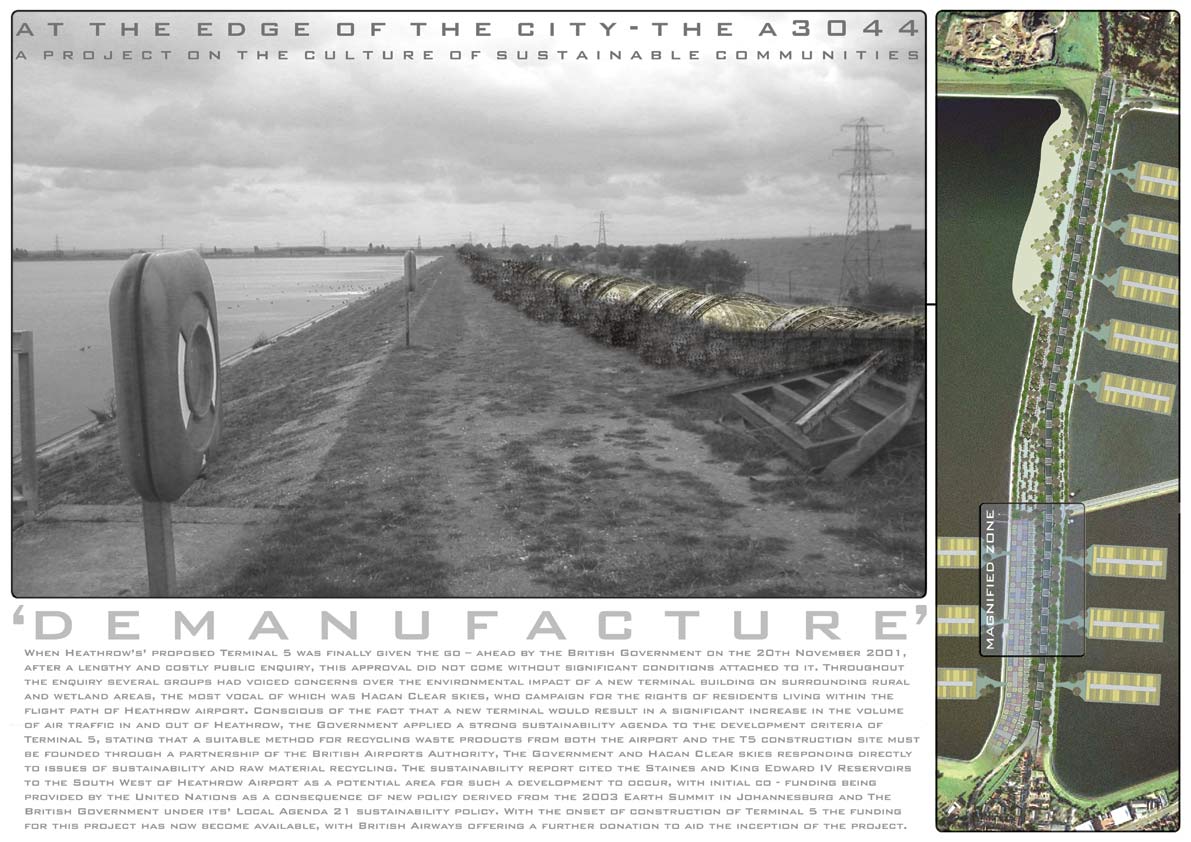 Demanufacture Part 2 Project 2005 Al Morrisey Oxford Brookes University Oxford | UK The edge city; a reproductive machine of multi – layered cultural and architectural personalities. Starting life as a commercial recycling centre, the project morphs into a complex web of social interchanges, becoming occupied and taken over by the landscape whilst being administered by its’ inhabitants. The A3044 Edge city is machine, consumer and producer all at once, taking raw materials and turning them back into products that can be traded or re – used as objects, clothing and new forms of architecture. The ‘city’ is a self – sufficient machine, undergoing continuous change and metamorphosis; a living, breathing organism. Al Morrissey’s expanding and mutating linear settlement on the A3044 between Staines and Heathrow offers a view of an eco-anarchistic peri-urban culture that feeds off waste from a consumption obsessed city. The scheme takes some cues from non-western city edge conditions insofar as it becomes very dense by English suburban standards, it re-recycles to an intensity that is found in shanty towns and it tightly cross programmes urban and rural processes to a create a dynamic local culture that is quite un-suburban in its edginess. These memorable images show architecture absorbed by an array of processes rather than in isolation.