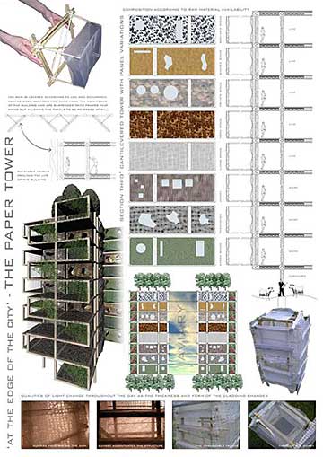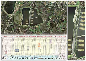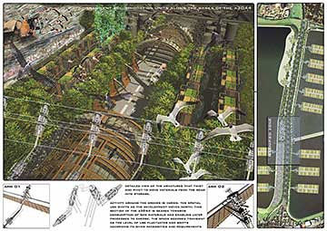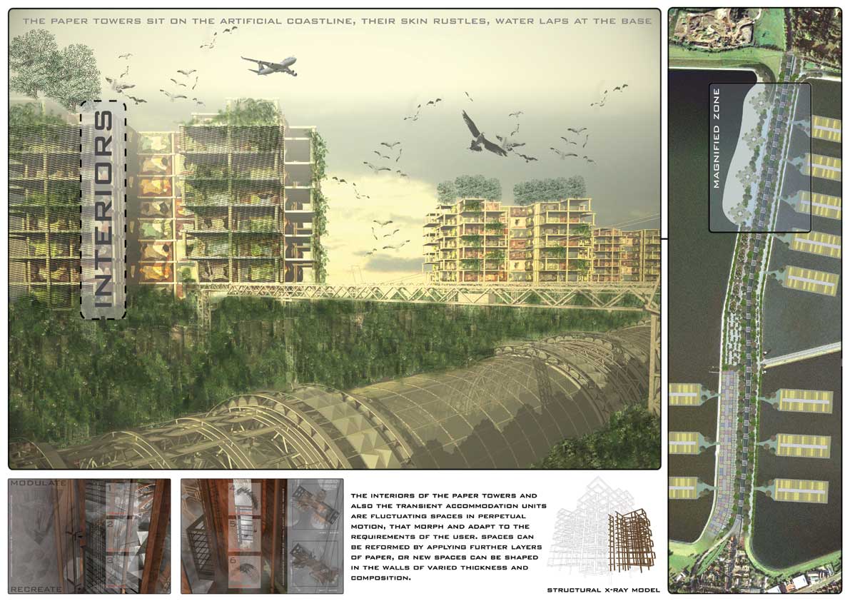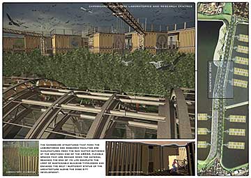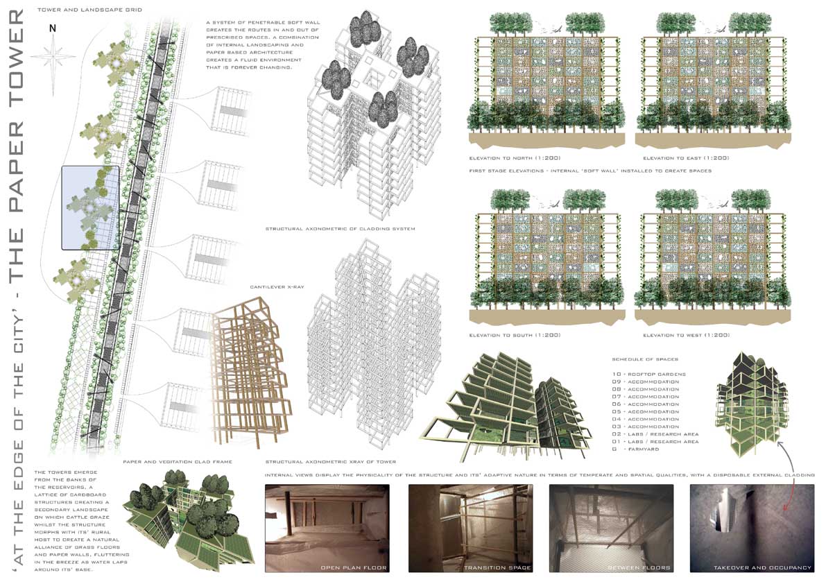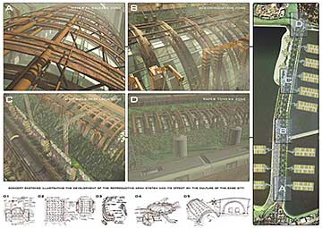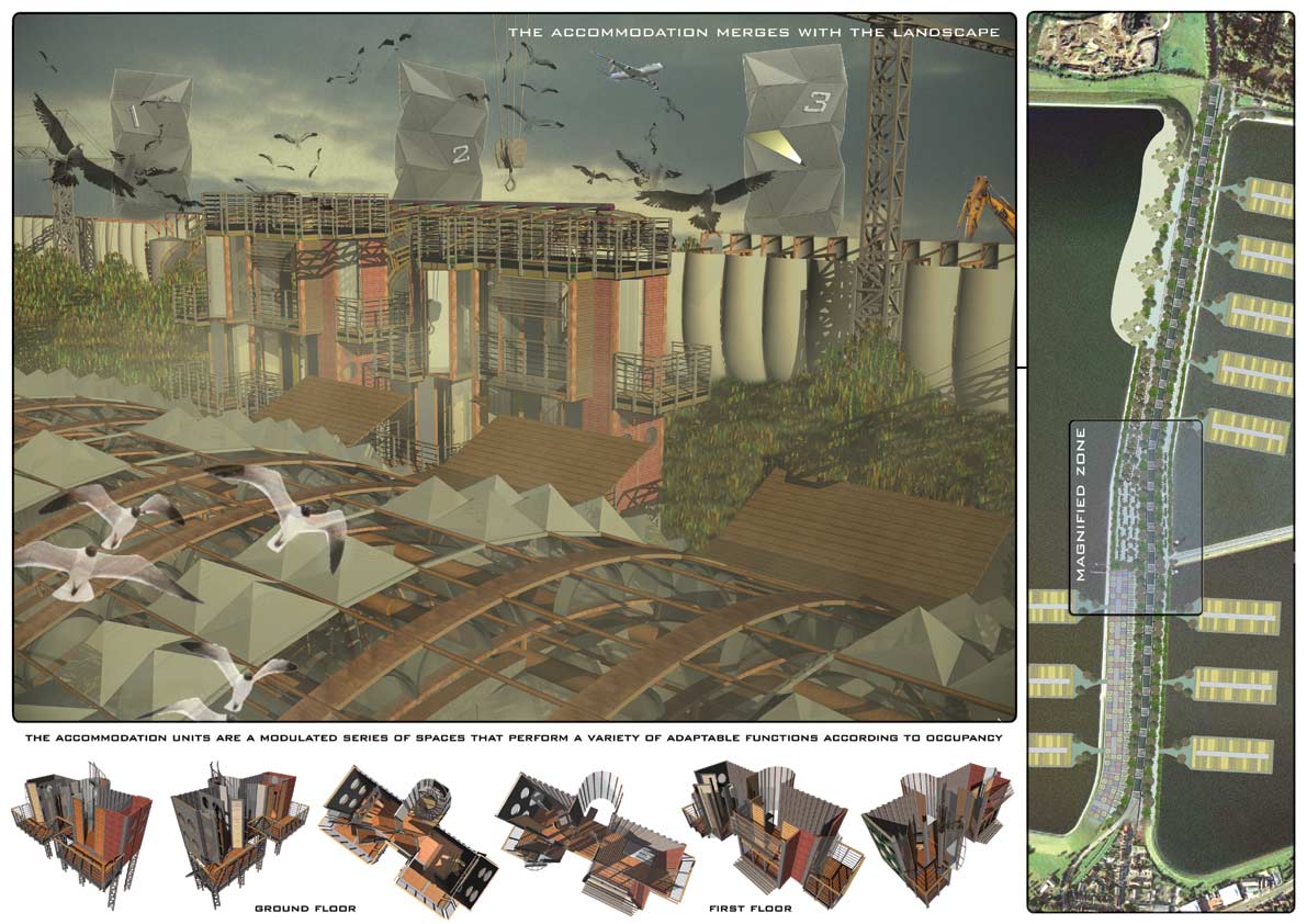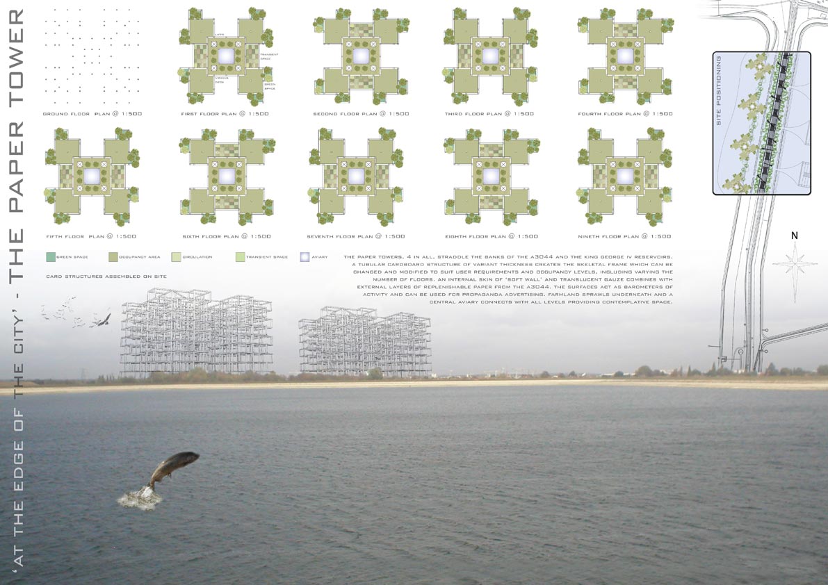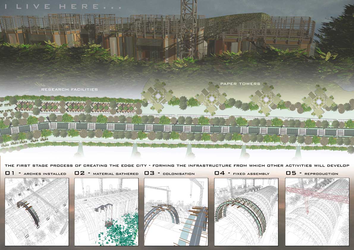 Demanufacture Part 2 Project 2005 Al Morrisey Oxford Brookes University Oxford | UK The edge city; a reproductive machine of multi – layered cultural and architectural personalities. Starting life as a commercial recycling centre, the project morphs into a complex web of social interchanges, becoming occupied and taken over by the landscape whilst being administered by its’ inhabitants. The A3044 Edge city is machine, consumer and producer all at once, taking raw materials and turning them back into products that can be traded or re – used as objects, clothing and new forms of architecture. The ‘city’ is a self – sufficient machine, undergoing continuous change and metamorphosis; a living, breathing organism. Al Morrissey’s expanding and mutating linear settlement on the A3044 between Staines and Heathrow offers a view of an eco-anarchistic peri-urban culture that feeds off waste from a consumption obsessed city. The scheme takes some cues from non-western city edge conditions insofar as it becomes very dense by English suburban standards, it re-recycles to an intensity that is found in shanty towns and it tightly cross programmes urban and rural processes to a create a dynamic local culture that is quite un-suburban in its edginess. These memorable images show architecture absorbed by an array of processes rather than in isolation.