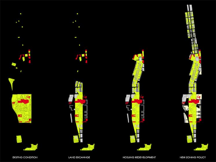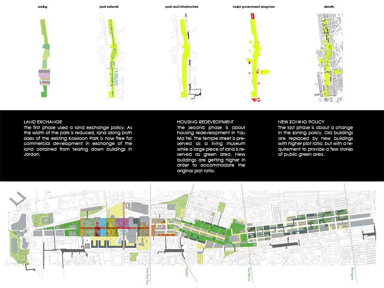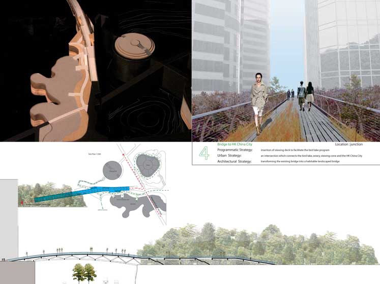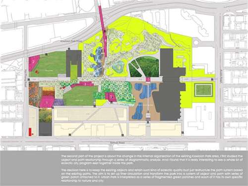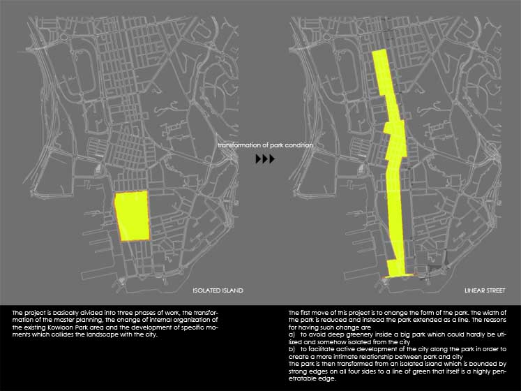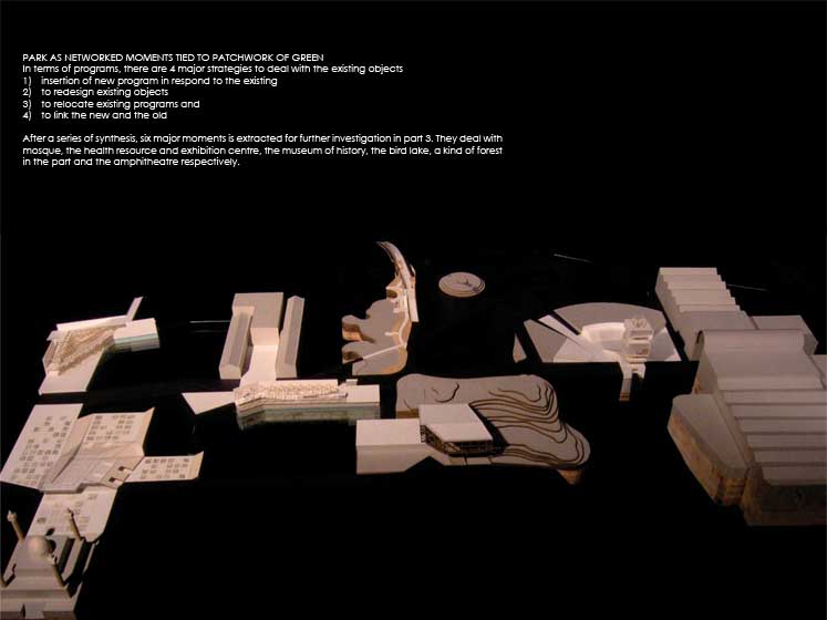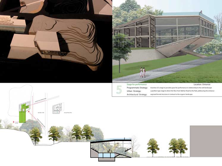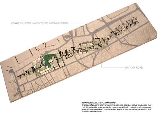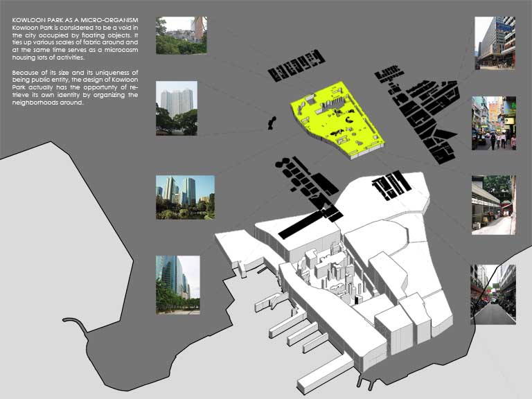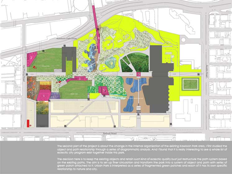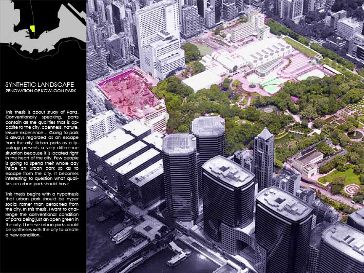 Synthetic Landscape - Renovation of Kowloon Park Part 2 Project 2006 Lau Sun Ming, Kenneth Chinese University of Hong Kong | China Conventionally speaking, parks contain all the qualities that are opposite to city, and going to park is always regarded as an escape from the city. However, Urban Park presents a very different situation because it is always located in the heart of the city. It becomes interesting to question what qualities an urban park should have.This thesis begins with a hypothesis that urban park should be hyper-social rather than detached from the city. I want to challenge the conventional condition of parks being just an open green and I believe parks and city could actually become a synthesis. The project addresses what the notion of a large centralized park might mean in the hyper-dense situation of Hong Kong (or other Asian cities for that matter). Known for its eclectic combination of programs and adjacent to one of the busiest commercial districts in the world, the unique proposal for the site of Kowloon Park has the potential to re-question the division between commerce and recreation as clearly distinct typologies in the formal organization of a city. The project proposes not only new programs that maintain the hyper-social quality of the surrounding commercial districts in the park, but also proposes a new typology for the park as a ‘slow’ infrastructural network.