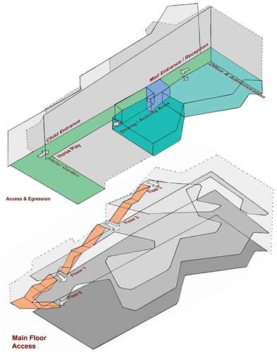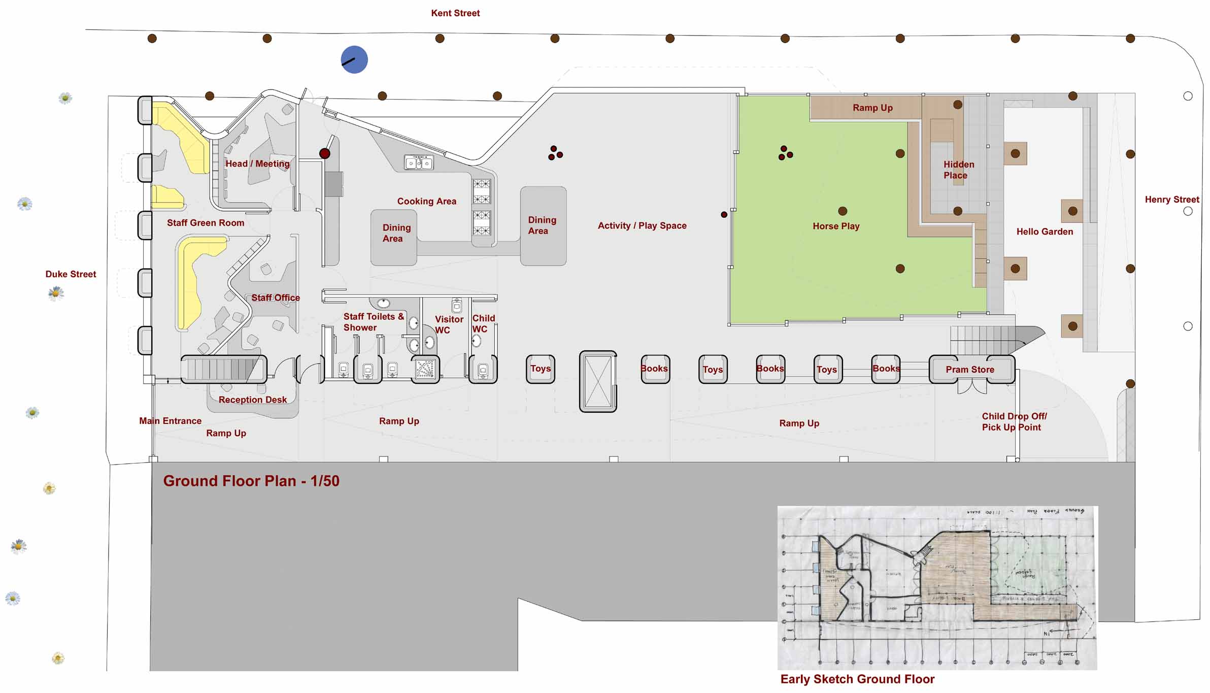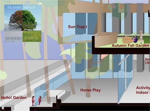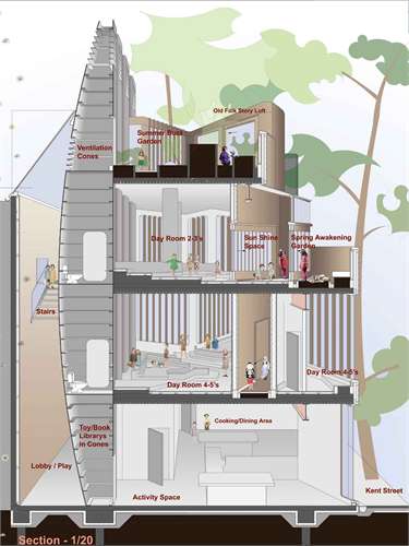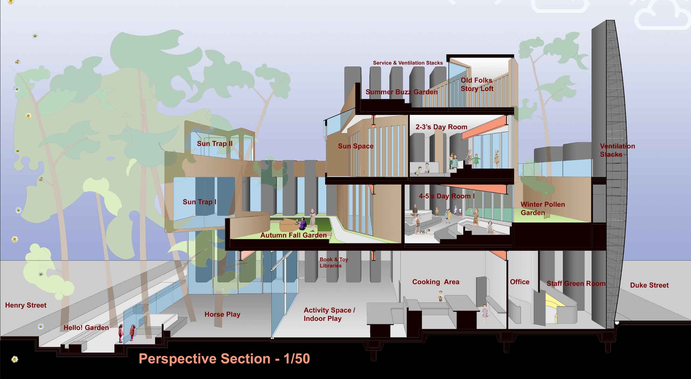 Duke Street Nursery School, Liverpool Part 1 Project 2006 Declan Shaw University of Liverpool | UK A child raised in an ‘artificial reality’ will not develop an adequate sense of spirit or ‘Place’. His alienation may cause erratic behaviour throughout life. It is my aim to provide an architecture which will fulfil a sense of world ‘Place’. Social interaction, space appropriation, organic substance, seasonal change and physical exercise are all vigorously brought to the children through architecture. The building separates the robust and public external realm and the soft and subtle child spaces. The elegant timber day rooms represent mans organic occupancy amid the colossal monolithic steel cones; they represent a spiritual comfort amid the elements. This project explores the tactile and temporal dimensions of architecture. The building offers children numerous possibilities to use its spaces creatively as seasons change. To achieve this, the building is turned into succession of gardens, each related to a specific time of the year and located at different levels throughout the building. Interior space exists only in relation to the adjacent gardens and all, interior and exterior spaces, are intricately connected either visually or physically. This makes experiencing the building exciting and non-monotonous. Furthermore, children can experience nature while being in the centre of a harsh urban environment like Liverpool.