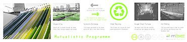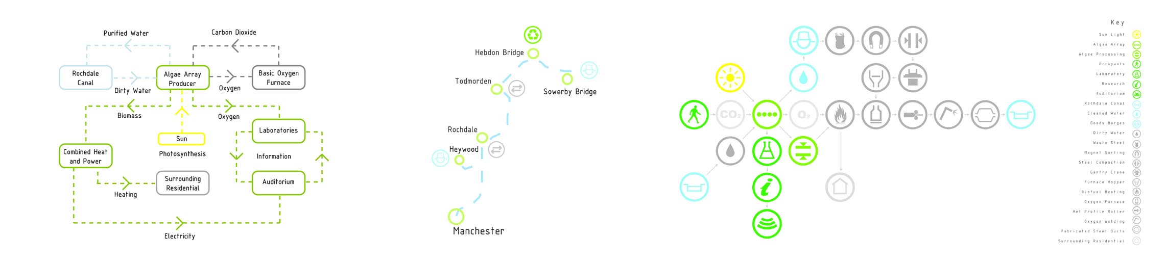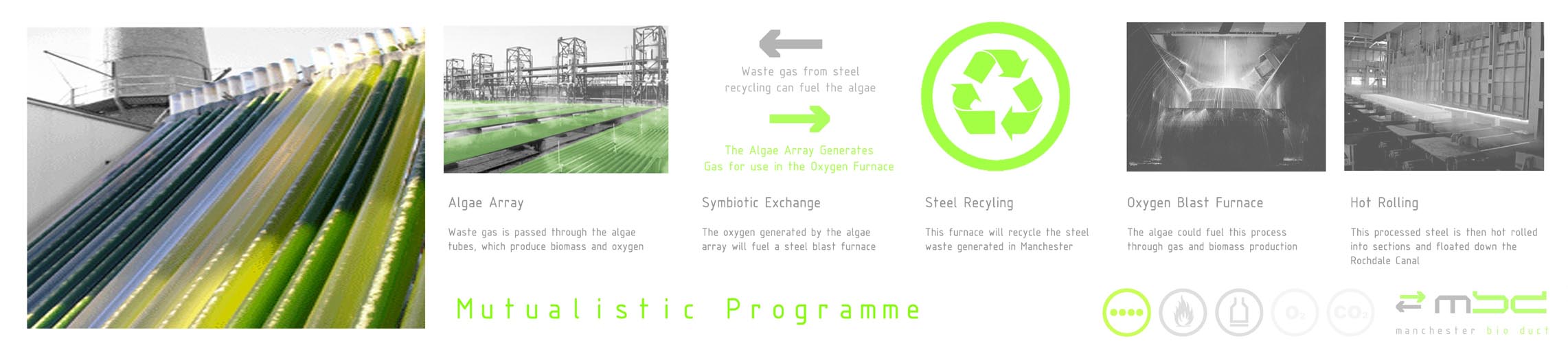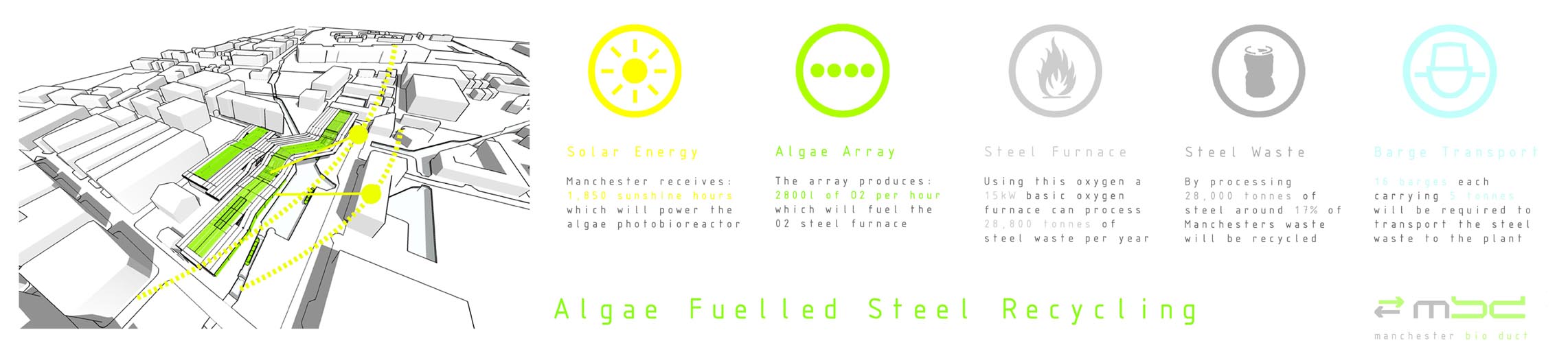 The project uses a roof-mounted algae array to produce bio-diesel that powers a steel recycling centre. The waste product from the photosynthesis of the algae is oxygen, which is a major resource needed for steel smelting, so this is collected and used to produce a zero waste resource. Steel is collected and distributed using the canal network, again reducing impact.