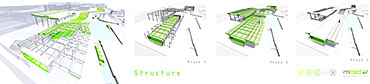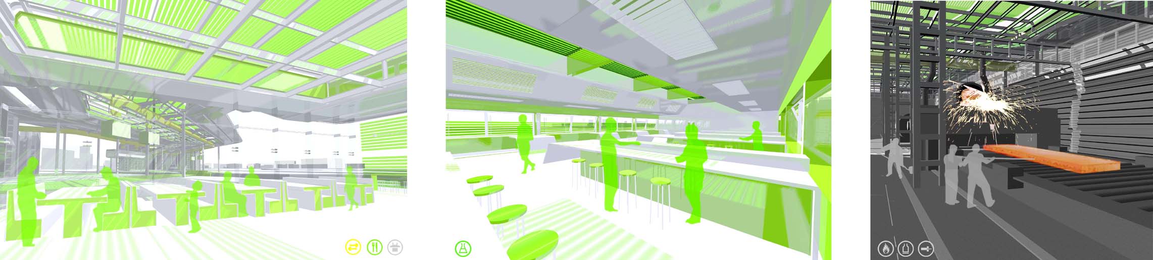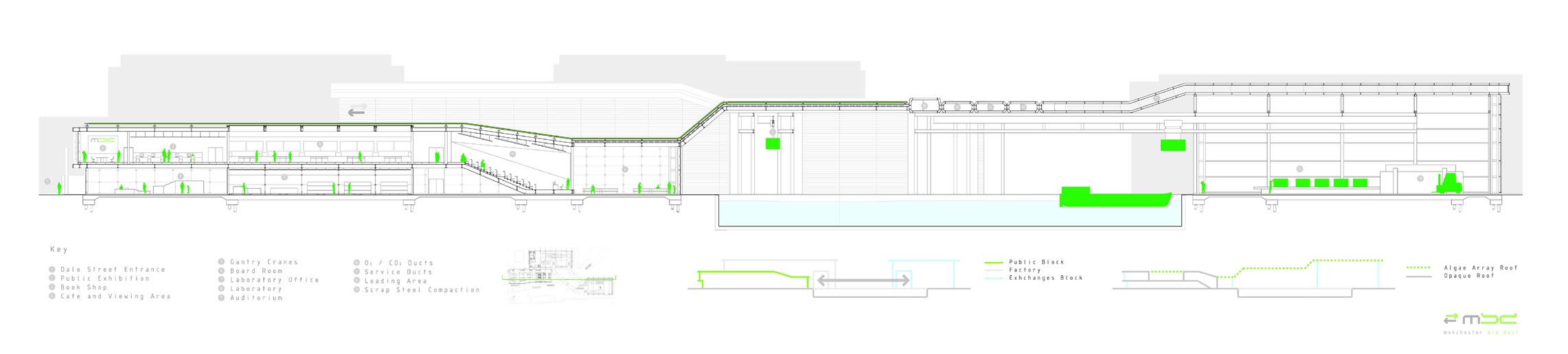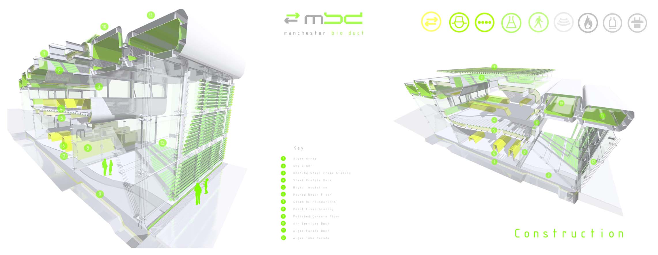 The project uses a roof-mounted algae array to produce bio-diesel that powers a steel recycling centre. The waste product from the photosynthesis of the algae is oxygen, which is a major resource needed for steel smelting, so this is collected and used to produce a zero waste resource. Steel is collected and distributed using the canal network, again reducing impact.