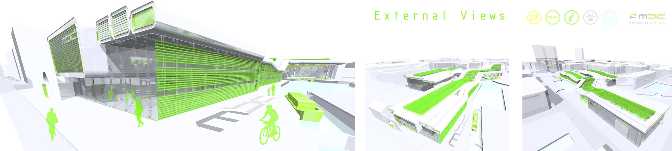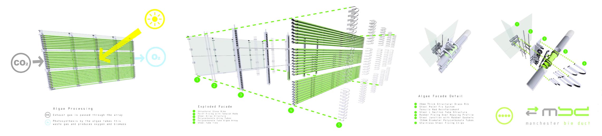 An algae array was proposed as it provides a biotic programme element establishing a symbiotic relationship with the buildings inhabitants via the exchange of O2 and CO2.