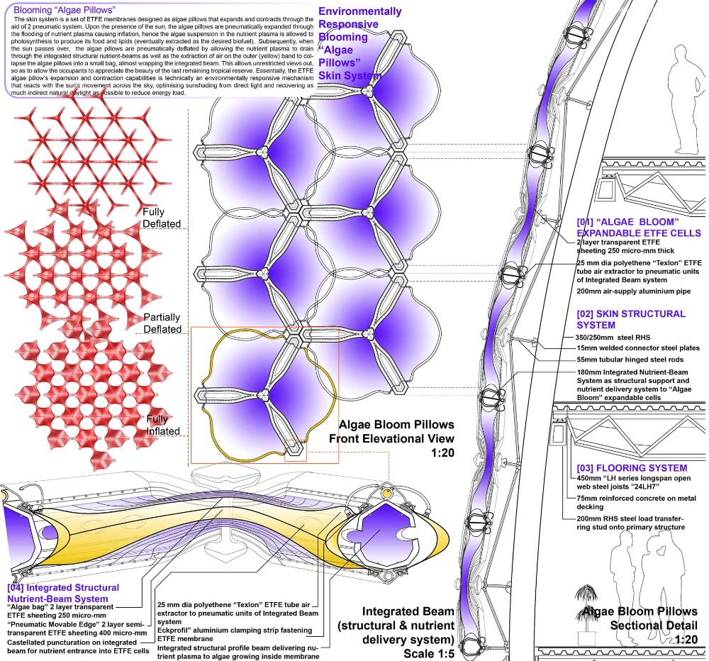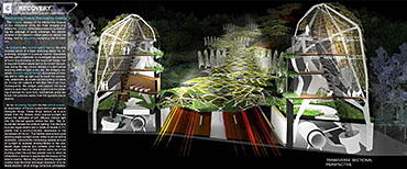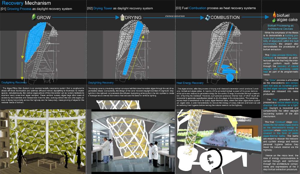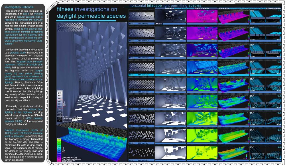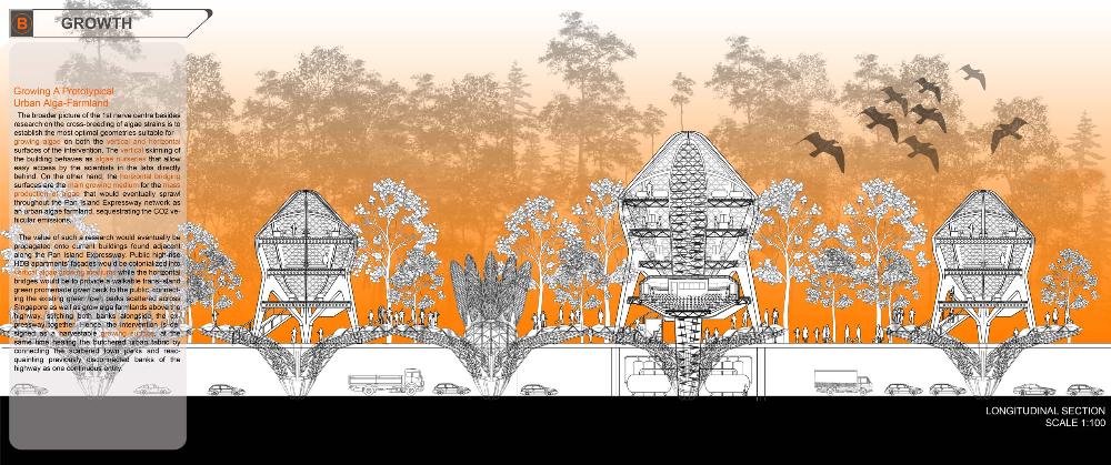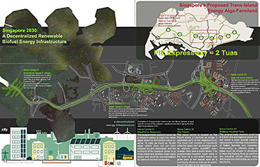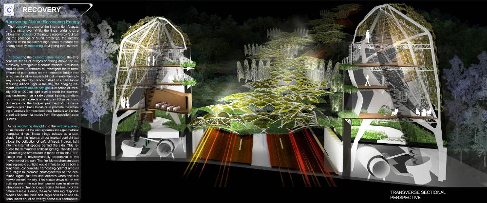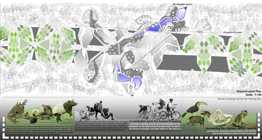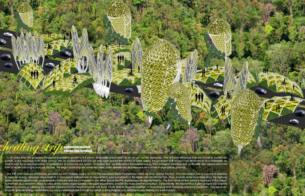 Healing Strip Part 2 Project 2009 Firus Faizal National University of Singapore | Singapore In 50 years time, the projected Singapore population growth to 6.5 million inhabitants would exert its toll on our current resources. One of these resources that are critical to sustain our growth, is our requirement for more energy. Yet, as studies point out that we may have passed the world’s oil peak output, the paradigm shift of fossil fuel dependence to a renewable resource calls for a new exploration of possibilities to empower our nation. To pursue this, we entertained harvesting energy from biological solutions that continually self-regenerate in the form of algae culturing to produce bio-fuel. We begin colonizing our unwanted dead urban spaces- our expressways as cultivation alga-culture grounds. Singapore's longest highway, the Pan-Island Expressway (PIE) provides us with limitless supply of CO2 that nourishes these microphytes, while we reap cleaner bio-fuel. This intervention has a theoretical potential to meet our energy demands, [equivalent to 2 Tuas power station’s fuel oil requirement] upon conversion of the algae cultures into bio-fuel. Thus, a series of nerve centres along the highway spine provides opportunistic programmatic functions and are connected to one other above the PIE expressway as alga-farmlands. The first nerve centre, which is explored in this thesis, is intended as a research village to cross-breed native algae species into super alga-strains suitable for mass commercialization. Concurrently, the intervention is also designed to heal the reserve by means of stitching the currently cleaved Central Nature Reserve with Bukit Timah Nature Reserve together, to encourage animal crossings and floral dispersion. This perseverance for greener energy spearheads our city’s metamorphosis from an industrial to an ecological one, simultaneously healing our environment. This is a thesis that penetrates beyond the ordinary and discusses the extraordinary role of the architect through a frank excavation and contestation of the deficiencies of modern day dystopia. Maturely, Firus acknowledges the present limitations of Singapore’s capacity to support its projected boom in population and questions its terrifying wholesale dependence on fossil fuels. Cities have long depended upon fossil fuels to power the economy, but it is also true that renewables can offer an alternative empowerment. If so, how can we harness our natural capital that benefits both the environment and human beings concurrently? And how do we articulate these new technologies to a habitable paradigm?Firus’s response was excellent from the outset. Starting with the cultivation of the detested green algae as promised energy resource, he balances the qualitative side of the project by quantifying numbers to breathe convincing believability in the scheme’s realism before pointing out a radical choice of site-the motorized highway. His choice of colonizing Singapore’s longest expressway to grow algae for biofuel, the Pan Island Expressway, proved to be a brilliant move; it converts a brownfield site to a productive urban farmland, it accesses to solar abundance without a need to clear forests and importantly, carbon dioxide gases released by the motor highway is sequestrated as the main microphytical growth requirement. From this, he envisaged a selfless, healing vision when the old highway cleaves apart the island’s last natural heritage-the Central Nature Reserve. Sensitively designing the first nerve centre as a research village to recuperate the environmental violations done, the architectural response gradually nurse the severed reserve by allowing animal crossings to occur, allowing its wild inhabitants an undisrupted access to food, potential mates and continuity of their indigenous habitats.Firus represents a rare breed of selfless architect who does more than the mere poetics of space by giving generously back to the environment and society, concurrently ameliorating the invisible wounds cutting through the urban fabric. He is brave or skilled enough to take on the challenge of technological postulation-leading to the crafting of a prototypical space-and make something beautiful that heals. Tutor(s) Mr Teck Kiam Tan