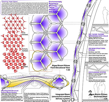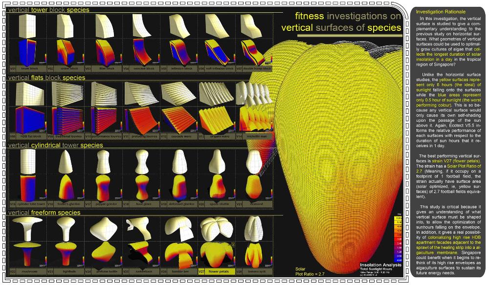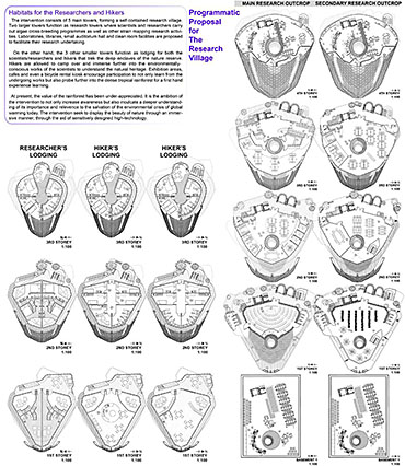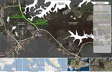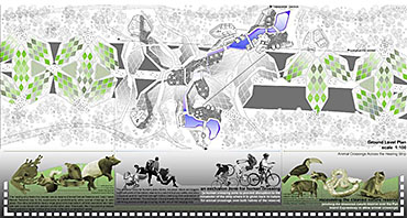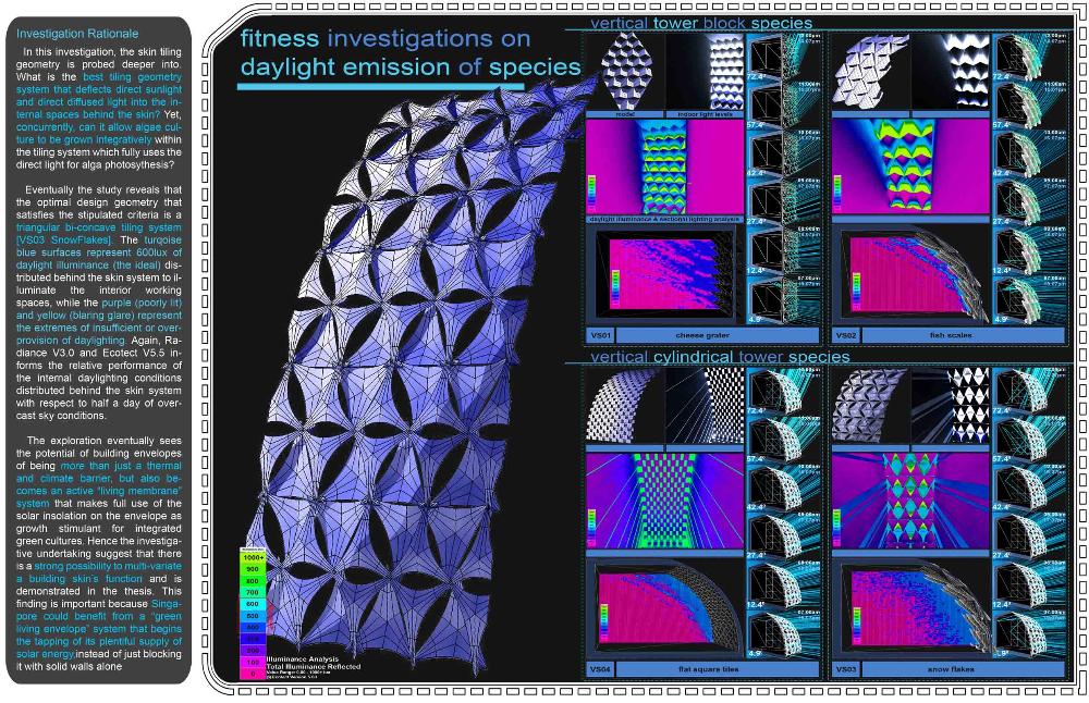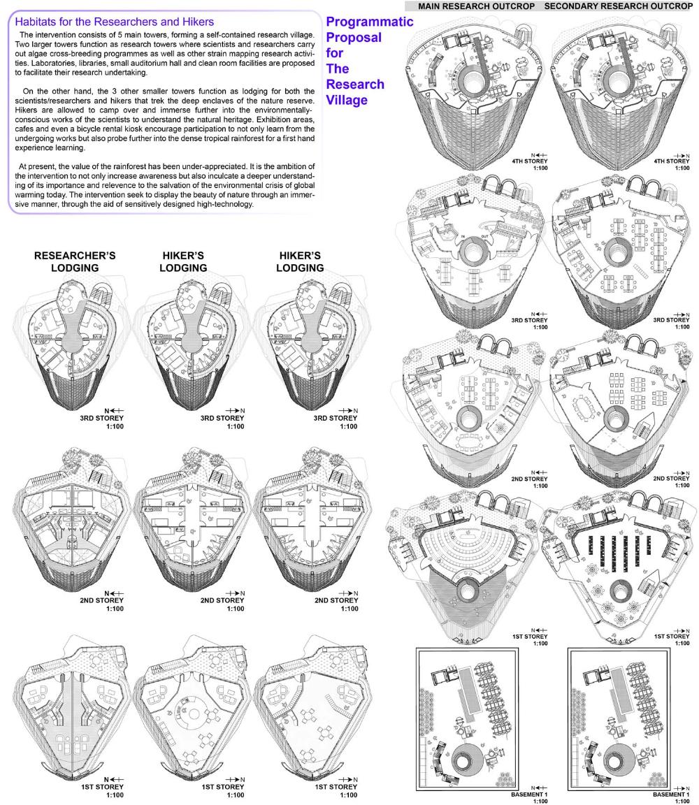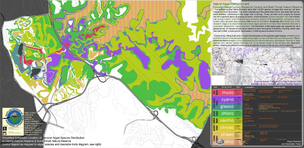Healing Strip Part 2 Project 2009 Firus Faizal National University of Singapore | Singapore In 50 years time, the projected Singapore population growth to 6.5 million inhabitants would exert its toll on our current resources. One of these resources that are critical to sustain our growth, is our requirement for more energy. Yet, as studies point out that we may have passed the world’s oil peak output, the paradigm shift of fossil fuel dependence to a renewable resource calls for a new exploration of possibilities to empower our nation. To pursue this, we entertained harvesting energy from biological solutions that continually self-regenerate in the form of algae culturing to produce bio-fuel. We begin colonizing our unwanted dead urban spaces- our expressways as cultivation alga-culture grounds. Singapore's longest highway, the Pan-Island Expressway (PIE) provides us with limitless supply of CO2 that nourishes these microphytes, while we reap cleaner bio-fuel. This intervention has a theoretical potential to meet our energy demands, [equivalent to 2 Tuas power station’s fuel oil requirement] upon conversion of the algae cultures into bio-fuel. Thus, a series of nerve centres along the highway spine provides opportunistic programmatic functions and are connected to one other above the PIE expressway as alga-farmlands. The first nerve centre, which is explored in this thesis, is intended as a research village to cross-breed native algae species into super alga-strains suitable for mass commercialization. Concurrently, the intervention is also designed to heal the reserve by means of stitching the currently cleaved Central Nature Reserve with Bukit Timah Nature Reserve together, to encourage animal crossings and floral dispersion. This perseverance for greener energy spearheads our city’s metamorphosis from an industrial to an ecological one, simultaneously healing our environment. This is a thesis that penetrates beyond the ordinary and discusses the extraordinary role of the architect through a frank excavation and contestation of the deficiencies of modern day dystopia. Maturely, Firus acknowledges the present limitations of Singapore’s capacity to support its projected boom in population and questions its terrifying wholesale dependence on fossil fuels. Cities have long depended upon fossil fuels to power the economy, but it is also true that renewables can offer an alternative empowerment. If so, how can we harness our natural capital that benefits both the environment and human beings concurrently? And how do we articulate these new technologies to a habitable paradigm?Firus’s response was excellent from the outset. Starting with the cultivation of the detested green algae as promised energy resource, he balances the qualitative side of the project by quantifying numbers to breathe convincing believability in the scheme’s realism before pointing out a radical choice of site-the motorized highway. His choice of colonizing Singapore’s longest expressway to grow algae for biofuel, the Pan Island Expressway, proved to be a brilliant move; it converts a brownfield site to a productive urban farmland, it accesses to solar abundance without a need to clear forests and importantly, carbon dioxide gases released by the motor highway is sequestrated as the main microphytical growth requirement. From this, he envisaged a selfless, healing vision when the old highway cleaves apart the island’s last natural heritage-the Central Nature Reserve. Sensitively designing the first nerve centre as a research village to recuperate the environmental violations done, the architectural response gradually nurse the severed reserve by allowing animal crossings to occur, allowing its wild inhabitants an undisrupted access to food, potential mates and continuity of their indigenous habitats.Firus represents a rare breed of selfless architect who does more than the mere poetics of space by giving generously back to the environment and society, concurrently ameliorating the invisible wounds cutting through the urban fabric. He is brave or skilled enough to take on the challenge of technological postulation-leading to the crafting of a prototypical space-and make something beautiful that heals. Tutor(s) Mr Teck Kiam Tan