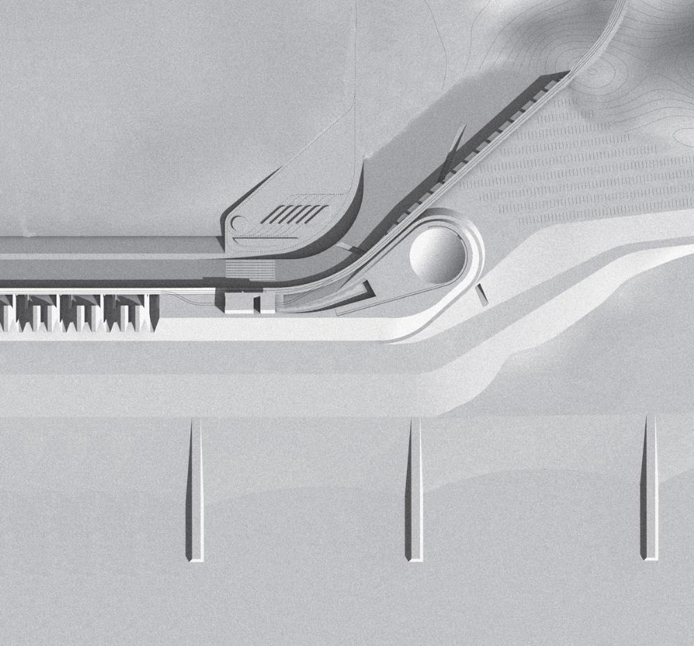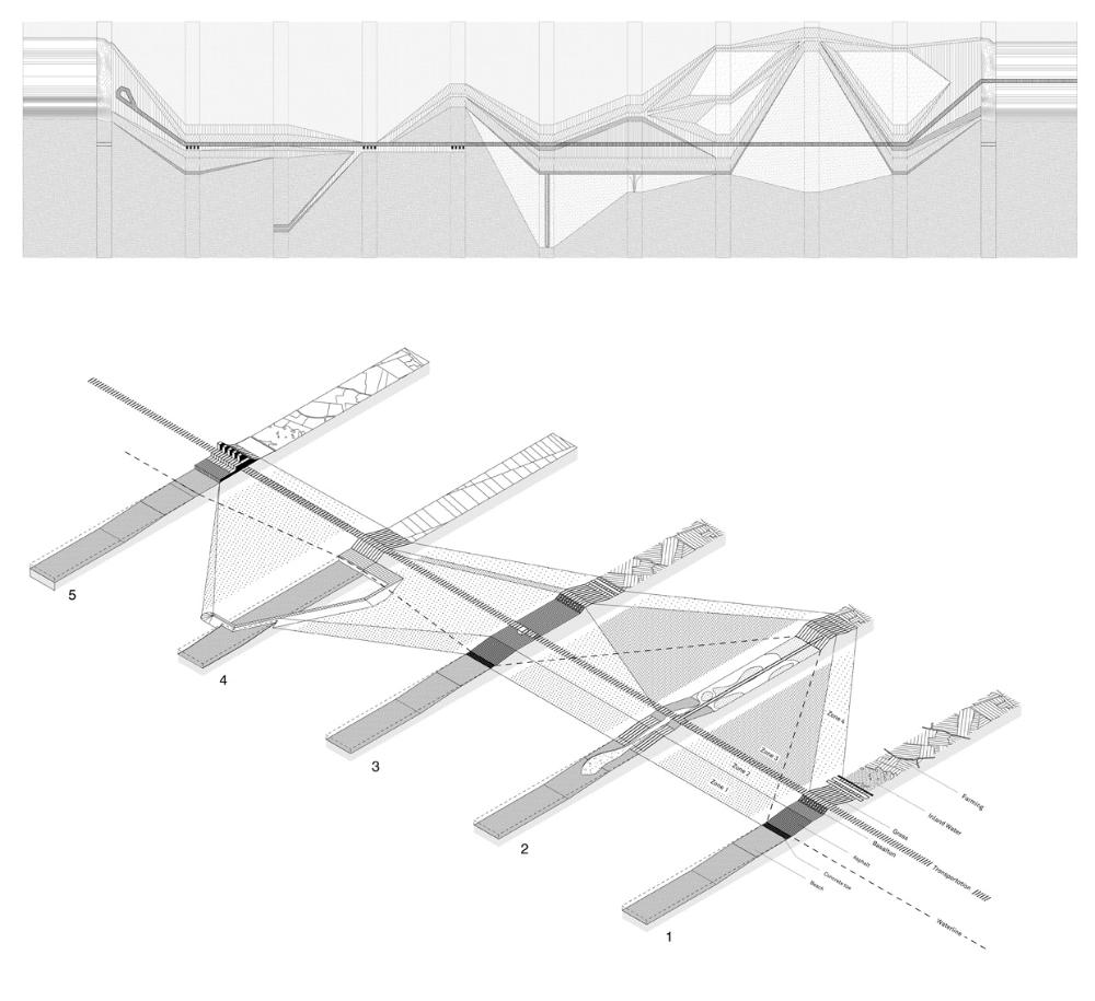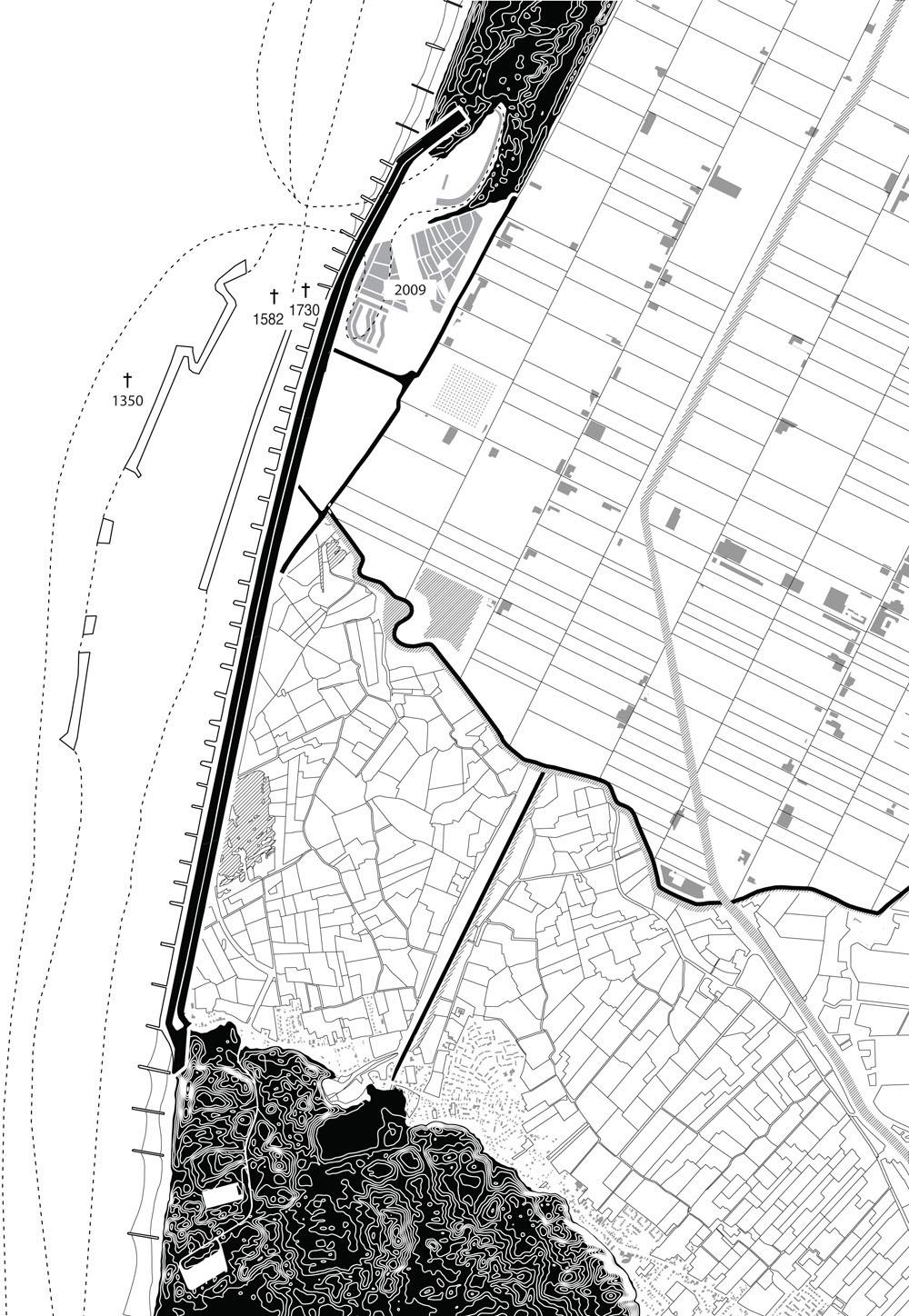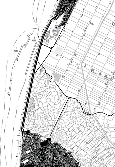 Paradise Regained Part 2 Project 2010 Ilmar Hurkxkens Delft University of Technology Delft | The Netherlands The current coastal protection in the Netherlands is based on the hermetic closure of the hinterland from the sea. The total control of this landscape artefact resulted in one unified defence line. With external forces completely eliminated behind that line, the hinterland is left to unrestrained and indiscriminate urbanization. In my project I re-imagine the coastal protection of the Netherlands: zones of absorption instead of one unified defence line and, instead of a detached dike infrastructure, an architecture where means and ends for construction merge.The base of the sea wall (Hondsbossche Zeewering) is the foundation for a new city, striking architecture and a new (old) landscape. The modification of the sea wall into a zone of coastal protection reinstates the historical three dikes present: The Watchman, The Sleeper and The Dreamer. This modification enables the construction of a new city. The village of Petten, in history often washed away by the sea, will find its final destination on the dike. The new city superimposes all programs onto the dike in a linear succession of artefacts, maximizing the relation between infrastructure and architecture. Metropolitan density is combined with the proximity of landscape in a scheme of linear congestion. The city combines a morphological system and a functional one. The first consists of the found form of the dike, modified in plan and section; the second consists of artefacts that are modelled within the specific constraints left by the first, thus belonging to the spirit of the site. The dike becomes city by manipulating the linear proximity of urban artefacts, each of these the synthesis of the restraints imposed by the site and their formal individuality. Now, dike and city form a continuous artefact, not with a singular centre, but with a continuous centrality between sea and land.The endpoints of the city feature The Lab (Rijkswaterstaat, the National Directorate General of Public Works and Water Management) and The Panorama, articulating respectively the technological and the poetic premises framing the project as a whole. The Panorama depicts an image of Mesolithic Doggerland, confirming the presence of the primordial wetland reality outside. Paradise Regained – The Watchman, The Sleeper, The Dreamer, and the CityThe Hondsbossche Zeewering at Petten Architecturally ReconsideredThe project ‘Paradise Regained’ by Ilmar Hurkxkens dwells upon different levels: a landscape level, an urban level, an architectural level and last but not least the level of the project as representation. The brief for the project ‘Paradise Regained’ almost naturally emerged from the predicament made evident by the research on the Dutch coastal dunes: a city for the Hondsbossche Zeewering (sea wall). What kind of city? How to piggyback on the technical necessity of upgrading this problematic sea wall by en-passant reinventing it as a city? The project enters the ambiguous territory between survey and actual modification: with a technique that is both technocratic and poetic, but above all precisely framing a possible reality. For this project the city is a conclusion, not a starting point: a new city is founded, different from the cities we know. The project is not about the ‘architecture of the city’ that we find, but about making a different kind of city on a new frontier – in close proximity. Hurkxkens’ project truly fulfils the studio’s objectives, contesting that project and the territorial reality are mutually exclusive concerns. Instead he proposes reality in the making. In his project the territory is both the ‘whole’ in which he operates and the material at hand.A last observation regards the panorama building. With the panorama the project (conceptually) splits; it doubles its significance proposing the inversion and the paradox between architecture and its image. The choice of this particular ‘function’ is not an accessory one. It is part of the narrative, its conclusive moment. At the same time, as architectural theme, it can absorb thematically the entire elements previously investigated in the form of a spectacle, in a ‘form’ for the spectacle of an ideal relationship between the landscape and the manmade. Tutor(s) Filip Geerts
