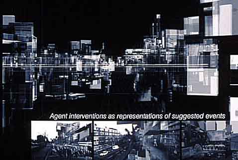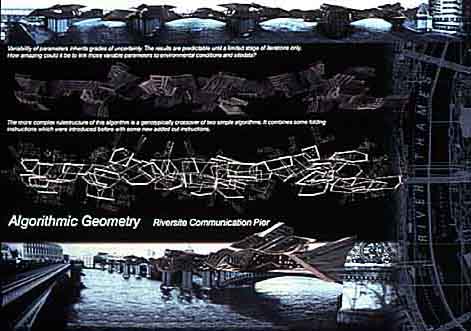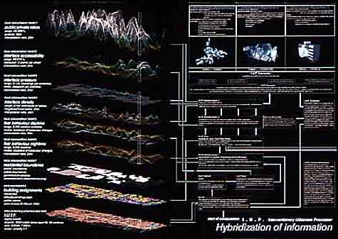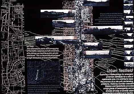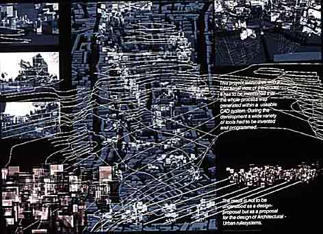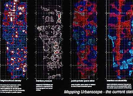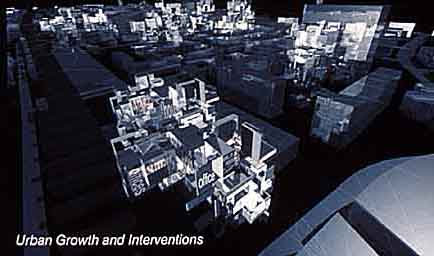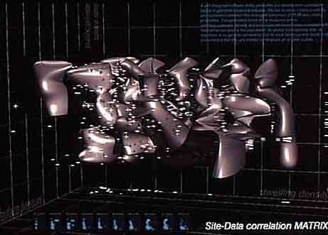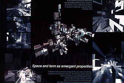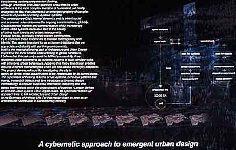 A cybernetic approach for emergent urban design Part 2 Project 1999 Riko Sibbe University of East London London | UK Currently, a fundamental shift in scientific paradigms is radically transforming contemporary western thinking. Although Architects and Urban planners know that the urban settlement is the most complex invention of humankind, we hardly recognise the fact that Urbanism is an emergent property of complex networks of parallel-operating dynamic systems.The contemporary City's internal dynamics and its inherit social and economic rules determine the ongoing transformations, globally. Globalisation of markets and communication which increasingly match urban systems-behaviour lead to the anxiety of losing local identity and urban heterogeneity. Political forces, especially within western communities, try to constrain those tendencies to maintain heterogeneity and identity. This seems important for us as human inhabitants that we appreciate and identify with our living-environments. It still is the most challenging task of Architecture and Urban Design to respond to the local context while referring to global conditions. I believe that this task only could be fulfilled successfully, if we recognise urban settlements as dynamic systems of local condition rules leading to emerging global behaviours. Applying this theory to a design process requires different methodologies which are time-based and highly adaptable. This project developed tools for investigating the city in depth, on levels which actually seem to be responsible for its current states. The experiment of thinking in terms of rule-systems, behaviour patterns and events, instead of objects and form introduces a dynamic design methodology. Computer supported information reasoning and time based interventions within the urban system of Hackney / London derives an artificial urban-system within digital space. Its cybernetic "bottom up" approach tries to link Architecture and Urban Design to the Sciences of Artificial Life. For that reason it can be seen as an architectural contribution to contemporary thinking. Riko's work successfully combines the theoretical, technical and aesthetic intentions of diploma unit 6 at uel, by showing the potential for the use of the computer as a generator of design proposals, rather than just a means of presentation. The premise of Riko's work is an understanding of the city as a complex multi-layered system, which he interpreted as interdependent fields of data. To achieve this Riko collected large amounts of contextual information from the East London site which he then synthesised as data within a 3D digital site model.Artificial life “agents” were programmed to investigate the model, responding to both the local physical realities and the more global, and sometimes subjective, data fields, looking for significant relationships in the data as a basis for proposing interventions in the urban system.As well as a very thorough initial analysis, Riko produced a massive amount of work in his explorations of these interventions and he presented convincing descriptions of his work process and the architectural outcomes. We see Riko’s work as an example of a new and interesting way of carrying out the architectural debate, as process-lead, system-aware and ultimately about emergent form. As a response to the concerns of the unit and to the urban problem presented to the students we think it shows great promise.