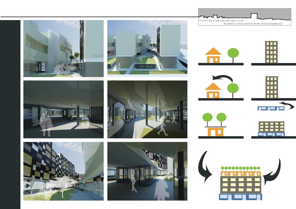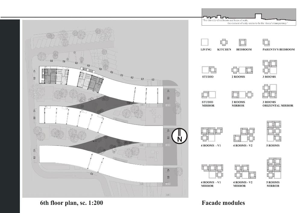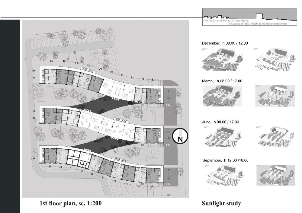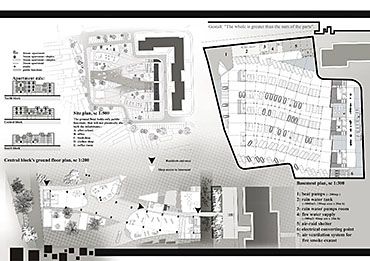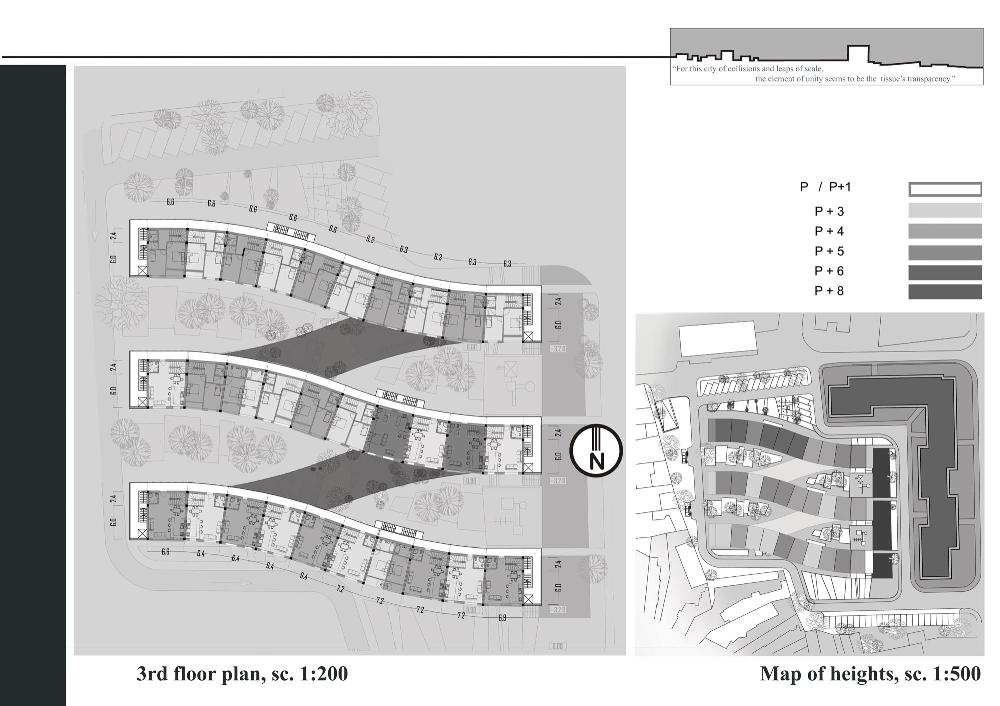 Among the major qualities of the project, there is the attitude towards the city, by filling up an existing emptiness with a new designed texture, appropriate as density, mass and height, of transition between a compact existing and a fragmentary area. It suggests a coherent ensemble through the attentive distribution of construction staff – main buildings, secondary links and accents – and of the available spaces, rhythmic and unitary one. Although subordinated as height to the front which closes the east enclosure, the suggested ensemble dominates through the quality of the proposed inhabiting and offers to the existing building a surprising opportunity through linked intermediary urban spaces.