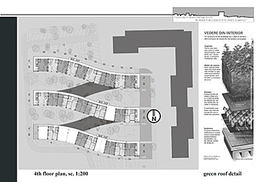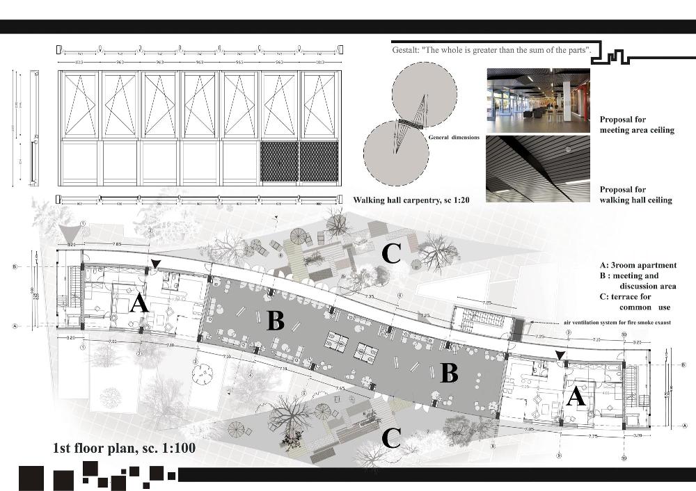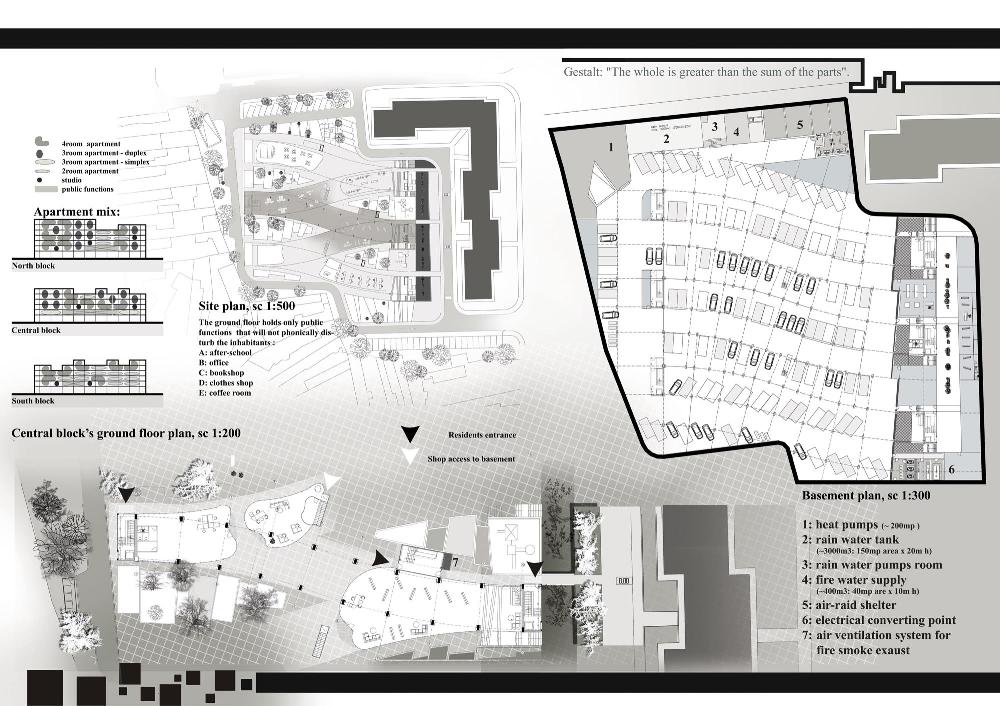 At the object level, as functional-expressive point of view, the traffic road ring-shaped perimeter lets the enclosure free for a sequence of fluent circulation and pedestrian areas, with public utilities and interests areas. Designing the apartments on a horizontal and vertical grid looks for the benefits of the individual inhabiting within the collective buildings. The functions are carried on gradually vertical: public ground floor, an inhabiting first floor with insertions of common spaces and green terraces, apartments, private gardens.