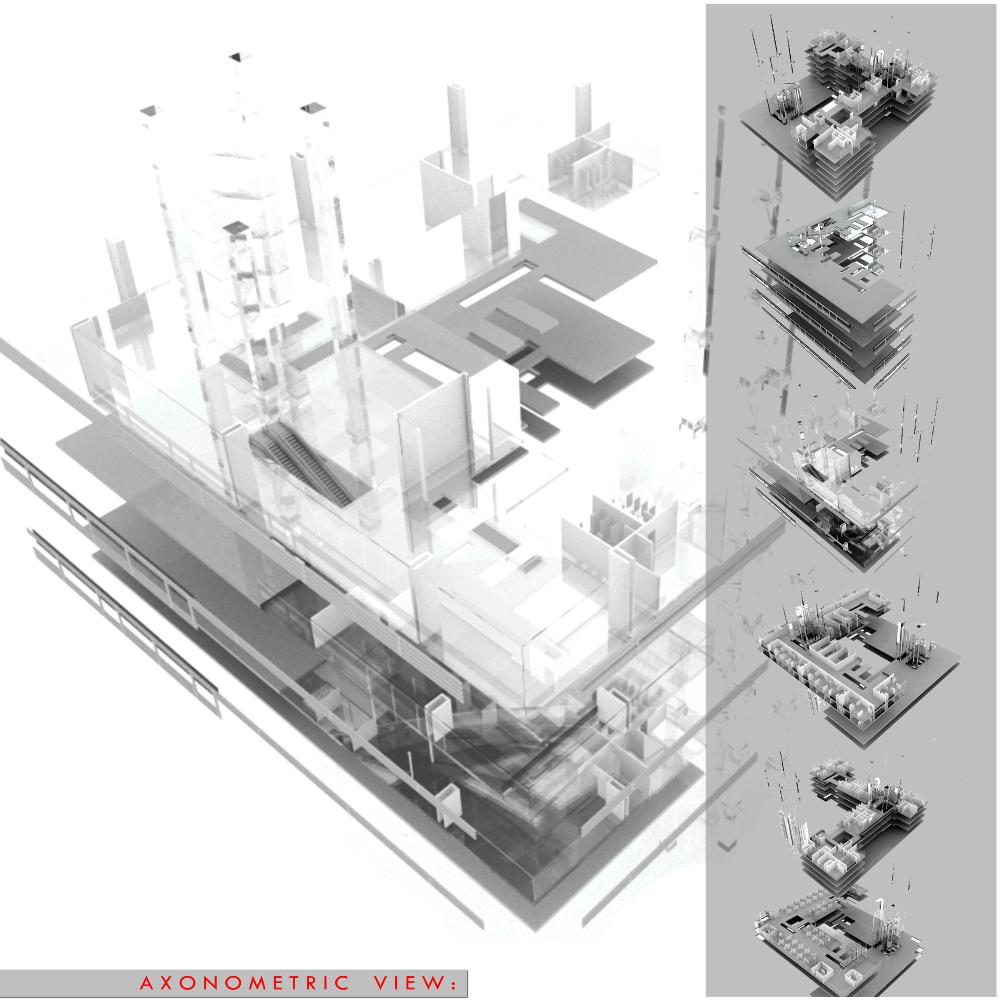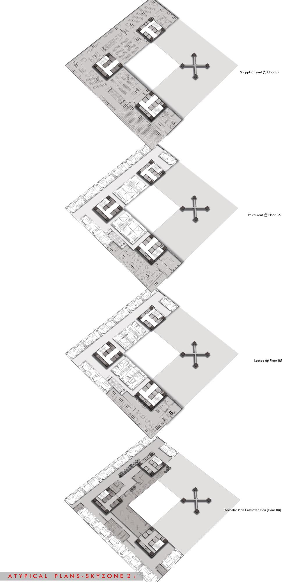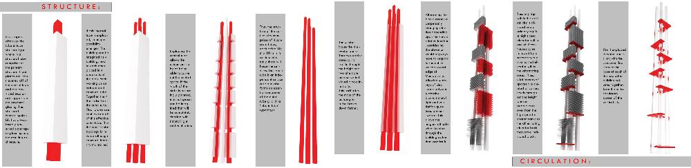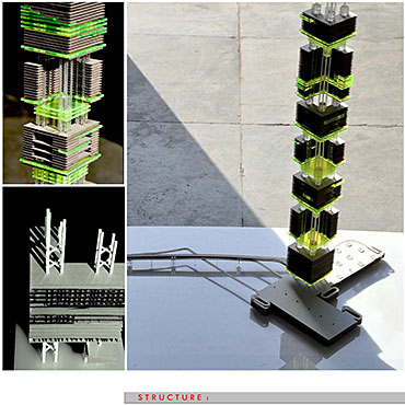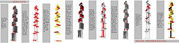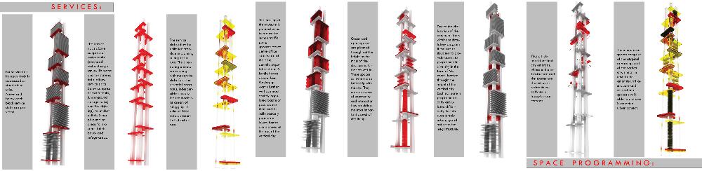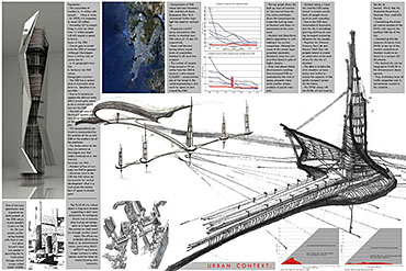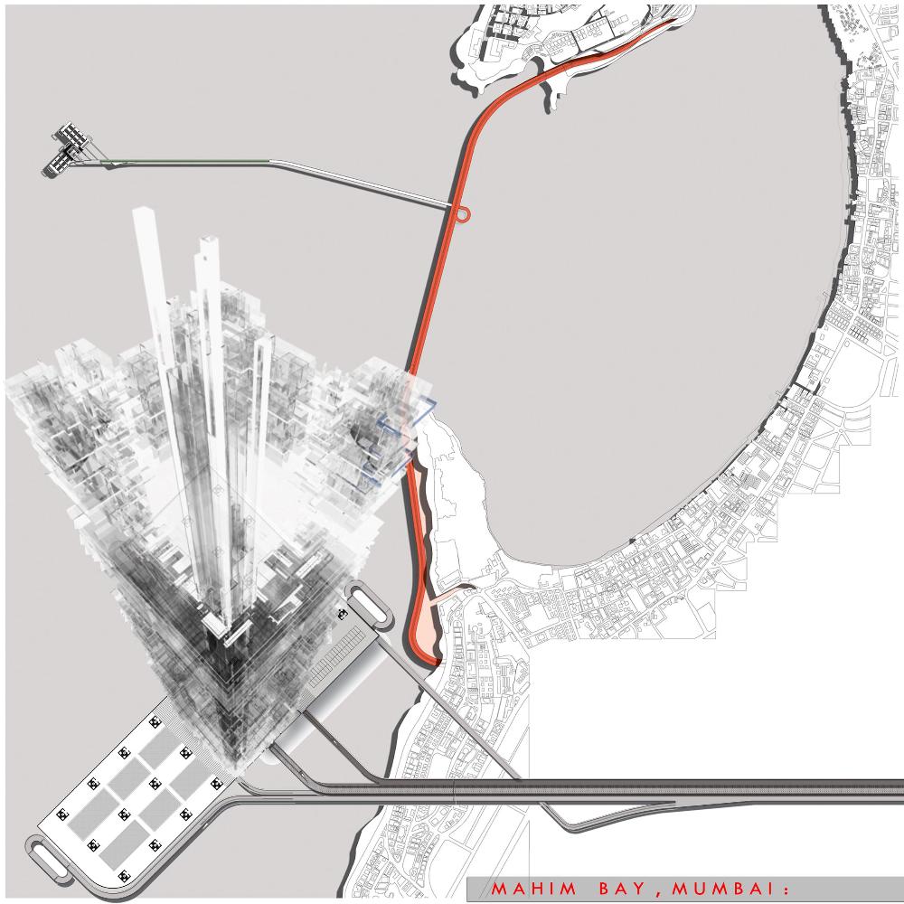 The Vertical City Part 2 Project 2010 Vineet Vora Kamla Raheja Vidyanidhi Institute Mumbai | India In the recent past, Mumbai and several other metropolises have seen unprecedented urban sprawl in a relatively short span of time. There is thus, an obvious shortage of space for accommodation in the city, in turn causing a collective usurping of open public spaces, recreational amenities etc. what results is the eventual death of the city Architects are reduced to being service providers and the profession reduce to nothing but a form making exercise for tireless monotonous residential buildings. The resulting lack of variety that has crept in simply contradicts the mixed program and spaces that form the essential, vital ingredient of the meaning of the word metropolis. Beyond the extreme population density, Mumbai faces further constrictions due to its coastline and the city continues to grow horizontally north words causing serious problems of commuting resulting inevitably in pollution, stress, reduced productivity and shortage of time.An optimistic outlook towards verticality is required. Vertical Architecture is accredited with a reduced footprint and has the capacity to release much required space. Can verticality be enriched far beyond the hermetic repetitive stacking of monotonous spaces? With a jump in scales, a new typology of vertical structures can be imagined, one which can serve as a city itself, a micro vertical city if you will. The problems of monotony can be dealt with a novel approach toward function and architectural programming. Such architecture can serve as a ground breaking solution to the dreadful effects of urban sprawl. 'The Vertical City' is a probe into this typology. It is an experiment, trying to combine the varied experiences of a city into one structure. A possible solution, for future metropolitan cities. Architecturally there arises a completely novel experience in such structures which can be exploited with program to further enrich the design. Such an approach shall legitimize the feasibility of mega structures and their potential in saving our cities. In his design project titled ‘The Vertical City’, Vineet Vora has aimed to present the idea of a mega structure housing a city. His process began with dreamlike sketches of an alternative future. Right from the beginning, the idea was to achieve a well detailed, positive and workable response. Considering the scale of such an architecture his approach has thoughout been a holistic one, where in contrary to a sequential design process in stages, a design that responsibly answered questions of structure, services, circulation, space planning and environmental issues was though of, from the concept stage. The Bandra Worli Sea Link (BWSL) in Mumbai city is a recent infrastructural development adding a new north-south corridor to the densely populated and congested Mumbai city. The vertical city being set along the BWSL near Mahim Bay (Mumbai) allows for the supportive infrastructural required by a mega structure, at the same time avoiding any added stress on the already inadequate road system of the mainland city. The challenge in planning a structure of this scale is enormous, and he has successfully been able to break down the scale with his architectural articulation. He has been able to reinvent the tall structure typology with a very simple yet unique and ground breaking architectural approach.Vineet Vora is an excellent student with exceptional imagination. He has an analytical approach which enables him to develop thoughtful and thought provoking architecture as I have experienced while guiding him. ‘The Vertical City’ is an exemplar of this analytical approach. Tutor(s) Prof. Shakti Parmar