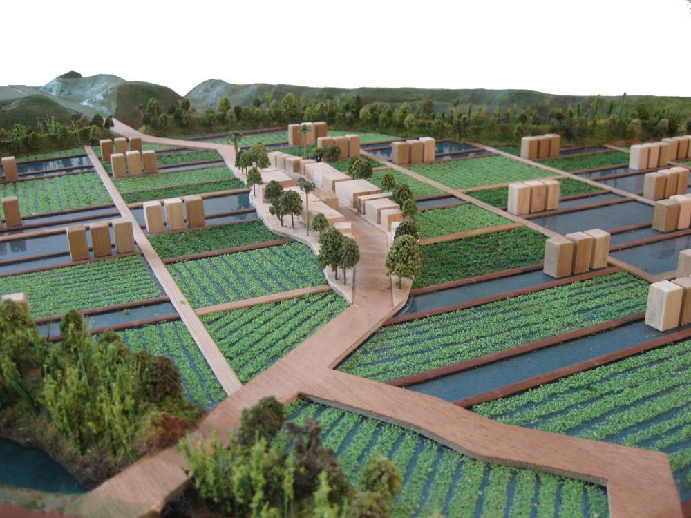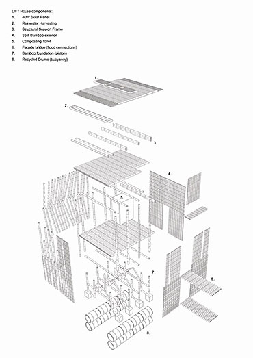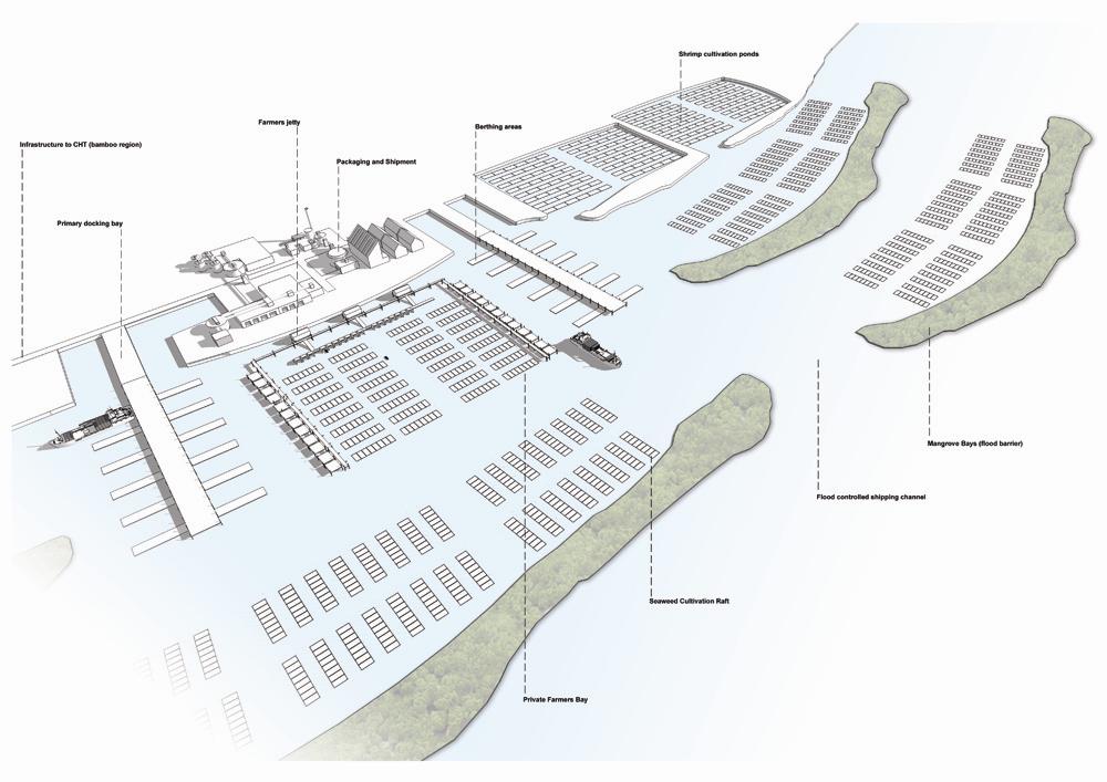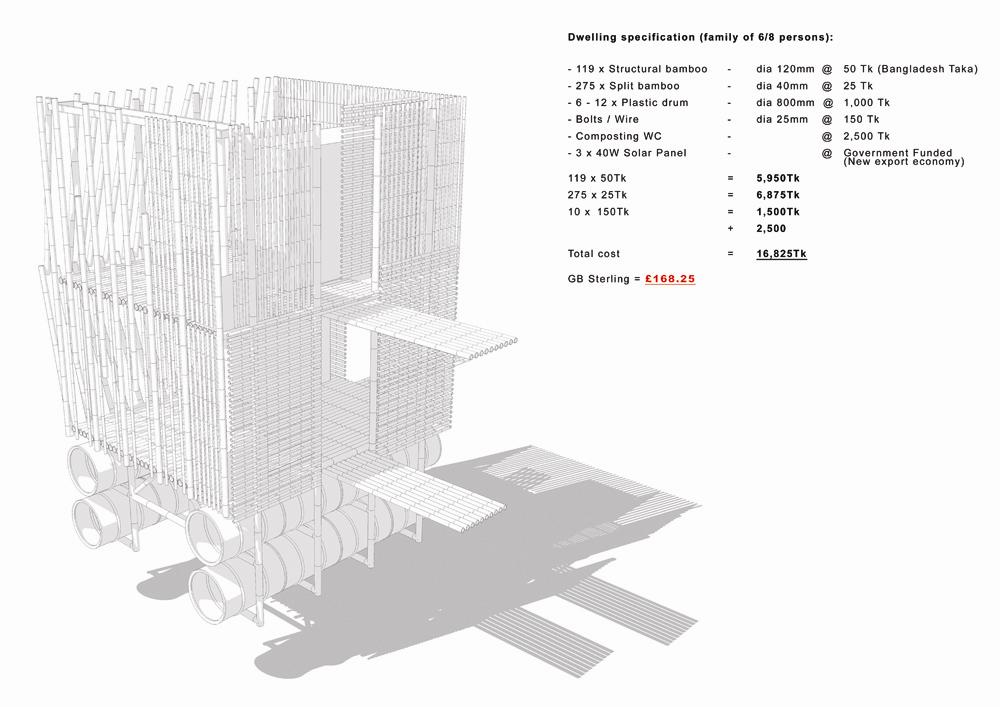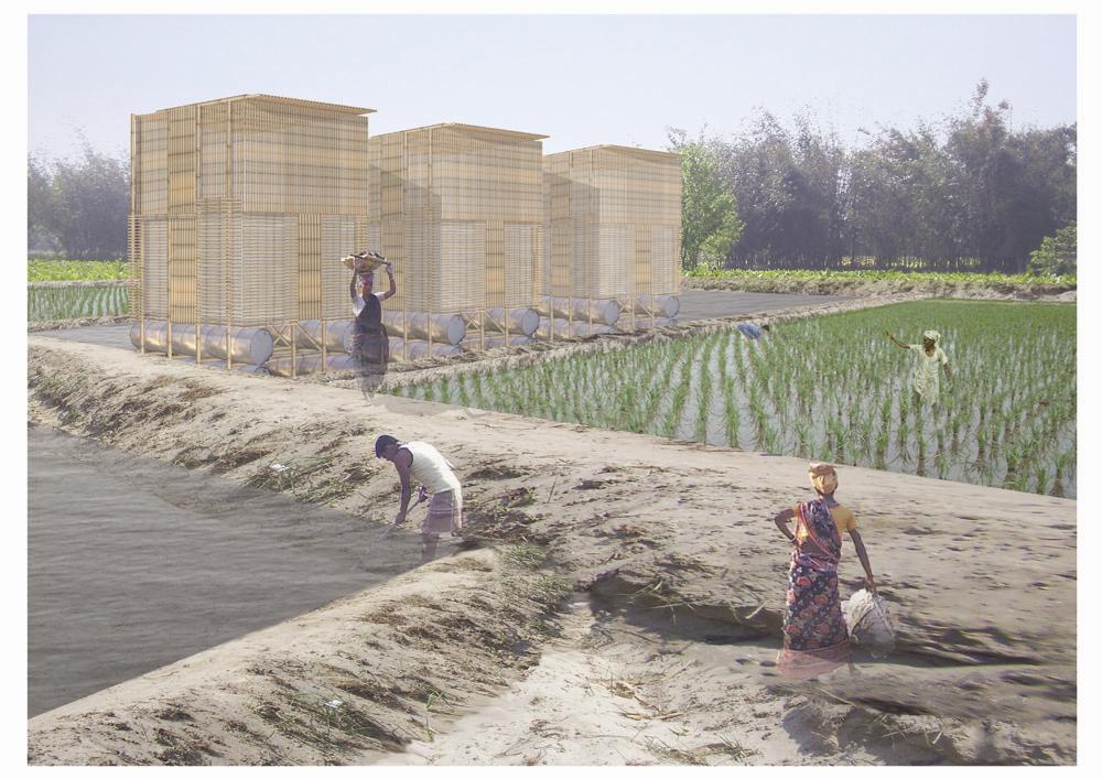 Bangladesh_farming the flood market Part 2 Project 2010 Steven Byrne University of Strathclyde | UK The project developed from investigations of how architecture might respond to rising sea levels and flooding at a large scale. After initial investigations into sites in northern Europe and the Gulf of Mexico, I focused my attention on the flood regions and coastal Bangladesh where flooding is already a major concern but it has a long history of causing major catastrophy to the Bangladeshi people annually. As a result of this seasonal flooding there will be many climate refugees in years to come unless change can be made.The flooding situation is a consequence of the combination of several factors: the seasonal meltwater that flows from the Himalayas, the low lying riparian country and the economic hardship that prevents adequate investment in appropriate defences. Following coordination with Housing and Hazards to organise a visit to Bangladesh, I worked with their local NGO workers and met with professionals and students at BRAC University to understand the socio-economic lifestyles of the Bangladeshi culture. From my findings and gathering recordings, interviews and mapping I developed a strategy for mass production of indigenous resources, such as shrimp, seaweed and bamboo - which are currently farmed only on a small scale - in order to generate income to allow investment in a flood defence infrastructure.The project presented models for large-scale shrimp, seaweed and bamboo farming and a restructured village where the historic centre is retained and a system of banks and floating houses introduced to allow homes to remain dry while water is captured for farming as the floods recede. Following interest from the Housing and Hazards Organisation about the potential of the bamboo floating structure, I embarked on designing a prototype dwelling made entirely of local bamboo and concrete / rice husk stabilised walls. The prototype dwelling floats on reclaimed oil barrels whilst the use of buoyant foundations allows the dwelling to rise and fall with the flood waters, creating maximum security and comfort during monsoon and flood season. The typology is derived from vernacular style architecture and allows the community to thrive during a time of normal socio-economic hardship. This student's thesis investigations began by exploring how architecture can respond to rising sea levels and flood situations. After initially looking at low-lying areas within Northern Europe and the Gulf of Mexico, the student realised that a more pertinent area for exploration was in Bangladesh, where the problem of flooding is made extremely acute by a combination of factors, as the majority of the country is prone to seasonal and long lasting flooding caused predominantly by the rivers that flow from the Himalayas and harsh economic realities prevent adequate investment in flood defence and the appropriate architectural solutions.Having established the ¹site¹, the student proceeded to explore Bangladesh in terms of the local, national and international context and to make contact with the Non Government Organisations (NGOs) working in the region that were exploring similar issues.The student raised funds to allow a 2 week study visit where he met and stayed with local NGO workers, students and professionals at BRAC University (Dhaka City) and explored urban and rural situations whilst gathering information and recording this process.This student's major innovation was in developing a strategy for the mass production of some indigenous resources such as shrimp, seaweed and bamboo (currently farmed on a small scale), in order to generate income to allow investment in restructuring the villages to brace against flooding.The final proposition presented models for large-scale shrimp, seaweed and bamboo farming and also a restructured village where the historic centre is retained and a system of banks and floating houses, made from locally sourced bamboo, allows homes to remain dry during flood situations. When flooding occurs water is captured as the floods recede (for shrimp and paddy farming), through the system of designed flood banks. Tutor(s) Ewan Imrie David Reat