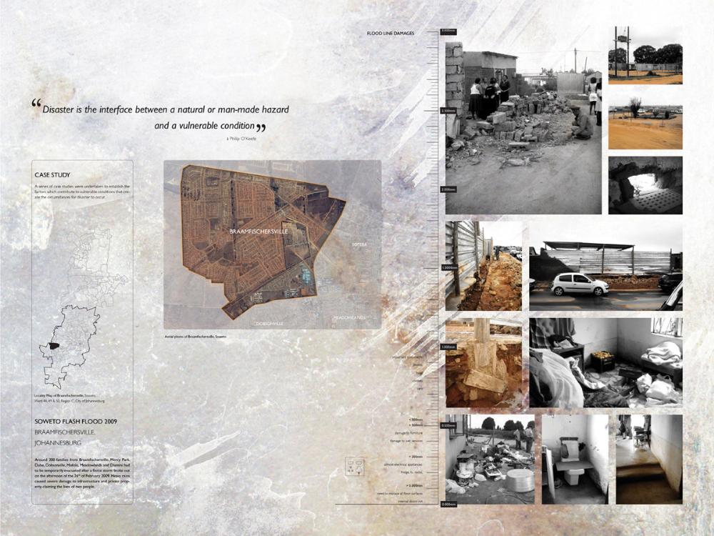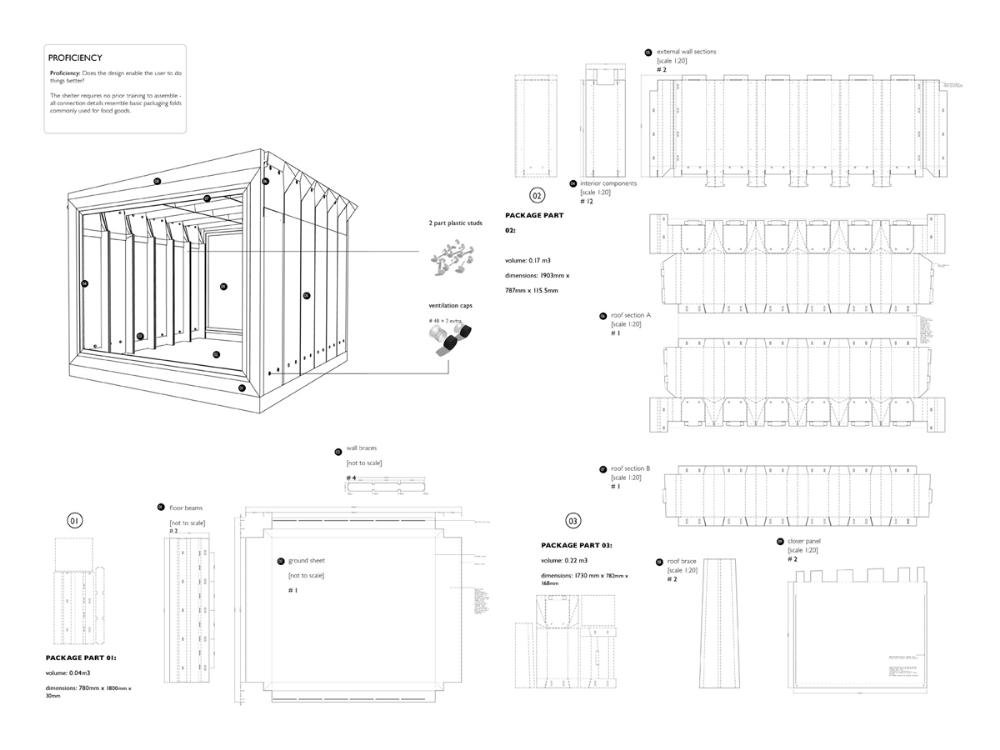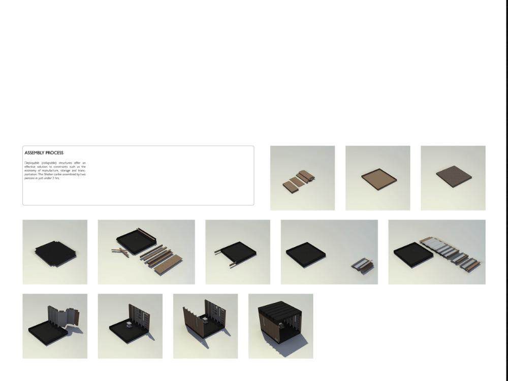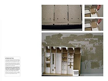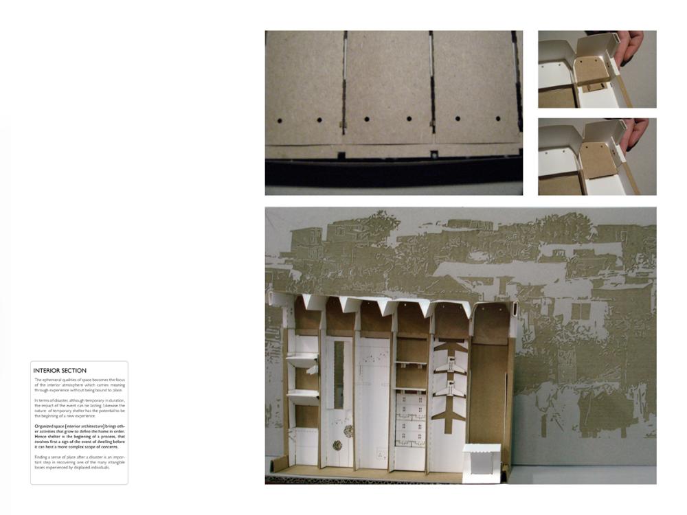 Grace Under Pressure: Investigating a Design Response in Event of Disaster Part 2 Project 2010 Elonah O'Neil University of Pretoria | South Africa PROBLEM STATEMENTWith the accelerated rate of urbanization in African cities the threat of disasters yield staggering implications. South Africa has of yet no formalised shelter standards and depend on a patchwork of universal solutions and local improvisation. The emphasis of the project falls on filling the gap between short-term relief provided in an emergency phase and the time frame left over until [or whilst] reconstruction is taking place.HYPOTHESISThe hypothesis encourages designers to stop viewing shelter as only a temporary solution, but to rather see it as a starter kit with the potential of becoming a home. Where as conventional ‘donor’ structures may economically shelter the body, they neglect to address issues of home [context] and belonging [culture]. In the wake of disaster both tangible and intangible losses occur. Sudden changes in environment and situation have a great impact on how relief efforts are carried out and experienced. The potential of space to aid emotional well-being is overshadowed by limited time and resources in the case of an emergency. Sheltering solutions require an architecture that is as demanding as it is low cost. Thorough investigations into cardboard was undertaken to provide feasible flat pack typology. By developing the exterior and interior as a single structural system, the proposal allows the concept of arrangement to into play. Hence affording the displaced person with as much humanity as one can fit into 3,5sqm and enabling just a little bit of grace under pressure. With this study, Elonah O’Neil conducted a critical investigation into rapidly deployable structures. She highlighted the potential of cardboard as an alternative building material through translating ideas and terminology used in the packaging industry. Using an interdisciplinary approach Elonah translated packaging principles through a series of visually documented experiments. This resulted in a plausible and accessible architectural language.Elonah presented her argument on the basis that 95% of disaster related deaths occur in countries that annually contribute less than 2% of their GDP to research in disaster management. With the thesis Elonah aims to formalize a regional design approach (focusing on disasters) from within the discipline of interior architecture. She also challenges certain misconceptions surrounding the topic of emergency relief. Furthermore, the capacity of interior architects and necessity of the discipline of interior architecture to design for humanitarian aid is investigated by Ms O’Neil.Elonah utilised a variety of available software and graphic devices as a powerful tool to communicate a spherical body of research. She managed this in a concise and logical manner. The final design proposal represents a structured argument that employs carefully balanced devices. During her studies, Elonah made various discoveries on theoretical and contextual levels. She communicated applicable findings using text, photographic surveys, renderings, information graphics, and models. These were constantly employed to enrich the design. It is expected that this design (and the accompanying document illustrating the design process) would become a standard of reference, within the complex discipline of interior architecture. Elonah’s full dissertation is available at: http://upetd.up.ac.za/thesis/available/etd-12052009-173655/Mr Nico Botes, Study LeaderMr Jacques Laubscher, Mentor2 September 2010 Tutor(s) Jacques Laubscher Nico Botes