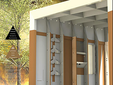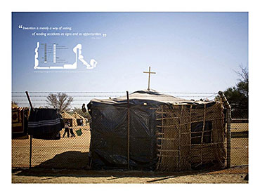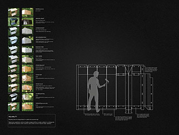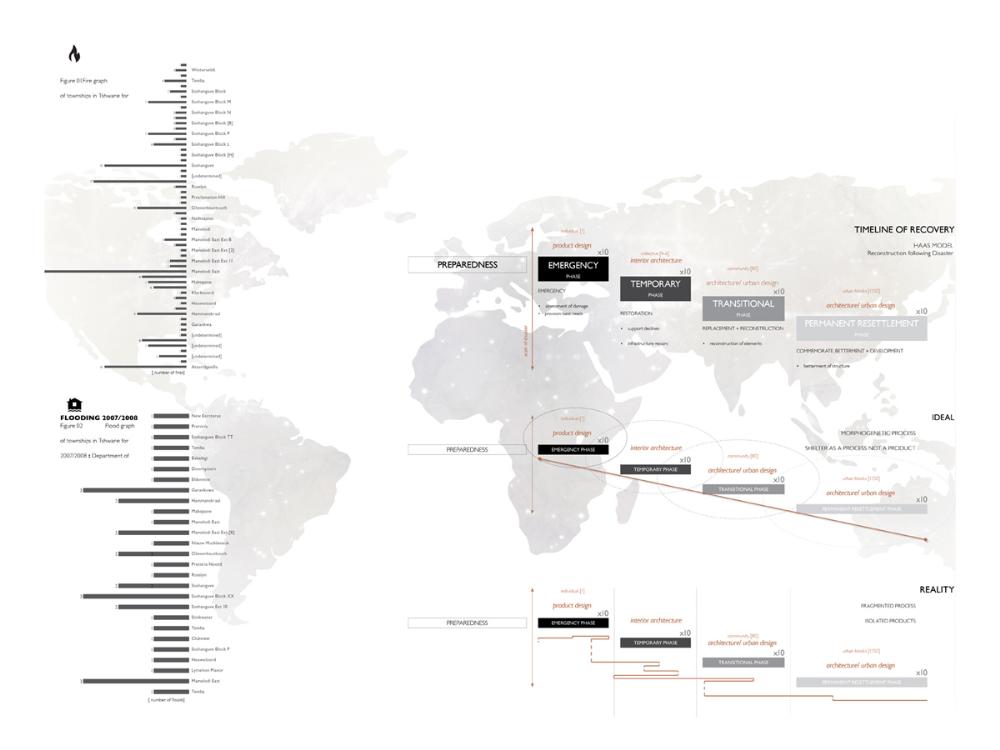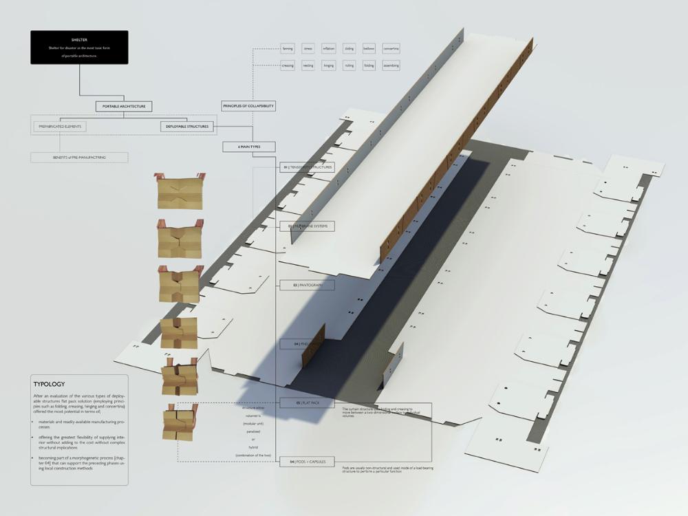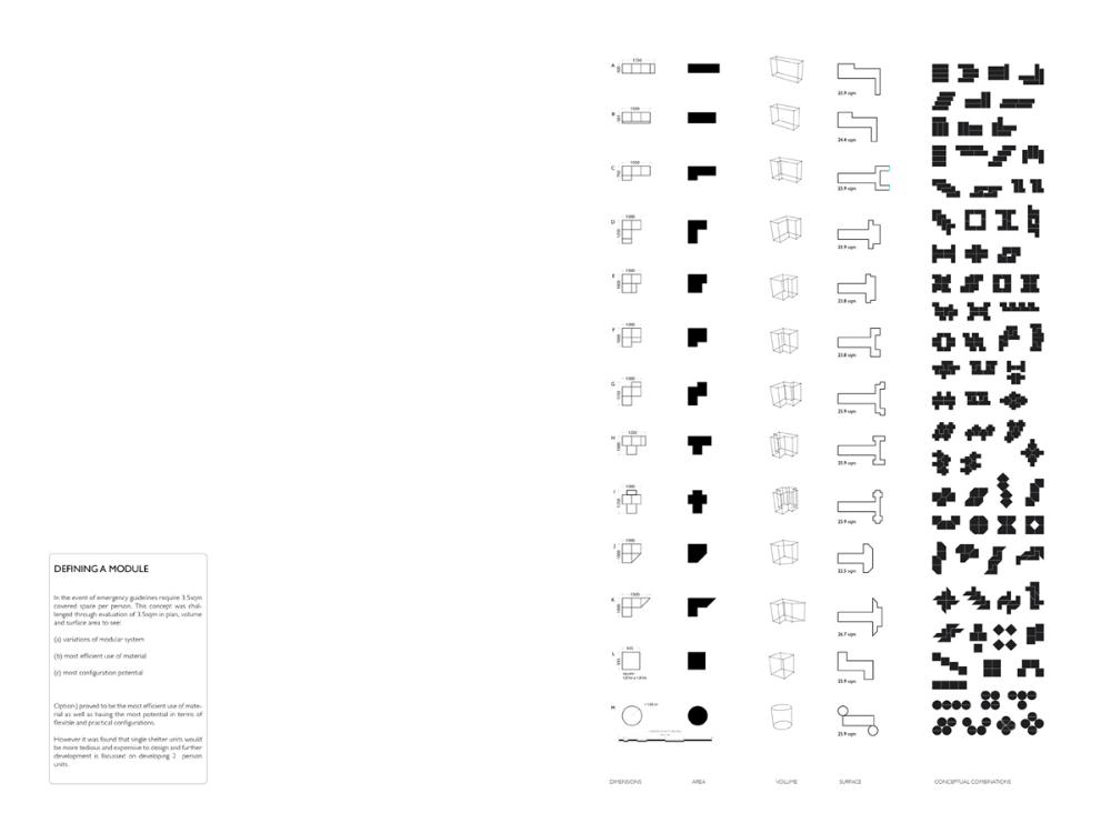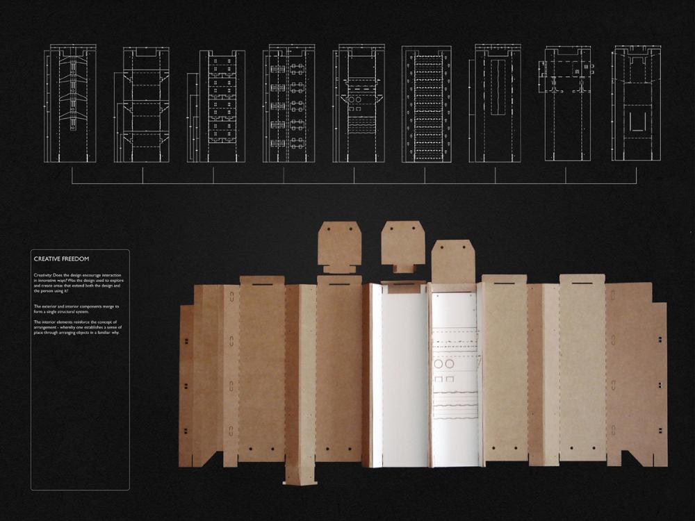 Grace Under Pressure: Investigating a Design Response in Event of Disaster Part 2 Project 2010 Elonah O'Neil University of Pretoria | South Africa PROBLEM STATEMENTWith the accelerated rate of urbanization in African cities the threat of disasters yield staggering implications. South Africa has of yet no formalised shelter standards and depend on a patchwork of universal solutions and local improvisation. The emphasis of the project falls on filling the gap between short-term relief provided in an emergency phase and the time frame left over until [or whilst] reconstruction is taking place.HYPOTHESISThe hypothesis encourages designers to stop viewing shelter as only a temporary solution, but to rather see it as a starter kit with the potential of becoming a home. Where as conventional ‘donor’ structures may economically shelter the body, they neglect to address issues of home [context] and belonging [culture]. In the wake of disaster both tangible and intangible losses occur. Sudden changes in environment and situation have a great impact on how relief efforts are carried out and experienced. The potential of space to aid emotional well-being is overshadowed by limited time and resources in the case of an emergency. Sheltering solutions require an architecture that is as demanding as it is low cost. Thorough investigations into cardboard was undertaken to provide feasible flat pack typology. By developing the exterior and interior as a single structural system, the proposal allows the concept of arrangement to into play. Hence affording the displaced person with as much humanity as one can fit into 3,5sqm and enabling just a little bit of grace under pressure. With this study, Elonah O’Neil conducted a critical investigation into rapidly deployable structures. She highlighted the potential of cardboard as an alternative building material through translating ideas and terminology used in the packaging industry. Using an interdisciplinary approach Elonah translated packaging principles through a series of visually documented experiments. This resulted in a plausible and accessible architectural language.Elonah presented her argument on the basis that 95% of disaster related deaths occur in countries that annually contribute less than 2% of their GDP to research in disaster management. With the thesis Elonah aims to formalize a regional design approach (focusing on disasters) from within the discipline of interior architecture. She also challenges certain misconceptions surrounding the topic of emergency relief. Furthermore, the capacity of interior architects and necessity of the discipline of interior architecture to design for humanitarian aid is investigated by Ms O’Neil.Elonah utilised a variety of available software and graphic devices as a powerful tool to communicate a spherical body of research. She managed this in a concise and logical manner. The final design proposal represents a structured argument that employs carefully balanced devices. During her studies, Elonah made various discoveries on theoretical and contextual levels. She communicated applicable findings using text, photographic surveys, renderings, information graphics, and models. These were constantly employed to enrich the design. It is expected that this design (and the accompanying document illustrating the design process) would become a standard of reference, within the complex discipline of interior architecture. Elonah’s full dissertation is available at: http://upetd.up.ac.za/thesis/available/etd-12052009-173655/Mr Nico Botes, Study LeaderMr Jacques Laubscher, Mentor2 September 2010 Tutor(s) Jacques Laubscher Nico Botes