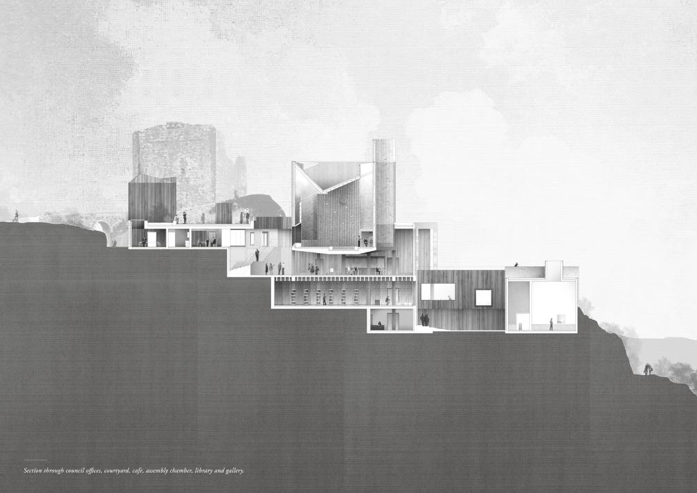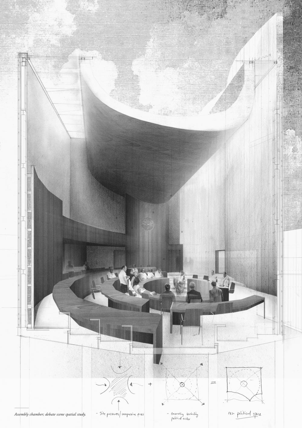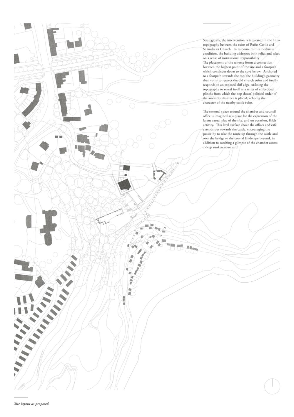 Under Pressure Part 2 Project 2011 Jayesh Mistry University of Nottingham Nottingham | UK A new political institution is a long overdue island meeting place in which dialogue and discussion will be encouraged to develop in. The proposal aims to provide a representative voice for Portland by providing appropriate architectural settings that range from the informal café and landscape; the semi-formal meeting rooms, offices, exhibition spaces and library; and the formal assembly chamber, - the official space of the council chronicler.Portland by nature is inherently independent; its virtual isolation from the mainland ingrains a sense of freedom into its residents. District-level council reform during the 1970’s saw the creation of Weymouth and Portland Borough Council. As a result, Portland’s authoritative role has grown to a point where its autonomy has all but transferred over to the mainland. Whilst some are comfortable with the current political situation, others are more outspoken and believe local decision making policies and community responsibilities should be given back to Portland. The focus of the project deals with the relationship between heavy institutional political order and informal, grass-roots level activism and ‘pressure-group’ organisations. These top-down/bottom-up tensions and political metaphors find architectural translation in the scheme’s massing, programmatic associations, spatial character and tectonic order. The rituals of the grand assembly chamber have an interplay with the table-talk chatter of the café directly beneath; a low, exposed concrete soffit bulging to the domestic warmth of the timber coffee-table and its everyday affairs. This space aims to provide an atmosphere of debate and observation – similar to the tradition of the eighteenth-century coffee house in which pamphlets and political initiatives were routinely formulated. The chamber space itself is a combination of an emanating centrality and pressures drawn from the site; it is seen as an embedded residual fragment, a square volume compressed from active elemental and human agencies that relate to its unfinished context.The institution re-activates a historically saturated site as a place for gathering and debate. The architecture acts as a background that seeks to amplify and materialise the authentic voice of Portland, the future preservation of its culture and traditions, and possibly help towards re-instating power back to the island. Tutor(s) Darren Deane