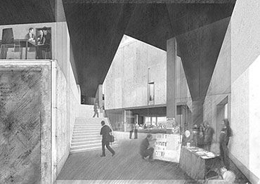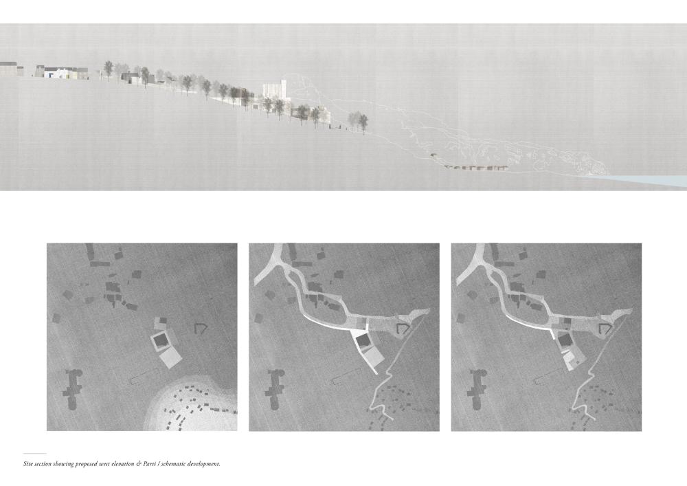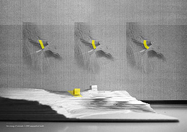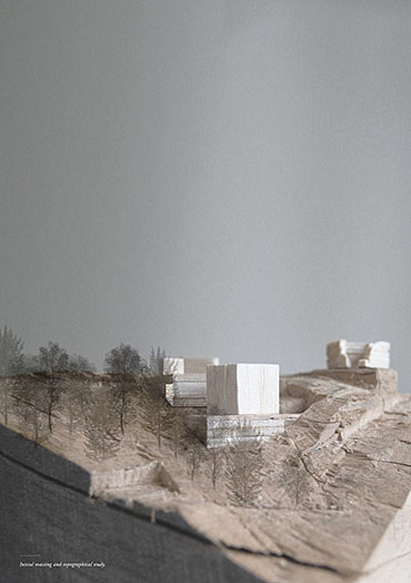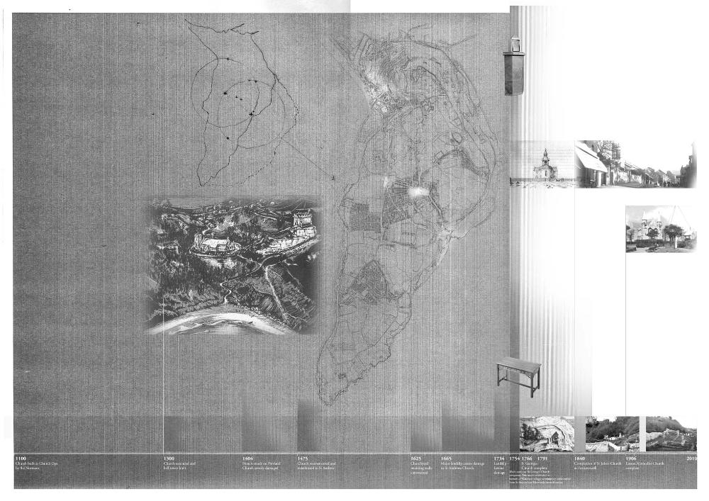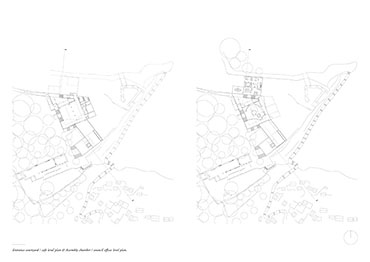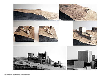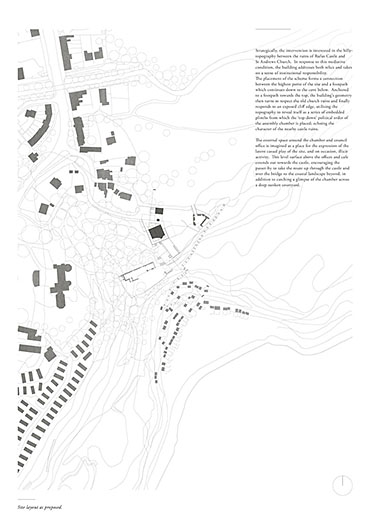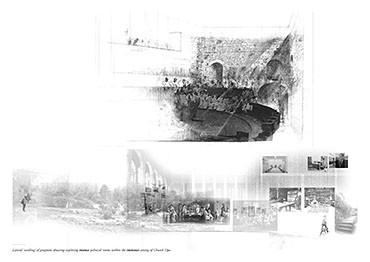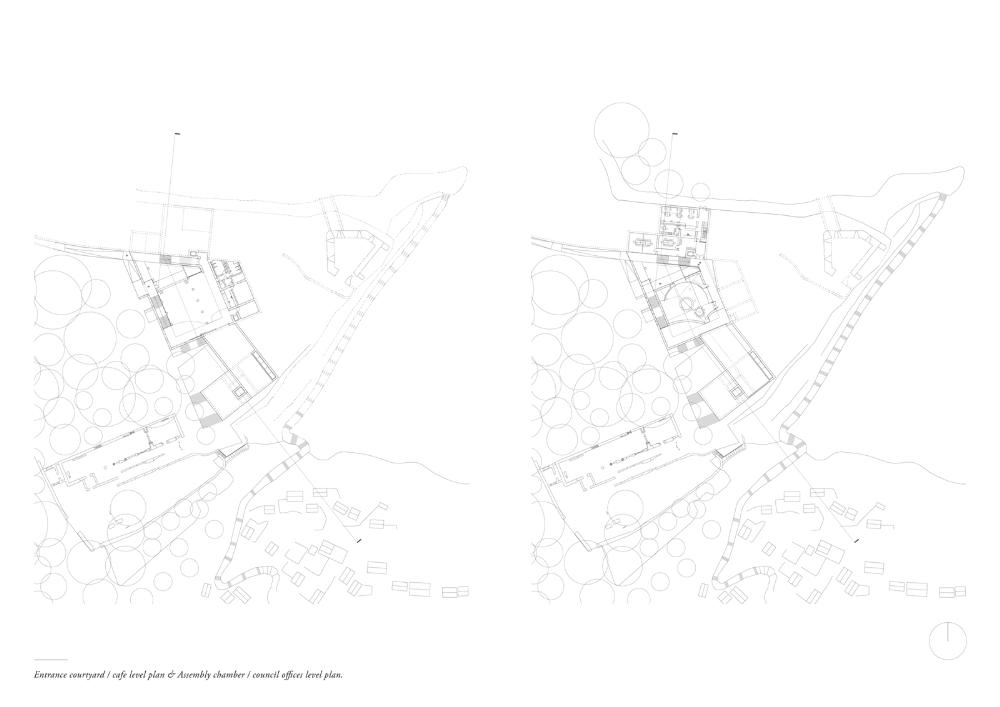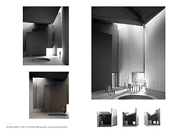 Under Pressure Part 2 Project 2011 Jayesh Mistry University of Nottingham Nottingham | UK A new political institution is a long overdue island meeting place in which dialogue and discussion will be encouraged to develop in. The proposal aims to provide a representative voice for Portland by providing appropriate architectural settings that range from the informal café and landscape; the semi-formal meeting rooms, offices, exhibition spaces and library; and the formal assembly chamber, - the official space of the council chronicler.Portland by nature is inherently independent; its virtual isolation from the mainland ingrains a sense of freedom into its residents. District-level council reform during the 1970’s saw the creation of Weymouth and Portland Borough Council. As a result, Portland’s authoritative role has grown to a point where its autonomy has all but transferred over to the mainland. Whilst some are comfortable with the current political situation, others are more outspoken and believe local decision making policies and community responsibilities should be given back to Portland. The focus of the project deals with the relationship between heavy institutional political order and informal, grass-roots level activism and ‘pressure-group’ organisations. These top-down/bottom-up tensions and political metaphors find architectural translation in the scheme’s massing, programmatic associations, spatial character and tectonic order. The rituals of the grand assembly chamber have an interplay with the table-talk chatter of the café directly beneath; a low, exposed concrete soffit bulging to the domestic warmth of the timber coffee-table and its everyday affairs. This space aims to provide an atmosphere of debate and observation – similar to the tradition of the eighteenth-century coffee house in which pamphlets and political initiatives were routinely formulated. The chamber space itself is a combination of an emanating centrality and pressures drawn from the site; it is seen as an embedded residual fragment, a square volume compressed from active elemental and human agencies that relate to its unfinished context.The institution re-activates a historically saturated site as a place for gathering and debate. The architecture acts as a background that seeks to amplify and materialise the authentic voice of Portland, the future preservation of its culture and traditions, and possibly help towards re-instating power back to the island. Tutor(s) Darren Deane