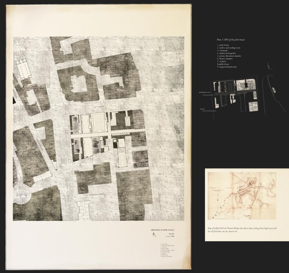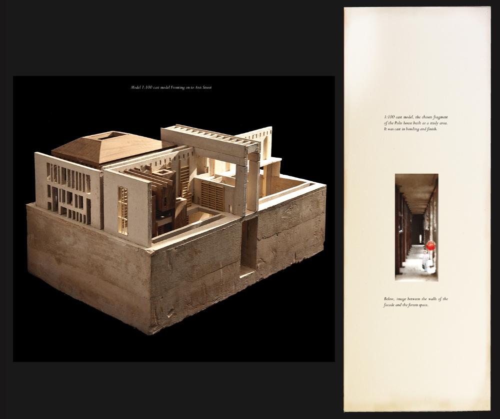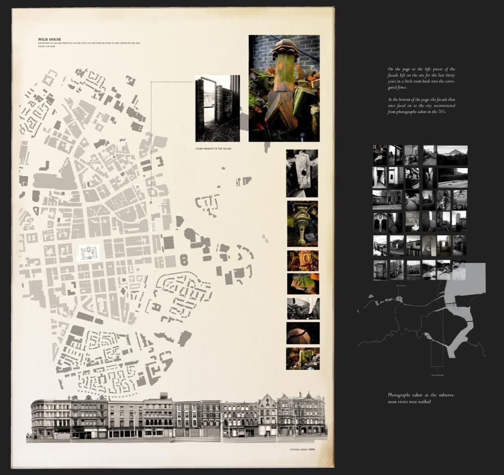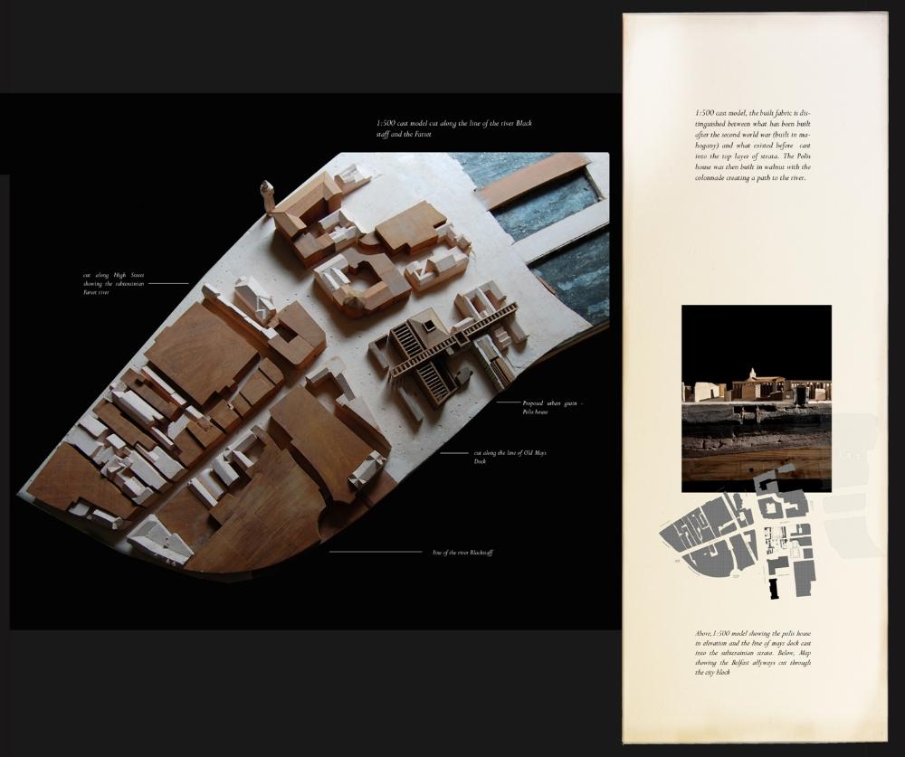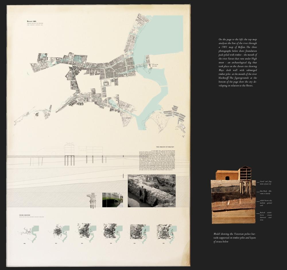 Belfast ‘Polis’ House Part 2 Project 2011 Catherine Blaney Queen's University Belfast | UK In ‘Belfast’ the history is concealed in its name; between two rivers a ‘sandy ford’ was born. As the past courses of these two rivers are walked ancient forests of larch lie just underfoot, preserved in soft mud locally referred to as ‘blue sleech’. In modern-day Belfast the sandbank and the rivers are now illegible but the subterranean rivers formed a framework to study things hidden in the city and the path walked, lead back to the city’s origin. Now along the line of the sandy ford is an inaccessible dismembered city block, concealed behind a corrugated fence. Beyond the fence a Victorian RIC barracks was due to be demolished and a multi-storey car park was to be built in its place. A thesis site was found within the boundaries of what could not be shown on modern maps ‘for security reasons’. Therefore the site came before the brief and the approach to the site was a process of urban design through archaeology; using spoken and physical mnemonics that lay embedded in the urban landscape. People refer locally to the police as ‘the po-lis’ just as much of Belfast history can be found in its name, Another layer of the city can be investigated through the word ‘police’. The entomology of the word police comes from ‘polis’, the ancient Greek word meaning ‘city’ or more specifically ‘a body of citizens’. A new urban grain for Belfast would be a ‘Polis House’, a polemic for a Senate. It becomes place of independent research and inquiry, an archive of public records, where rhetoric can take place along with the recording of anonymous confessions. The Polis House becomes the inverse of Stormont, mending the cities fabric and creating a new urban grain. Its rooms are hidden below street level, it can be wandered in upon and walked through, it is there to serve rather than to be served. Tutor(s) Andrew Clancy