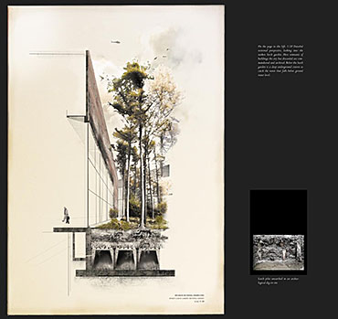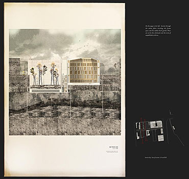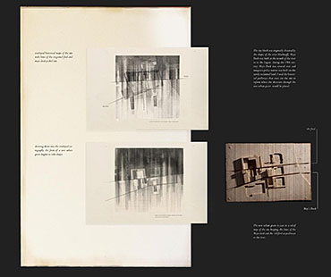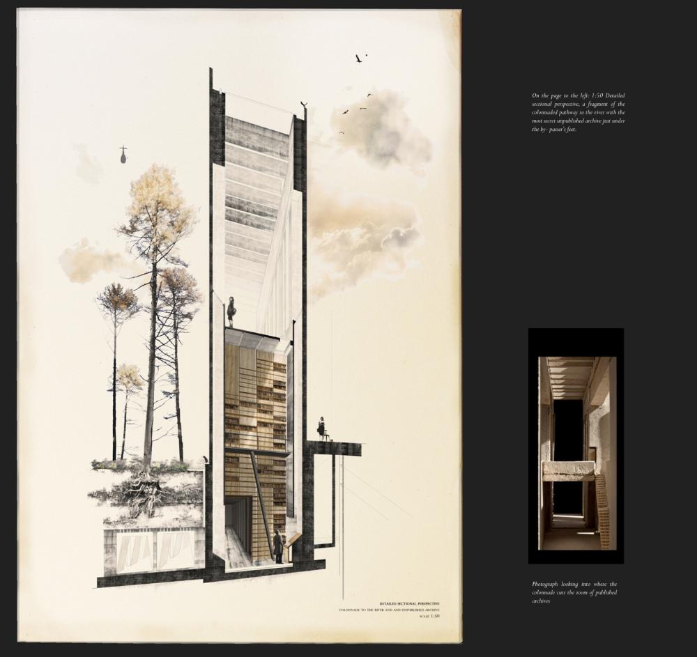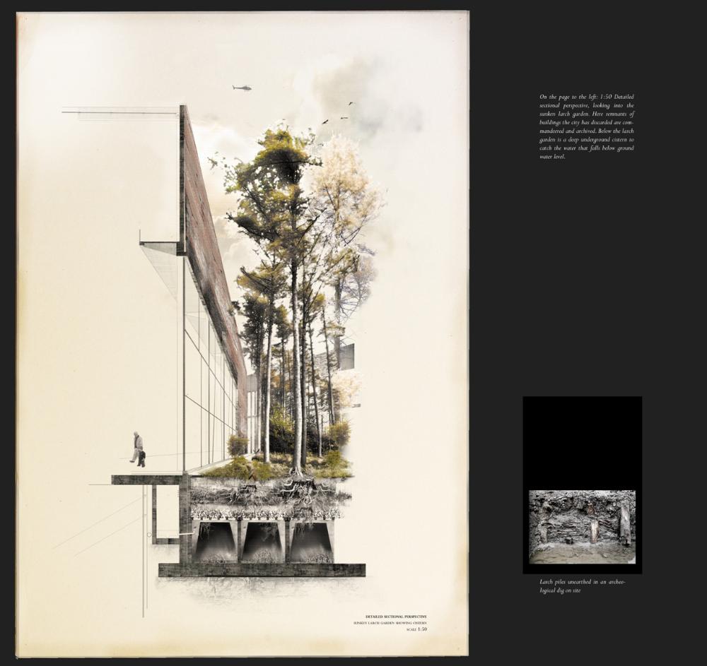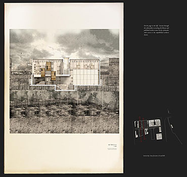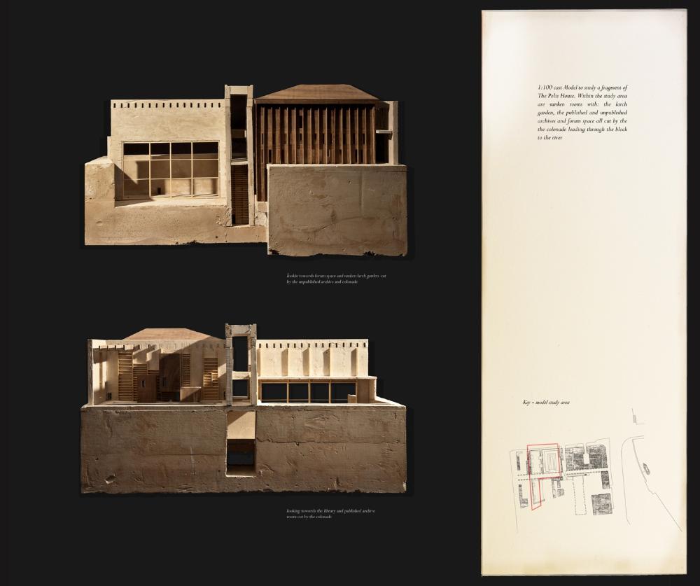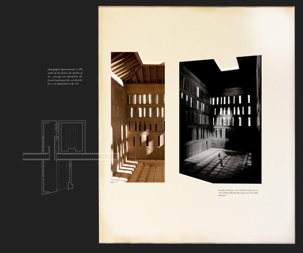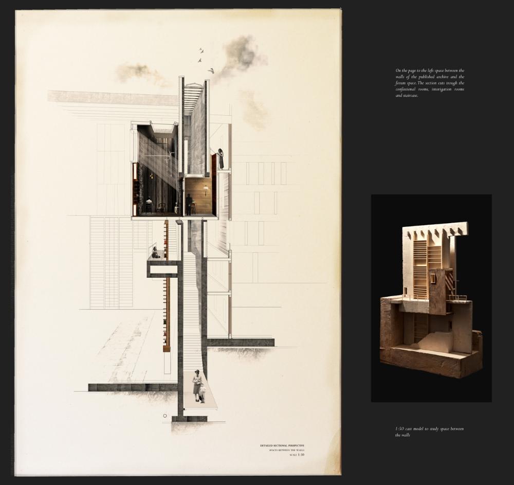 Belfast ‘Polis’ House Part 2 Project 2011 Catherine Blaney Queen's University Belfast | UK In ‘Belfast’ the history is concealed in its name; between two rivers a ‘sandy ford’ was born. As the past courses of these two rivers are walked ancient forests of larch lie just underfoot, preserved in soft mud locally referred to as ‘blue sleech’. In modern-day Belfast the sandbank and the rivers are now illegible but the subterranean rivers formed a framework to study things hidden in the city and the path walked, lead back to the city’s origin. Now along the line of the sandy ford is an inaccessible dismembered city block, concealed behind a corrugated fence. Beyond the fence a Victorian RIC barracks was due to be demolished and a multi-storey car park was to be built in its place. A thesis site was found within the boundaries of what could not be shown on modern maps ‘for security reasons’. Therefore the site came before the brief and the approach to the site was a process of urban design through archaeology; using spoken and physical mnemonics that lay embedded in the urban landscape. People refer locally to the police as ‘the po-lis’ just as much of Belfast history can be found in its name, Another layer of the city can be investigated through the word ‘police’. The entomology of the word police comes from ‘polis’, the ancient Greek word meaning ‘city’ or more specifically ‘a body of citizens’. A new urban grain for Belfast would be a ‘Polis House’, a polemic for a Senate. It becomes place of independent research and inquiry, an archive of public records, where rhetoric can take place along with the recording of anonymous confessions. The Polis House becomes the inverse of Stormont, mending the cities fabric and creating a new urban grain. Its rooms are hidden below street level, it can be wandered in upon and walked through, it is there to serve rather than to be served. Tutor(s) Andrew Clancy