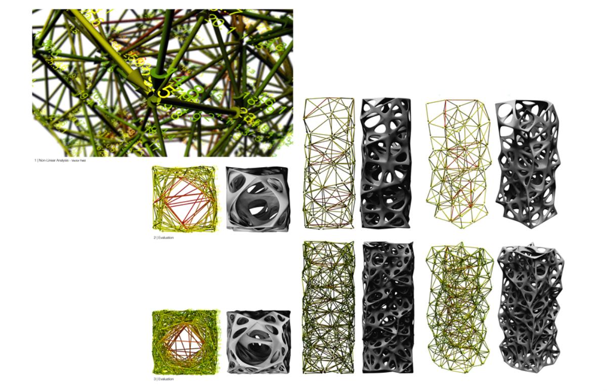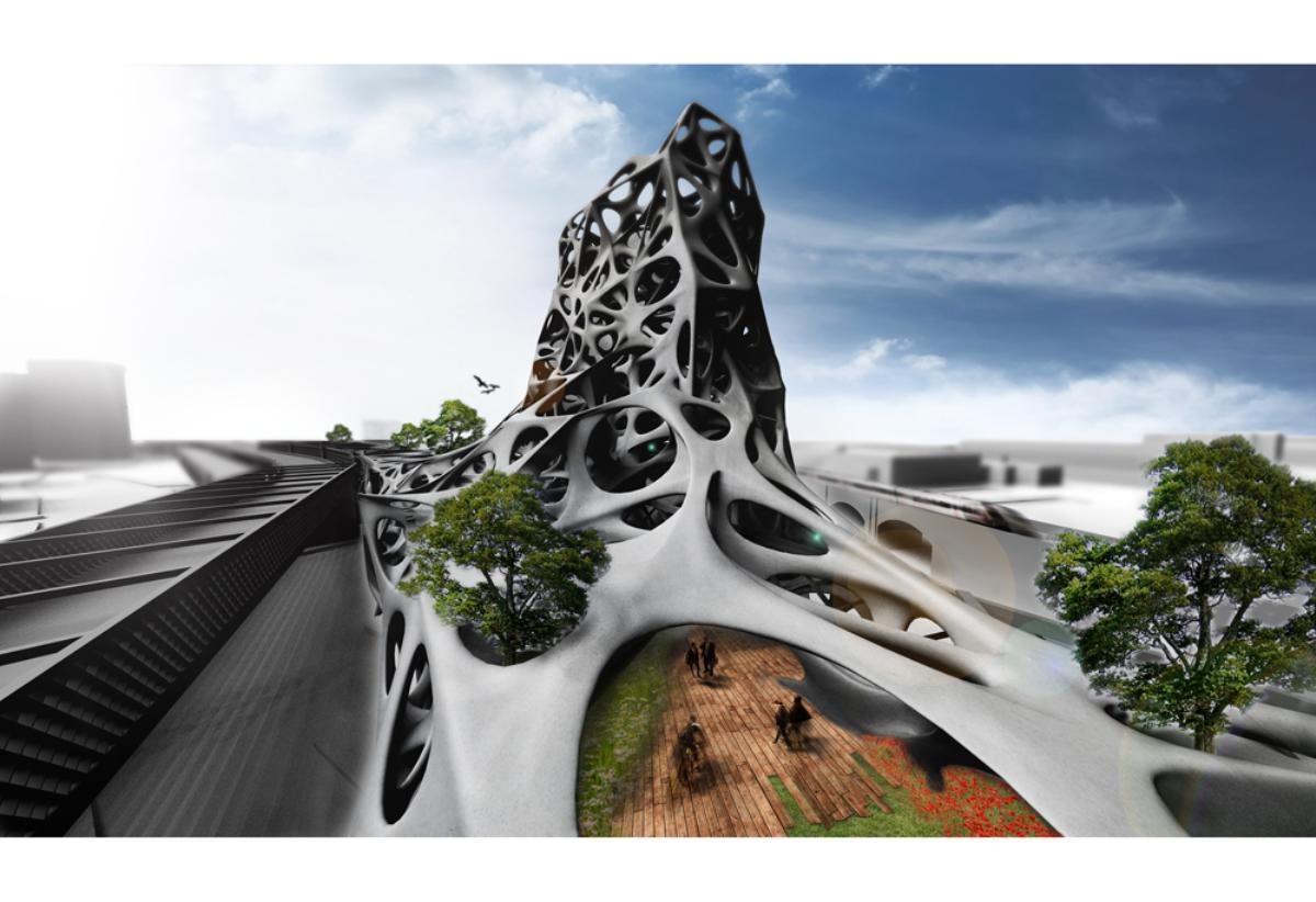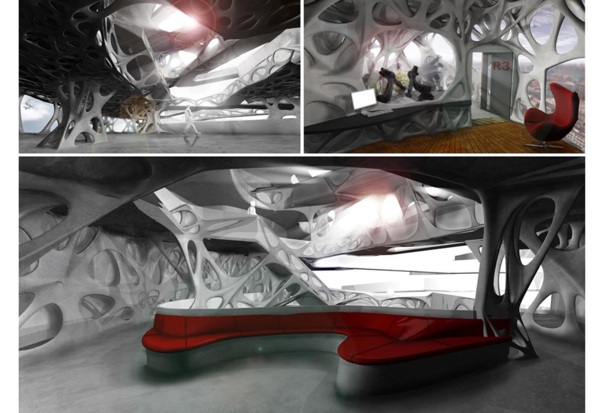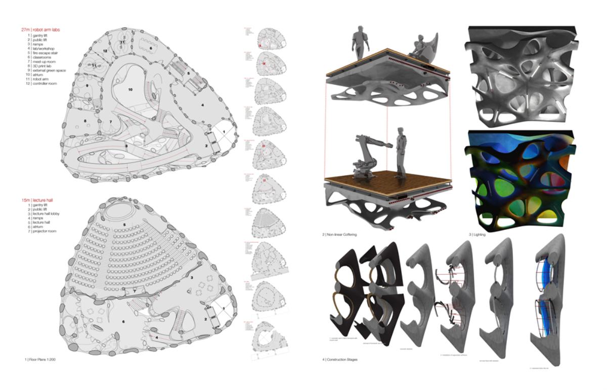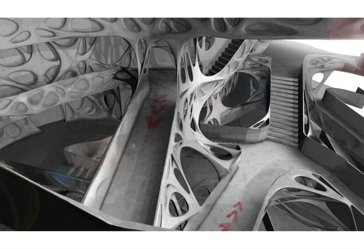 Fabricari Part 2 Project 2012 Nick Tyrer Leeds Beckett University | UK Heinrich Wölfflin recognized tectonics as the particular manifestation of empathy in the field of architecture, it is how as humans we understand buildings, how we measure ourselves against architecture.With contemporary architects shying away from the tectonic act of making and constructing. Investing instead in the image and its rhetoric. Architecture has steered away from construction, almost becoming assembly. The mass production of structure, windows, doors and all type of coverings, limit the architect, creating largely repetitious, homogenous and sterile environments. Assisted by the universal adoption of the free façade, that diverts the tectonic forms of force. Creating surface architecture, where meaningful discourse gives way to strategies of seduction, and architectural design is reduced to superficial play of empty, seductive forms. My intention was to research mass-customised fabrication techniques, as a driver to develop an architecture that recognizes the importance of structural forces and material composition. The project began with the creation and development of many different systems, each as an advancement or response to different parameters.Fabric formed concrete was chosen to develop after identifying the current limitations with using rigid formwork. Starting by simulating tension to generate accurate formwork, casting plaster prototypes at each stage to test limitations and precision. Generating a structural skeleton based on biomimetic principles, and optimising the final structure according to local optima. The program embodies the polemic of my thesis, creating a Fabrication Institute situated in Castlefield. Uniting Castefield’s unique heritage as the cradle of the Industrial Revolution and Mass Production with Manchester’s Computational Innovation. It will now become home to the new computational revolution, mass customized fabrication and construction.The resultant design is a monolithic non-linear network of concrete branches and slabs. Scars of the construction process are implicit in the surface of the building. The internal forces of the concrete manifest themselves in the fluid massing of the surface. Walkways and ramps meander through the building, creating spaces for spontaneous interaction and collaboration with other Institute users. A rich variation of details, texture, light and spaces forge a holistic sensory experience and create awareness of the role of tectonics in architecture. Tutor(s) Keith Andrews